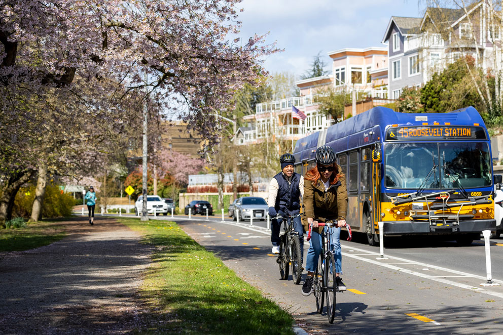 Metro’s service guidelines emphasize equity, productivity and land use in identifying areas for increased transit service. Our Transit-Oriented Communities Program creates sustainable communities that reduce the need to drive and increase access to affordable housing. Investments in transit service that carries many and runs often—matched with equitable land use—offer the greatest potential for emissions reductions, supporting the goals outlined in the King County Strategic Climate Action Plan.