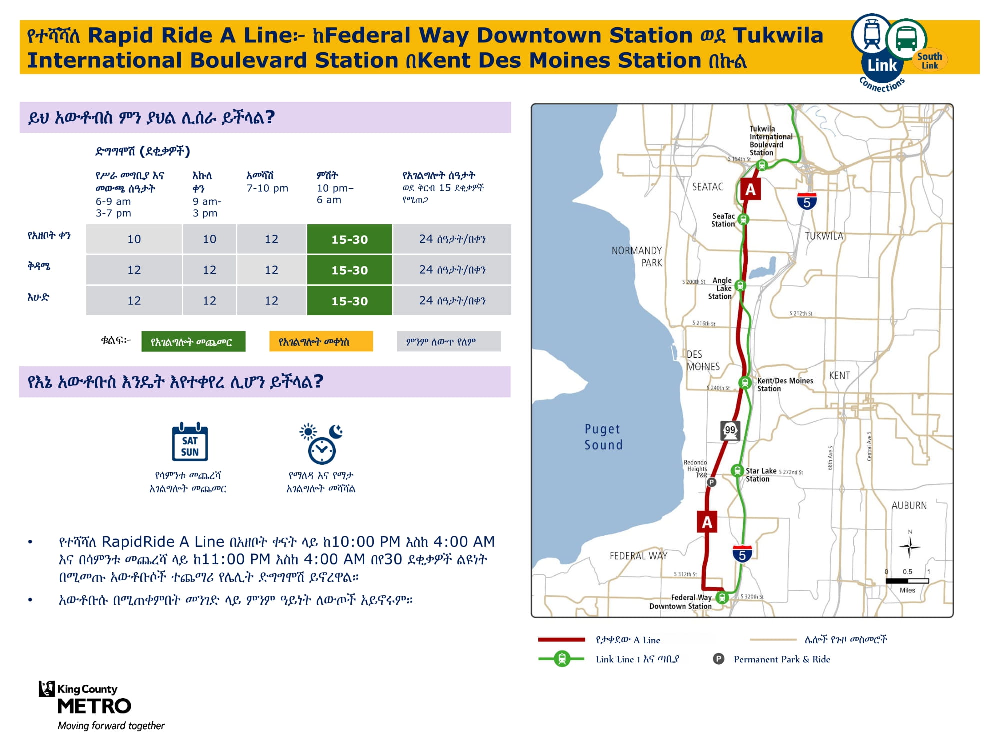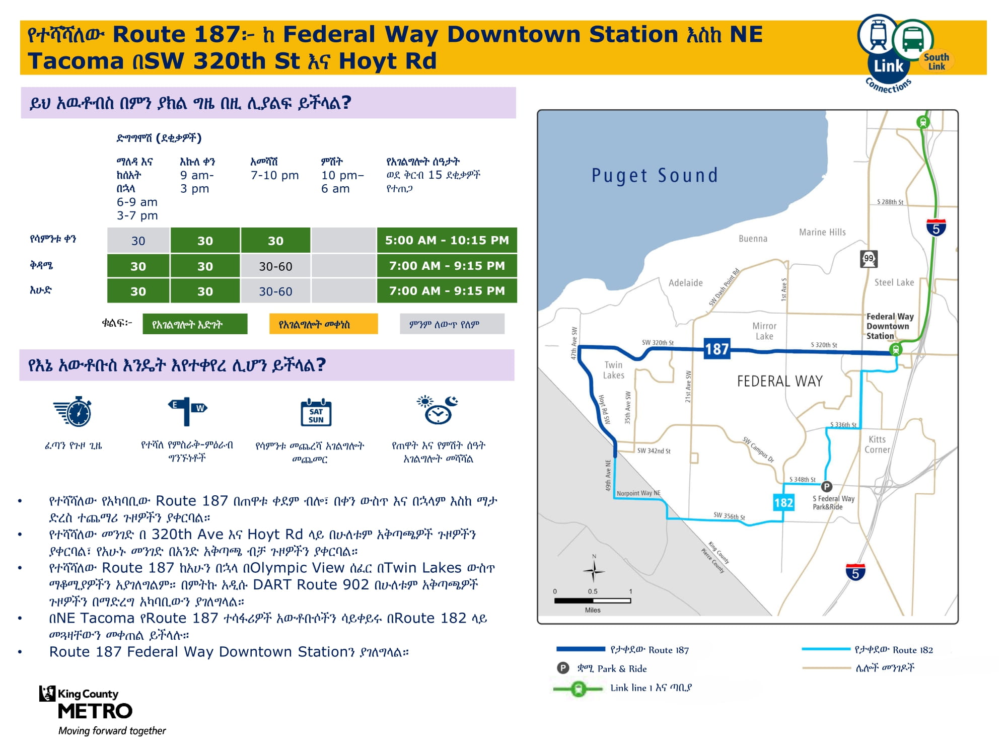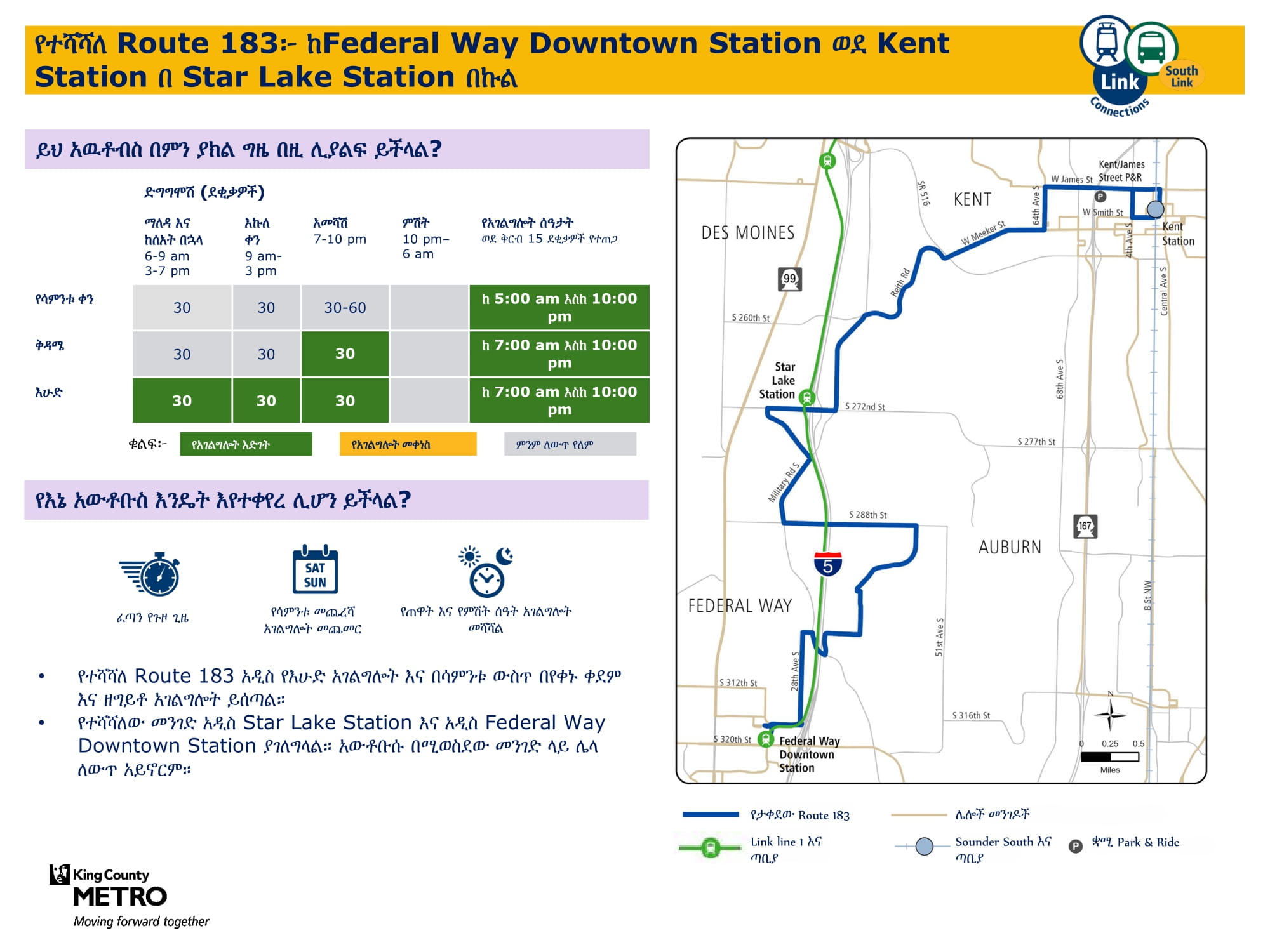 የተሻሻለ አዲስ የእሁድ አገልግሎት እና በስራና በቅዳሜ ቀናቶች ላይ ተጨማሪ ጉዞዎችን ማቅረብ። ከLink ቀላል ባቡር ጋር በFederal Way Downtown እና Star Lake ጣቢያዎች ይገናኛል። |