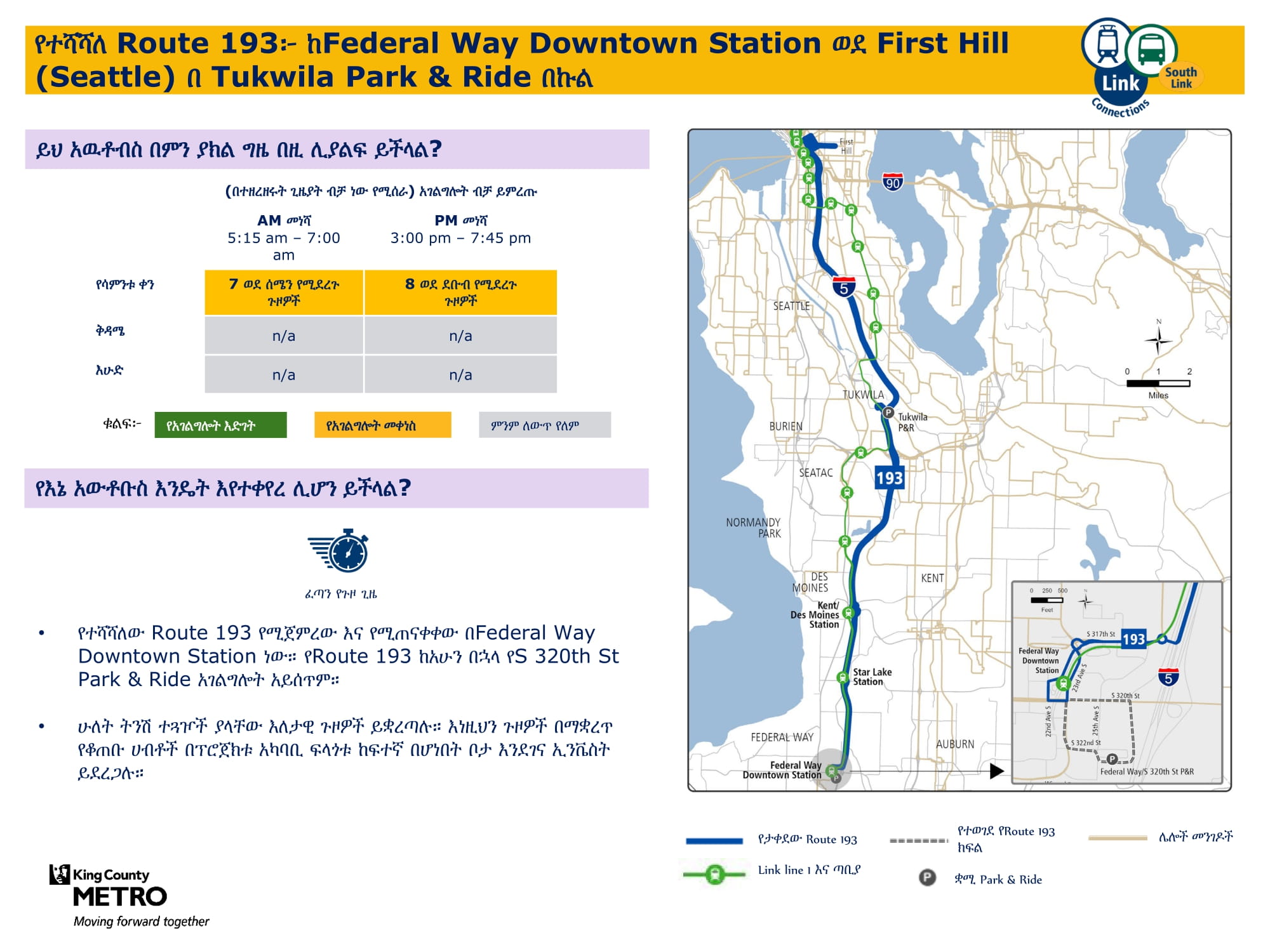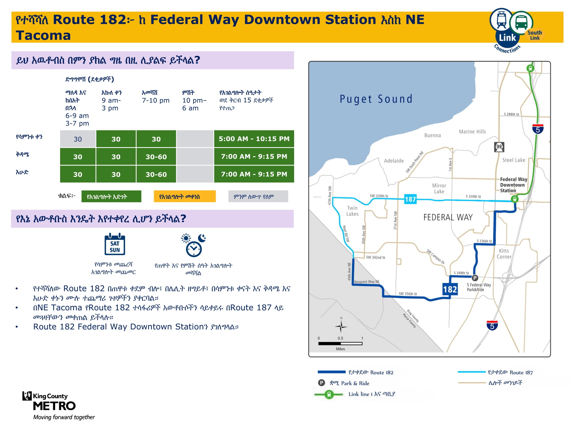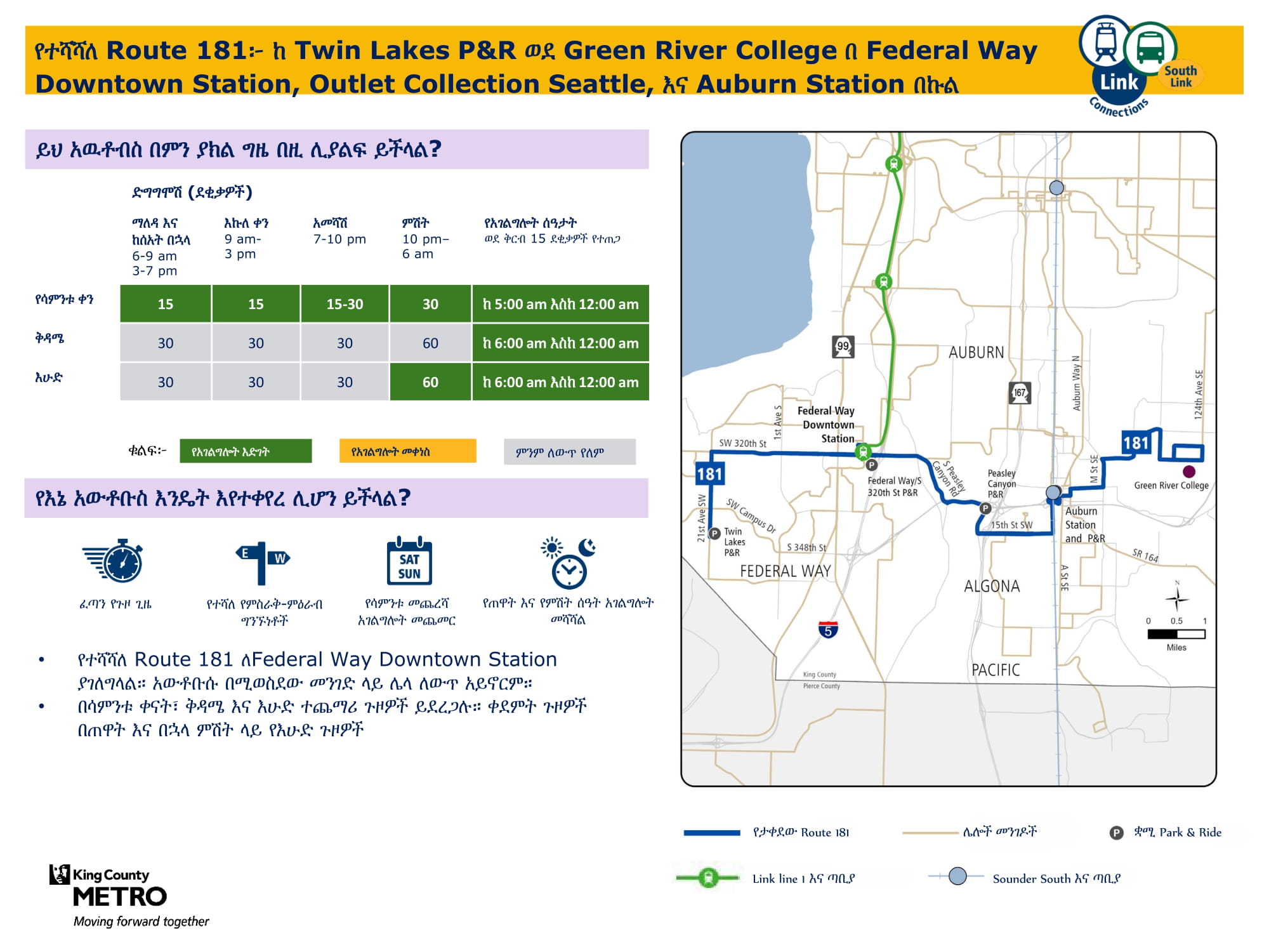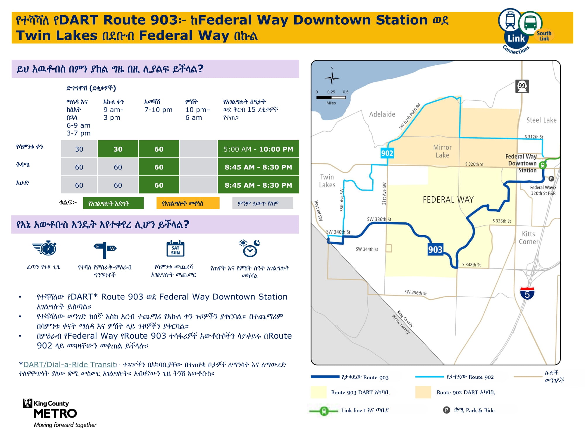 የተሻሻለ አዲስ የእሁድ አገልግሎት እና በስራና በቅዳሜ ቀናቶች ላይ ተጨማሪ ጉዞዎችን ማቅረብ። ከLink ቀላል ባቡር ጋር በFederal Way Downtown እና Star Lake ጣቢያዎች ይገናኛል። |