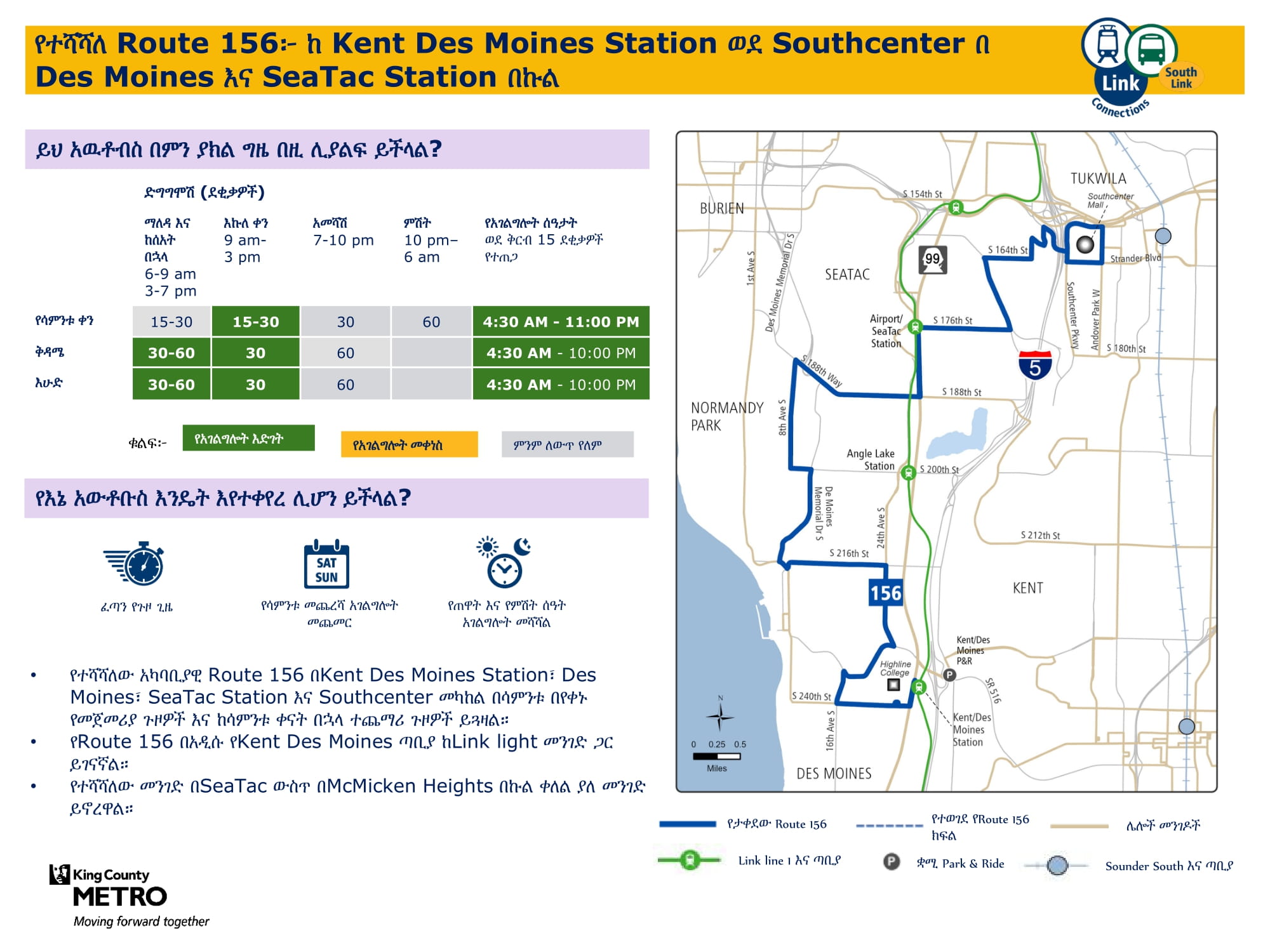 በየሳምንቱ በየቀኑ በሚደረጉ ጉዞዎችን ማሻሻል። ከLink ቀላል ባቡር ጋር በ Kent Des Moines ጣቢያ ይገናኛል እና በ McMicken Heights በኩል የበለጠ ቀጥተኛ መንገድ ይኖረዋል። |
