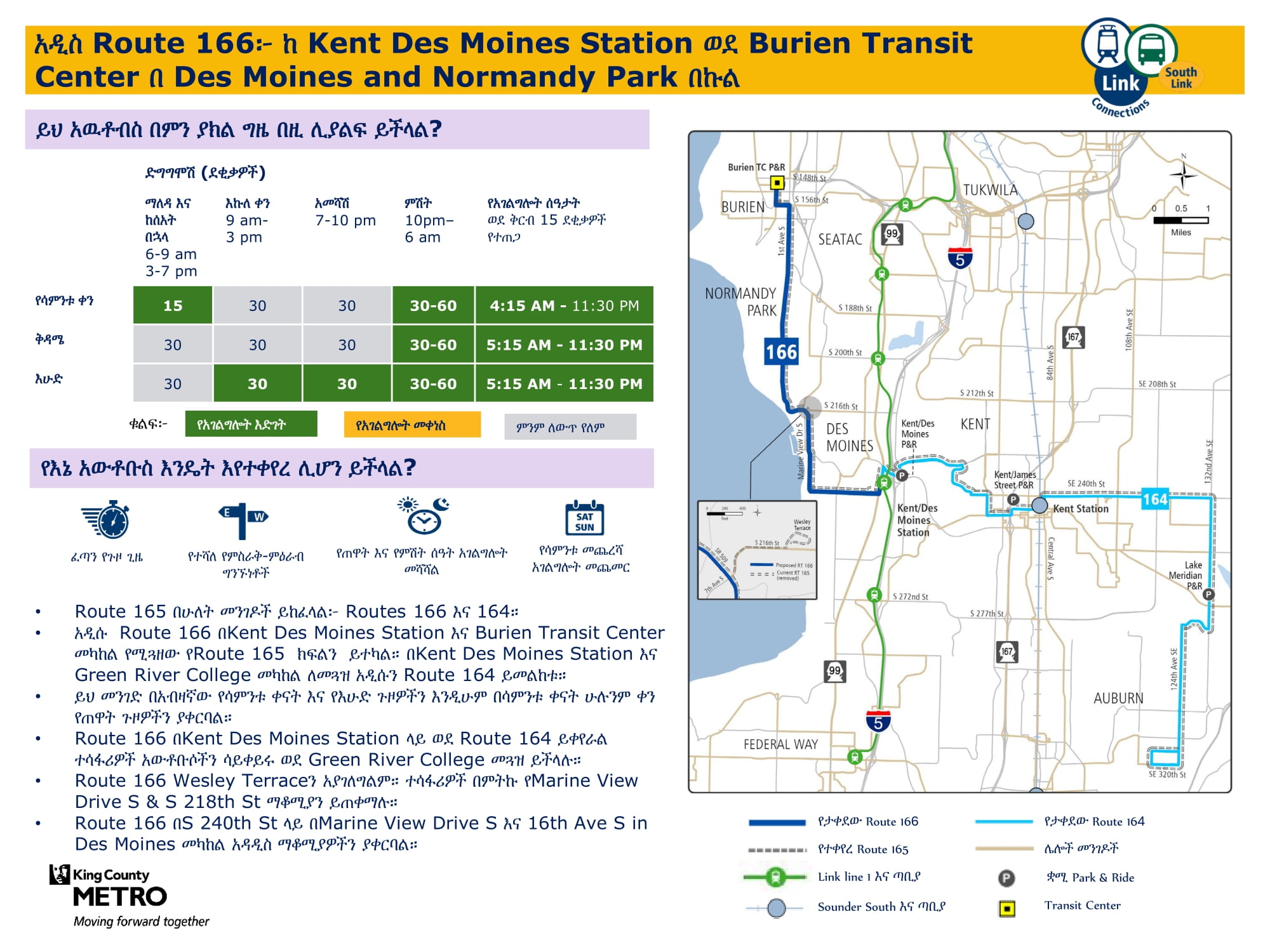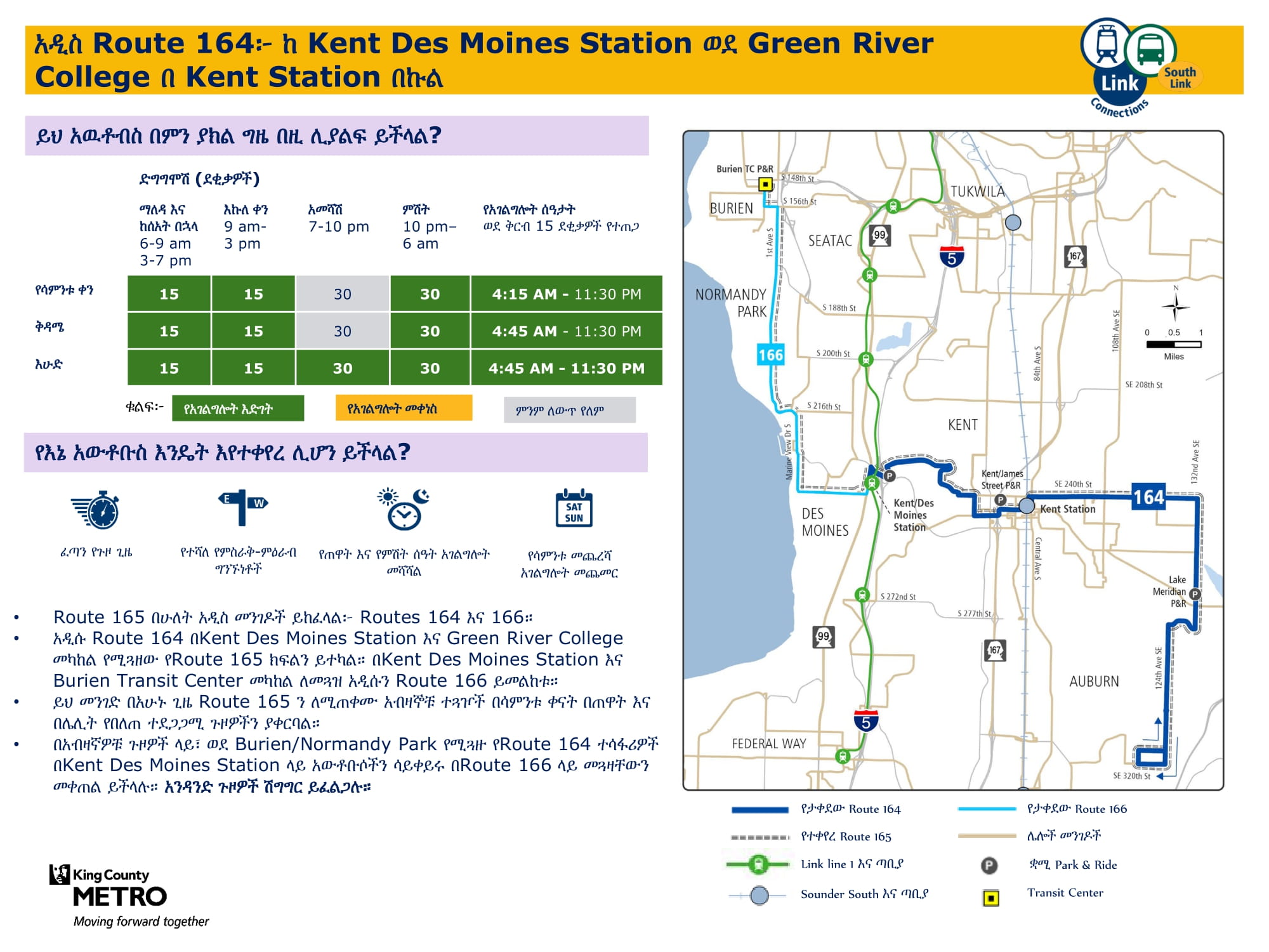 አዲስ ተደጋጋሚ መስመር ከተጨማሪ ጉዞዎች ጋር በየሳምንቱ ማቅረብ። የመንገድ 165 ክፍልን ይተካል። በ Kent Des Moines ጣቢያ ላይ ከLink ቀላል ባቡር ጋር ይገናኛል። አንዳንድ ጉዞዎች ከKent Des Moines ጣቢያ በላይ ለሚጓዙ አሽከርካሪዎች የ166 ጉዞዎች ይሆናሉ። የመንገዶች 164 እና 166 እንዴት እንደሚሰሩ ይመልከቱ |