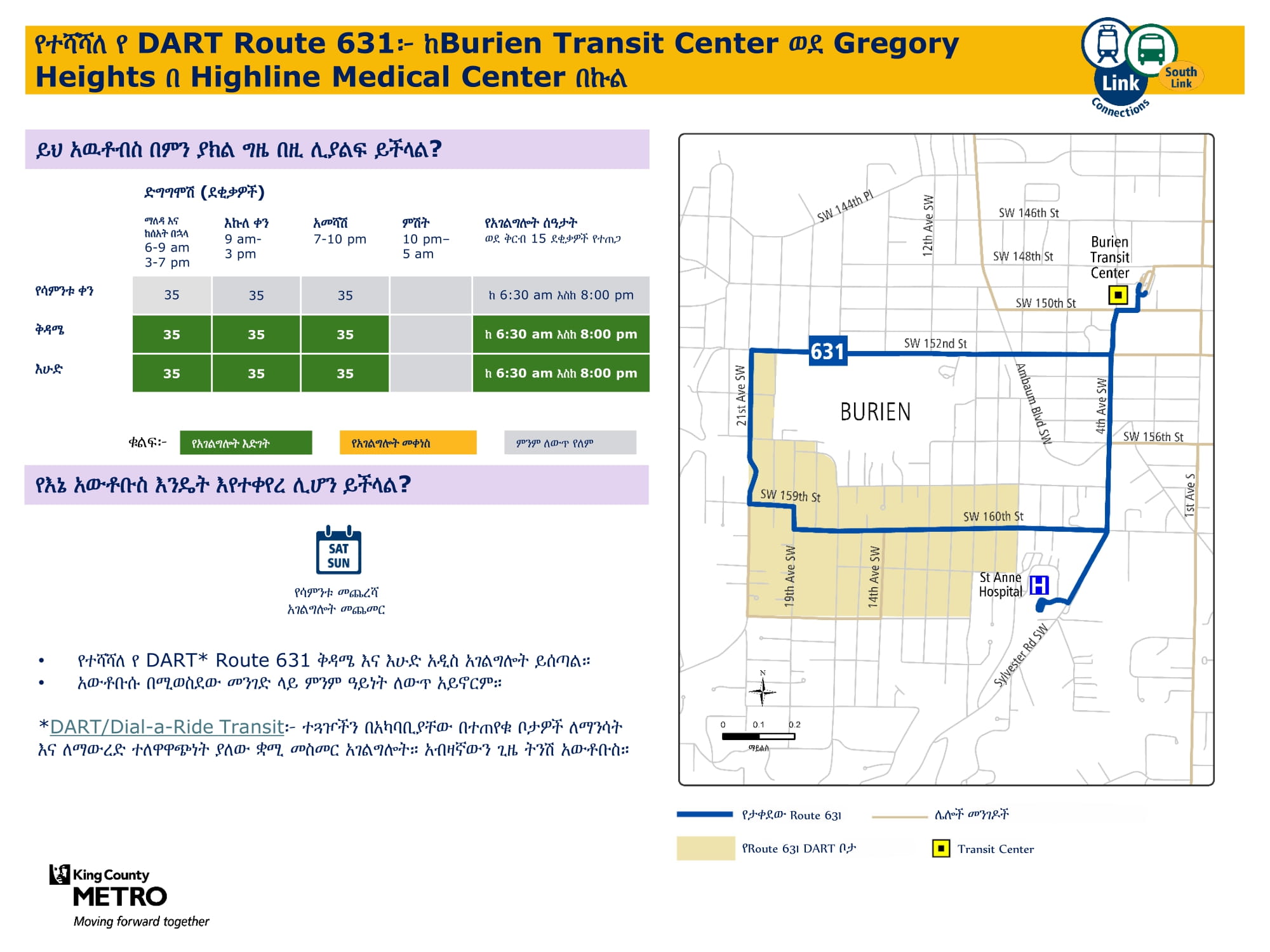 ከBurien Transit Center ወደ Gregory Heights በ Highline Medical Center በኩል በአዲሱ የሳምንቱ መጨረሻ አገልግሎት ተሻሽሏል። |