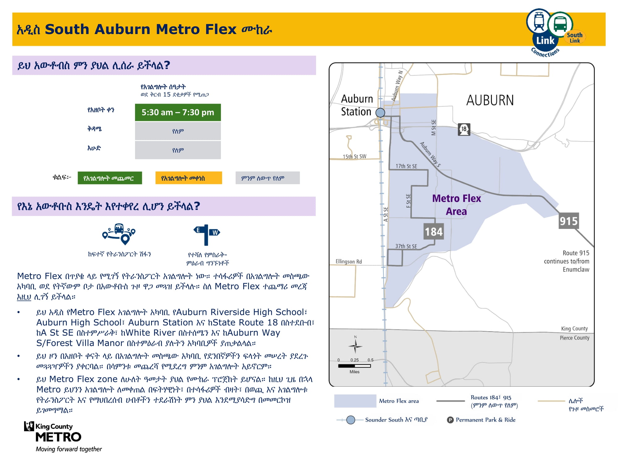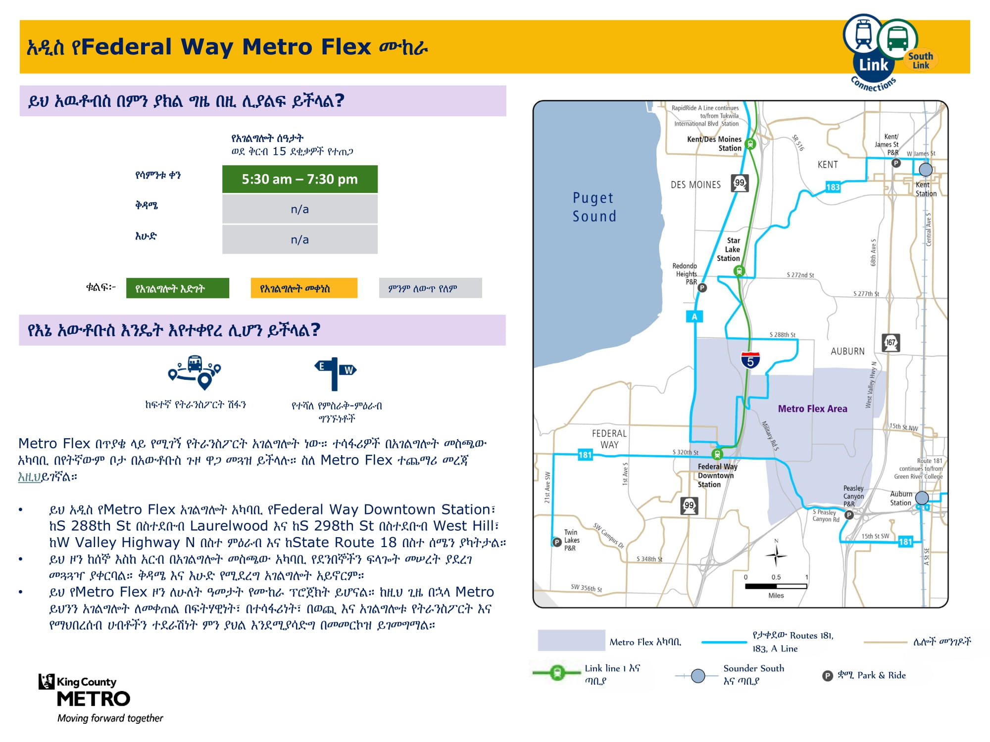 | Federal Way Metro Flex ሙከራ Federal Wayን፣ Auburnን ያገለግላል | አዲስ የMetro Flex የሙከራ ዞን ከሰኞ እስከ ቅዳሜ ድረስ በጥያቄ ላይ ያለ አገልግሎት ይሰጣል። የFederal Way Downtown Stationን፣ ከS 288th Street በስተደቡብ Laurelwood እና ከS 298th St በስተደቡብ West Hill፣ ከW Valley Highway Nን በስተ ምዕራብ እና ከState Route 18 ን በስተ ሰሜን ያገለግላል። |