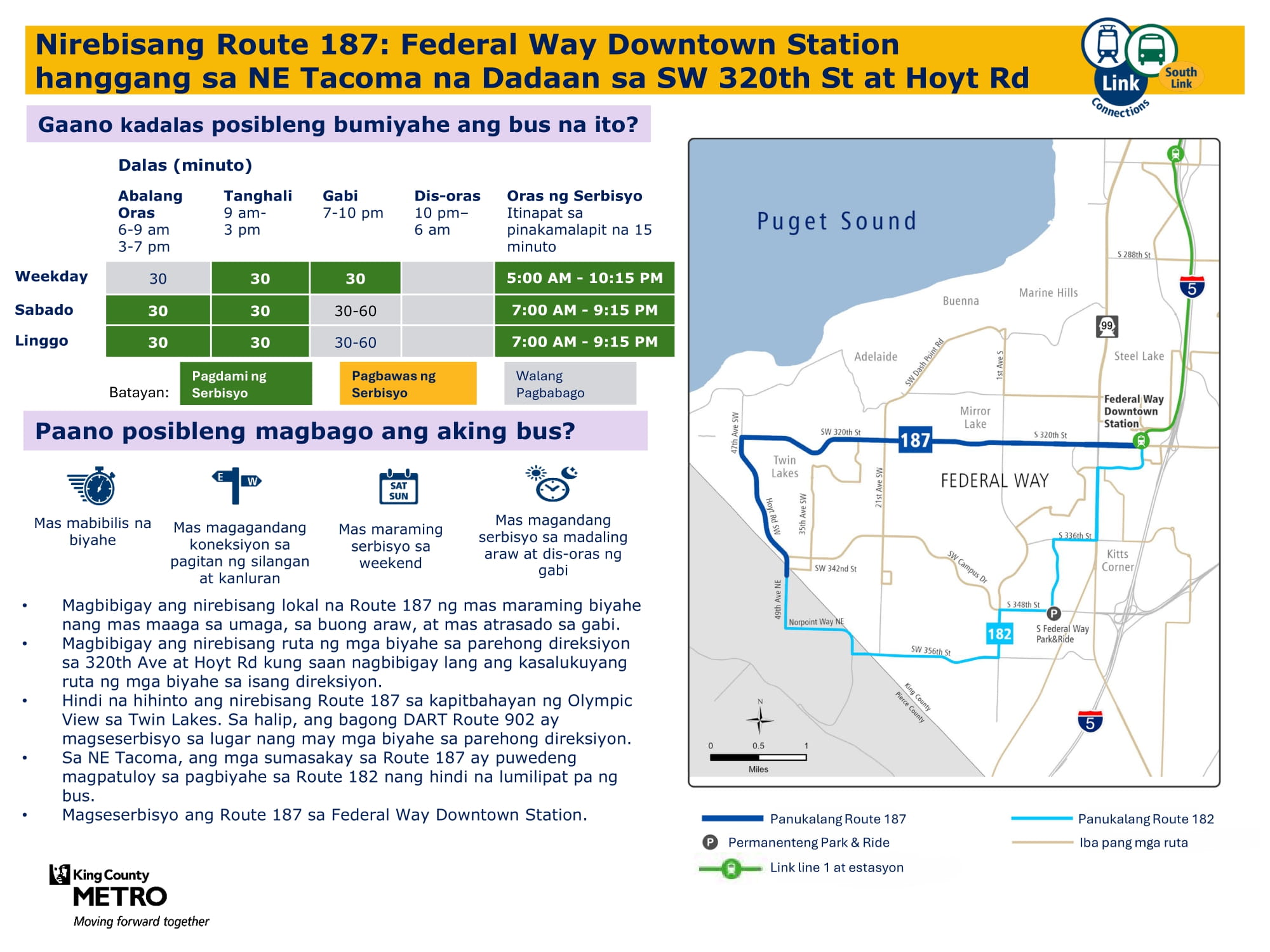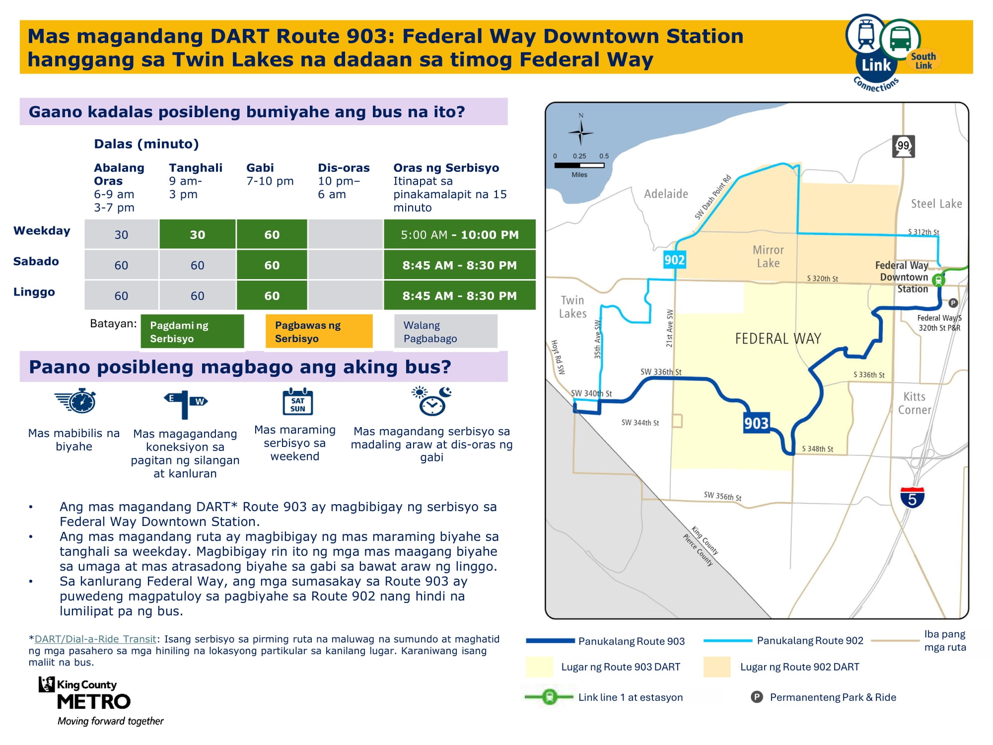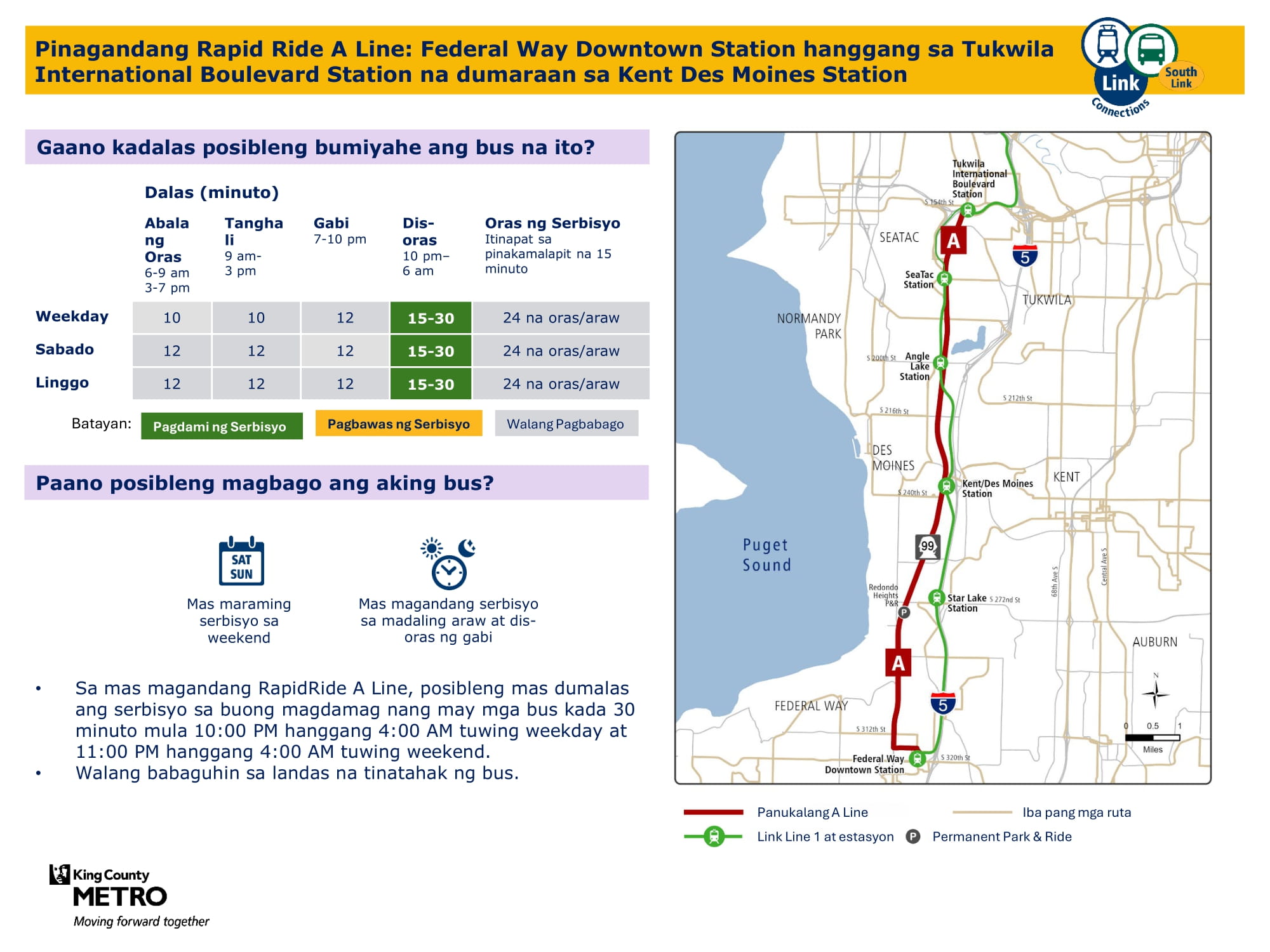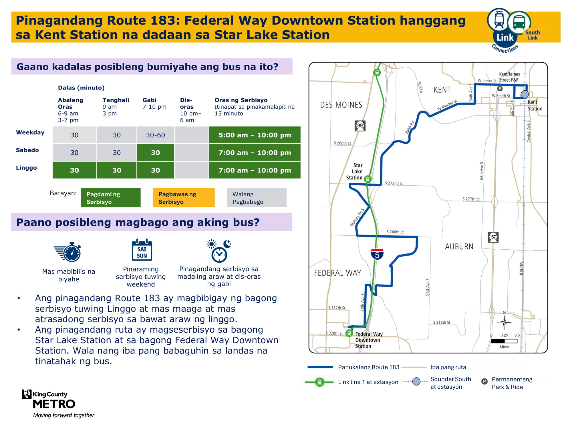 Pinahusay na may bagong serbisyo tuwing Linggo at mas maraming biyahe tuwing weekday at Sabado. Magkakaroon ng koneksiyon sa Link light rail sa Federal Way Downtown at Star Lake Stations.