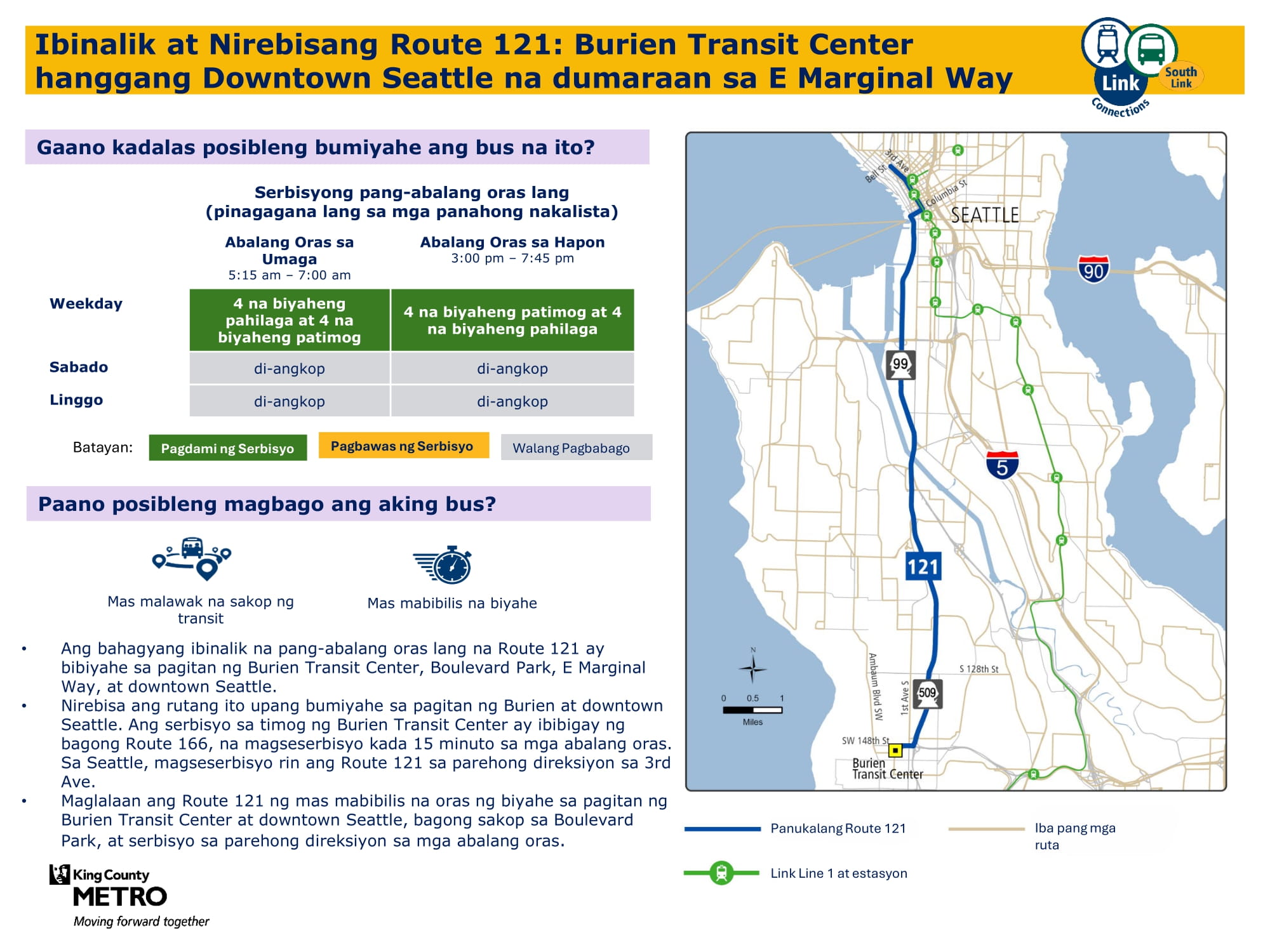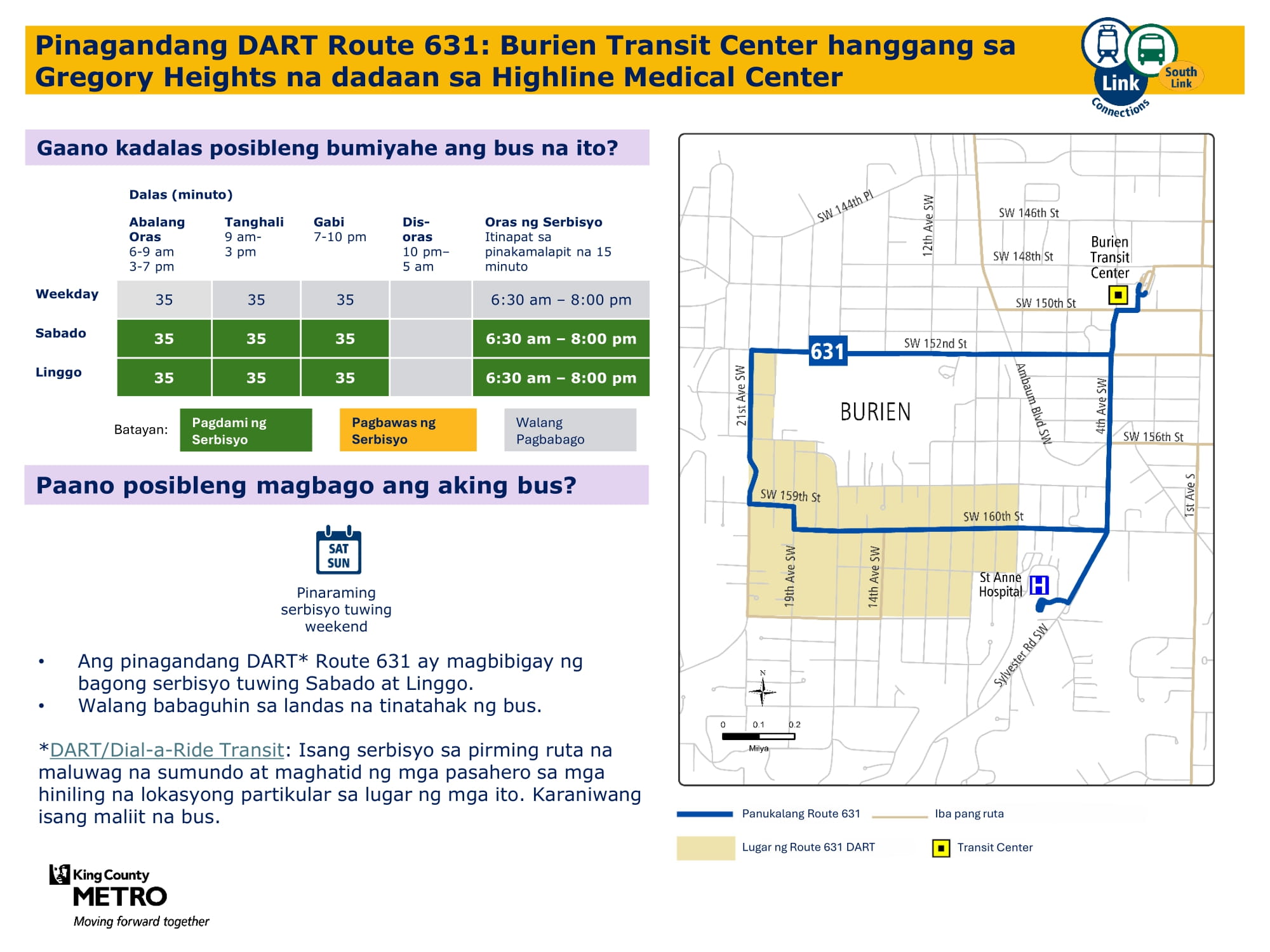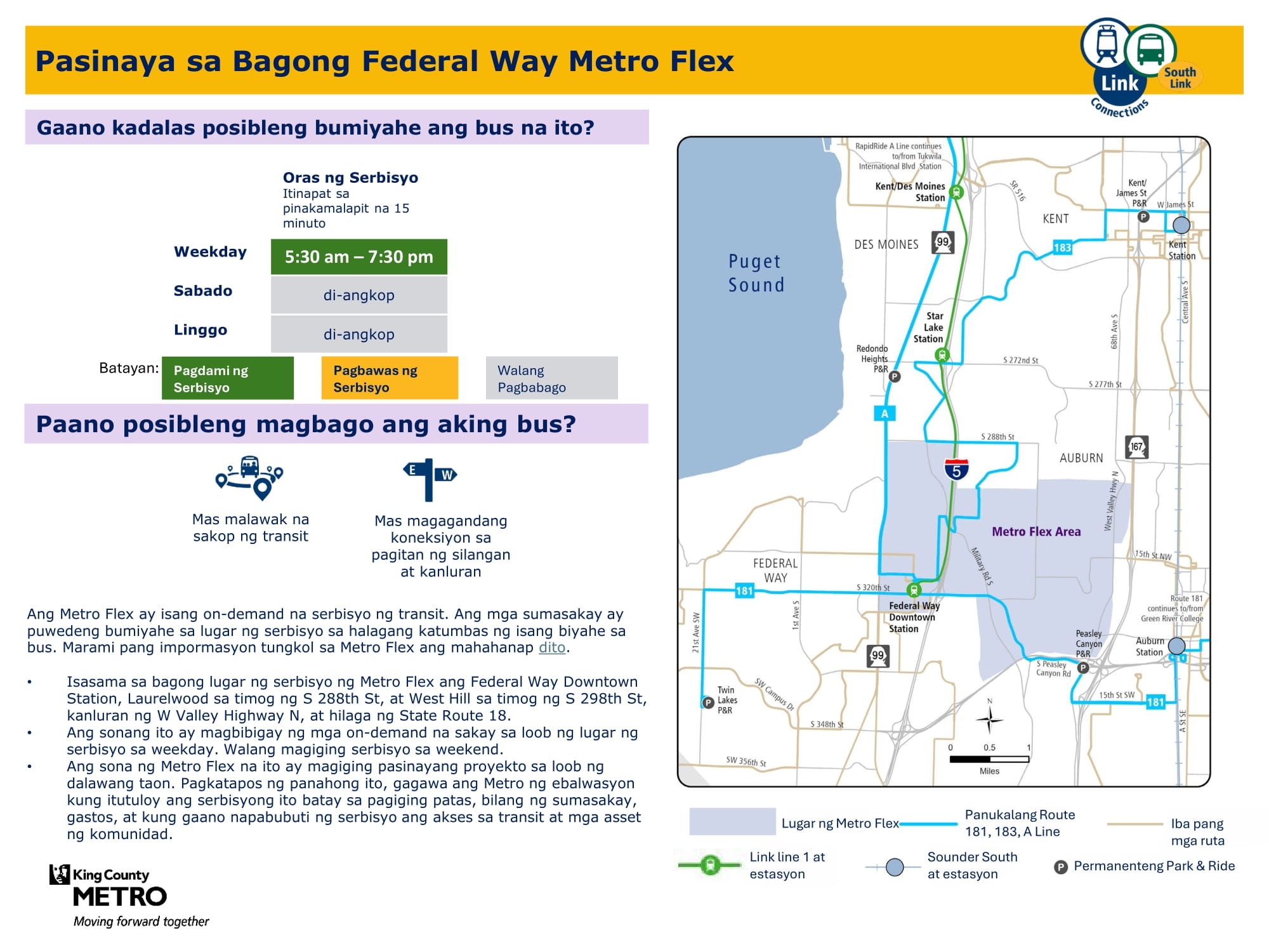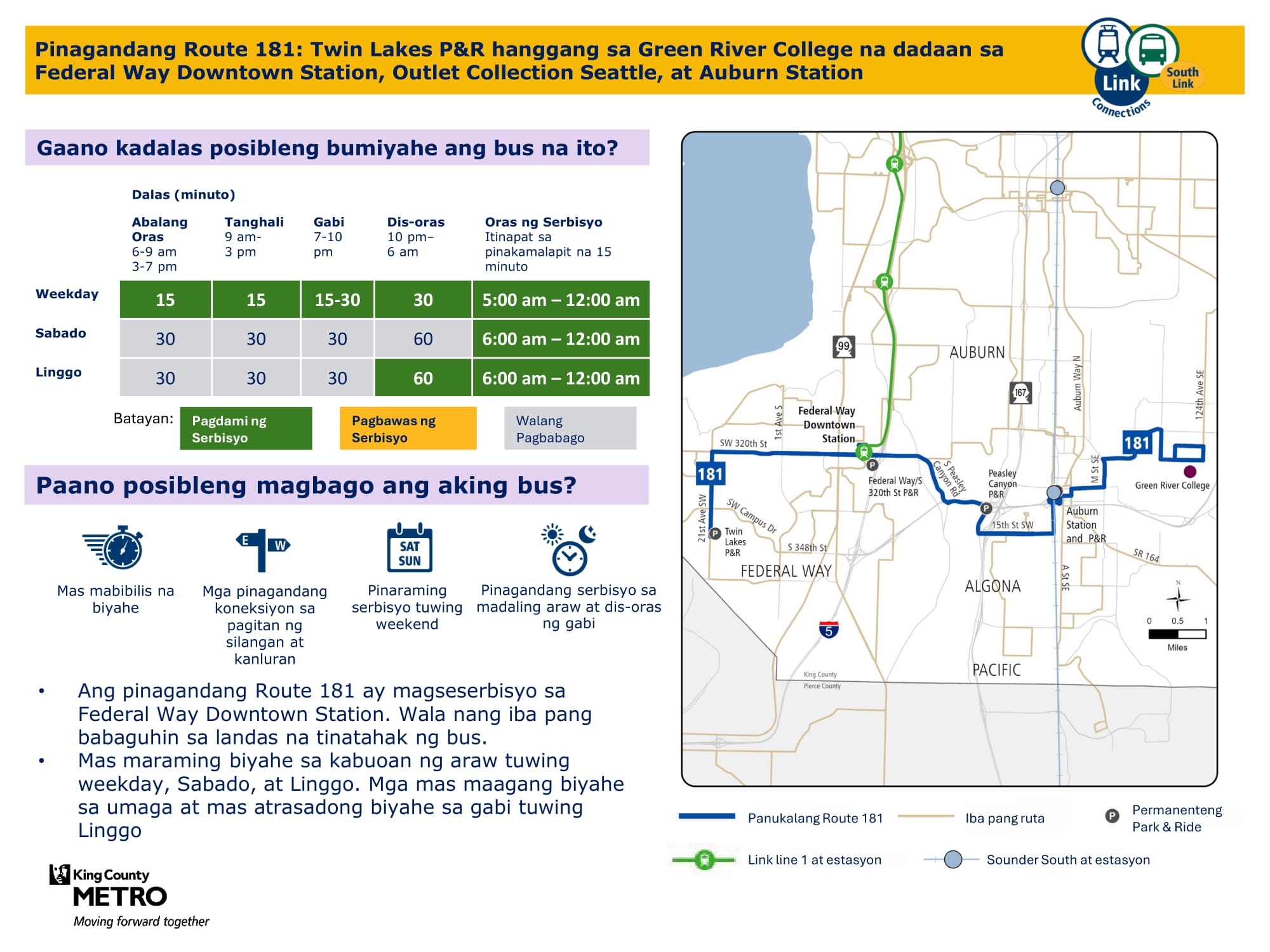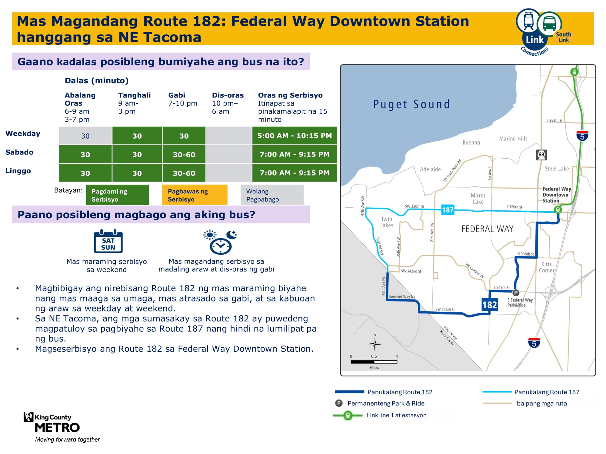 Pinahusay na may bagong serbisyo tuwing Linggo at mas maraming biyahe tuwing weekday at Sabado. Magkakaroon ng koneksiyon sa Link light rail sa Federal Way Downtown at Star Lake Stations.