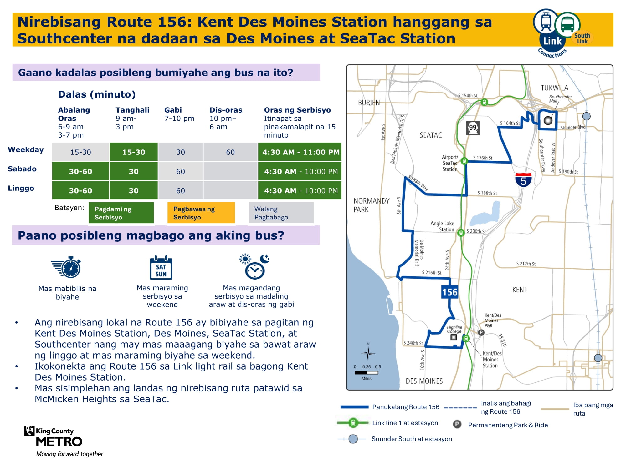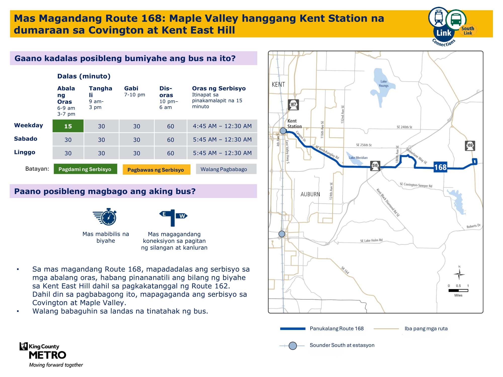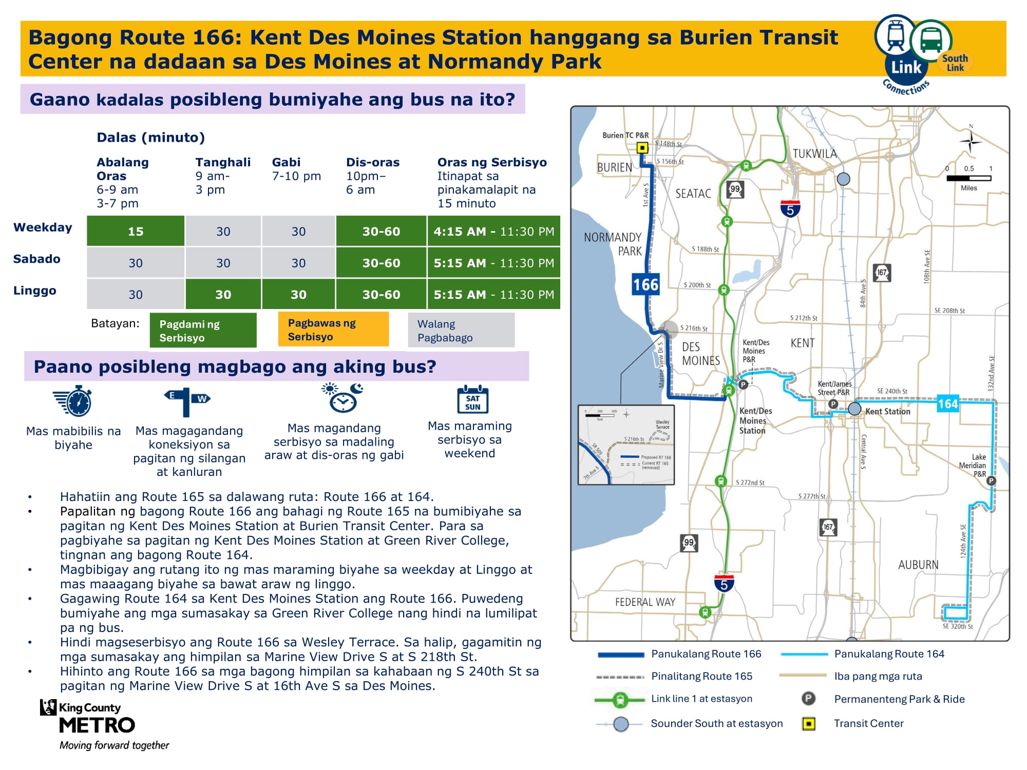 Bagong madalas na ruta na may mas maraming biyahe bawat araw ng linggo. Pinalitan ang bahagi ng Ruta 165. Magkakaroon ng koneksiyon sa Link light rail sa Kent Des Moines Station. Ang ilang biyahe ay magiging mga biyahe ng Route 166 para sa mga pasaherong bumibiyahe lampas sa Kent Des Moines Station.