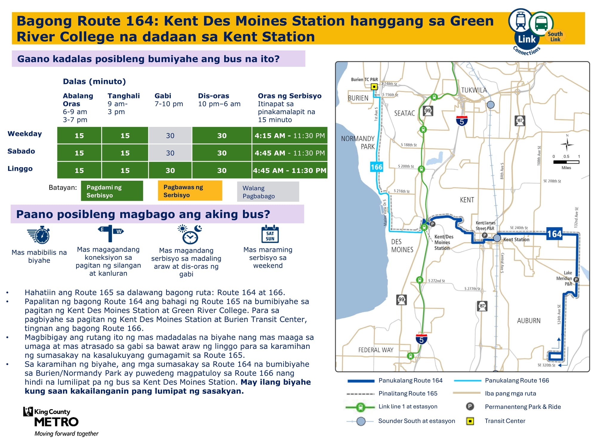 Bagong lokal na ruta na may mas maraming biyahe bawat araw ng linggo. Pinalitan ang bahagi ng Route 165. Magkakaroon ng koneksiyon sa Link light rail sa Kent Des Moines Station. Lahat ng biyahe ay magiging mga biyahe ng Route 164 para sa mga pasaherong bumibiyahe lampas sa Kent Des Moines Station.