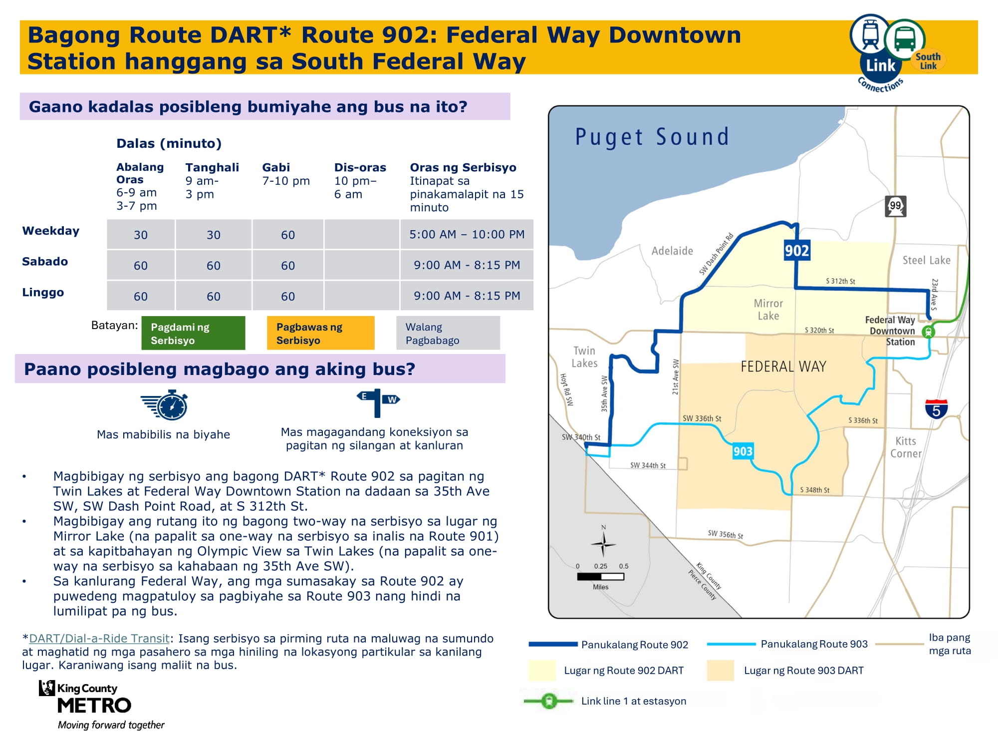 Bagong ruta ng DART. Bahagyang pinapalitan ang DART 901 ng mas maraming biyahe bawat araw ng linggo. Magkakaroon ng koneksiyon sa Link light rail sa Federal Way Downtown Station.