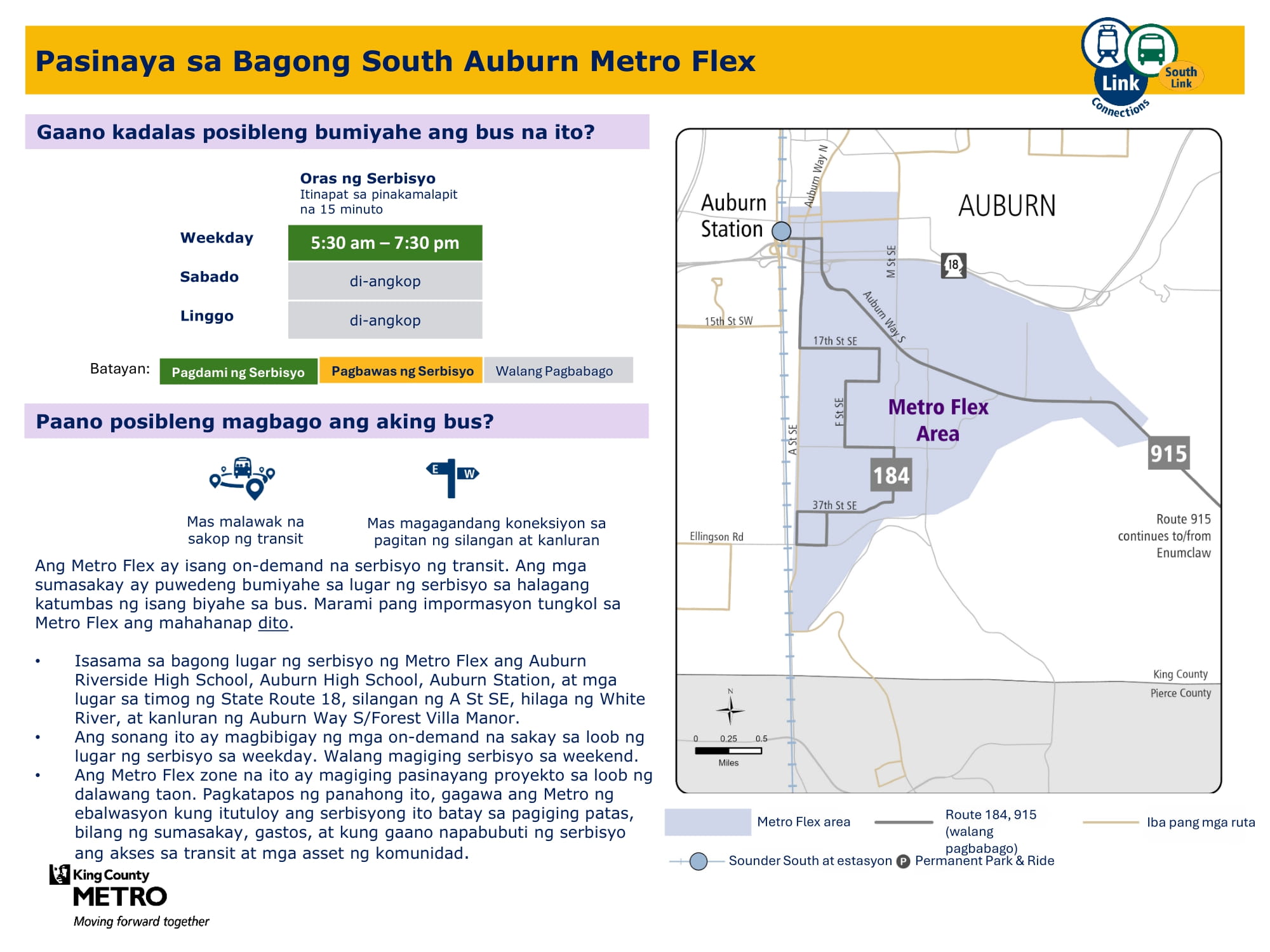 Bagong pilot zone ng Metro Flex na nagbibigay ng on-demand na serbisyo mula Lunes hanggang Biyernes. Nagbibigay ng serbisyo sa mga lugar sa timog ng State Route 18, silangan ng A Street SE, hilaga ng White River at kanluran ng Auburn Way S/Forest Villa Manor. Kasama ang Auburn Station at Riverside High School.