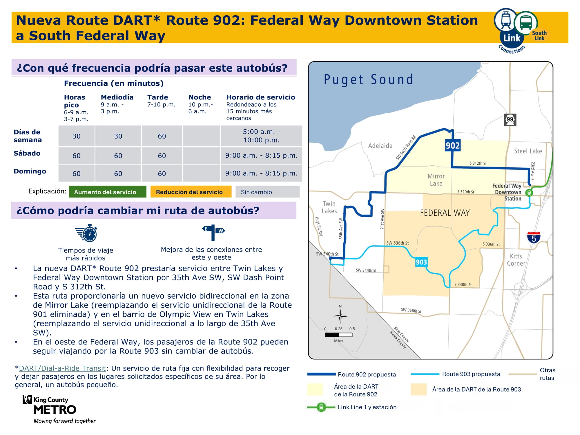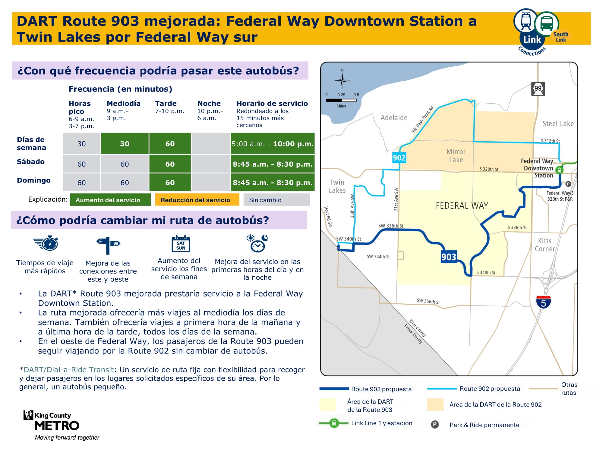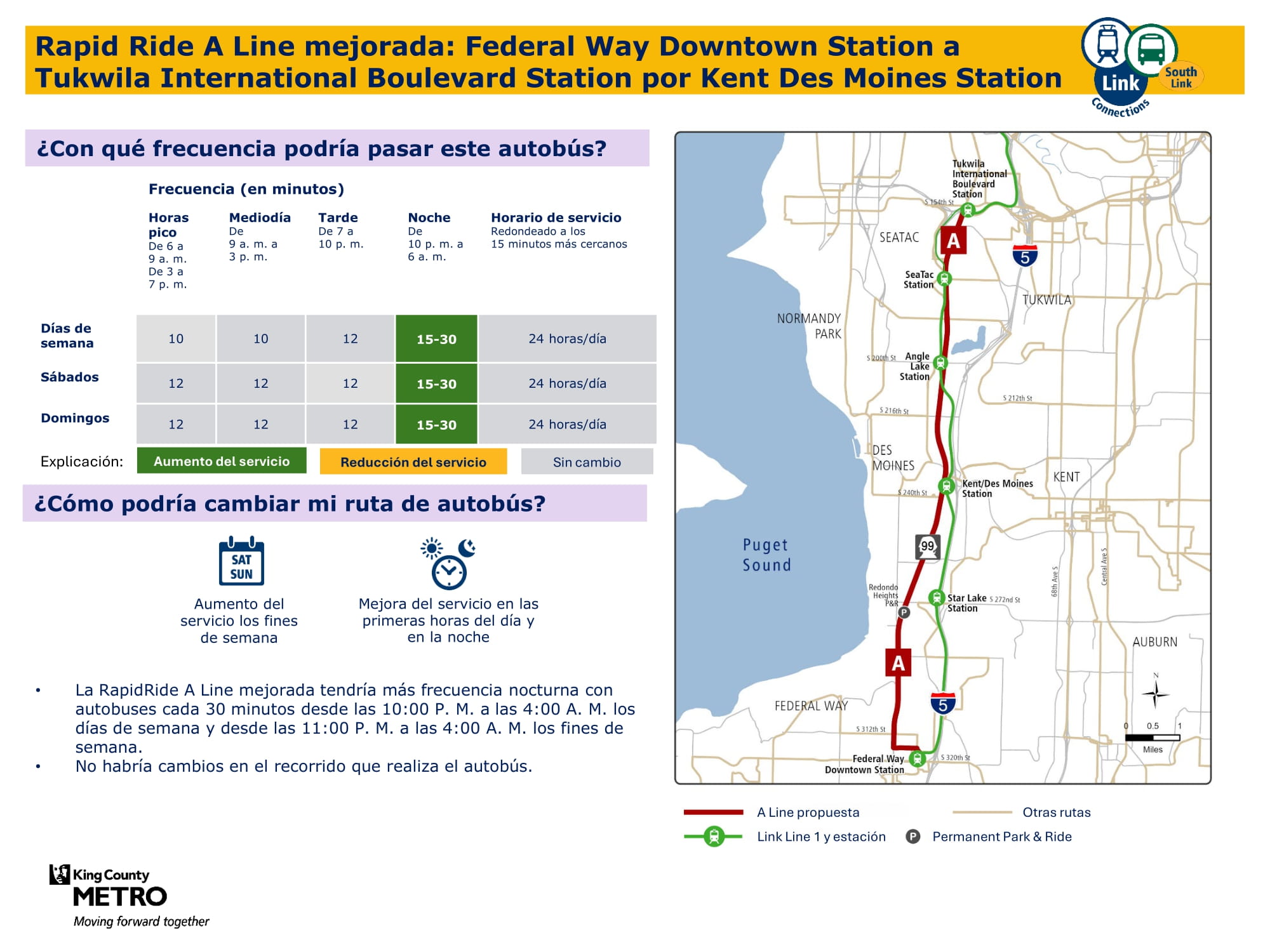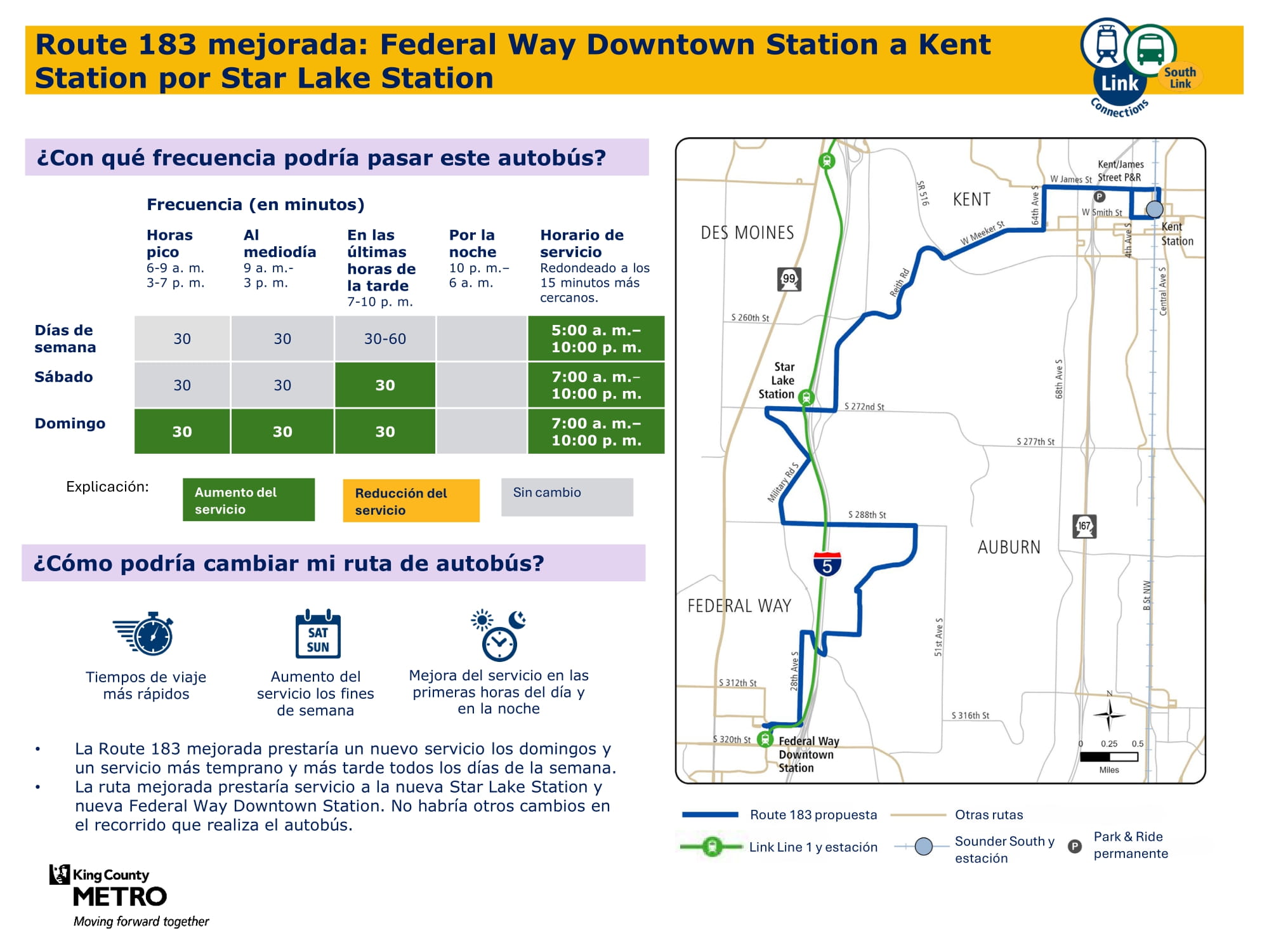 Mejor servicio con un servicio dominical nuevo y más viajes entre semana y los sábados. Se conectará con el tren ligero Link en las estaciones Federal Way Downtown y Star Lake.
