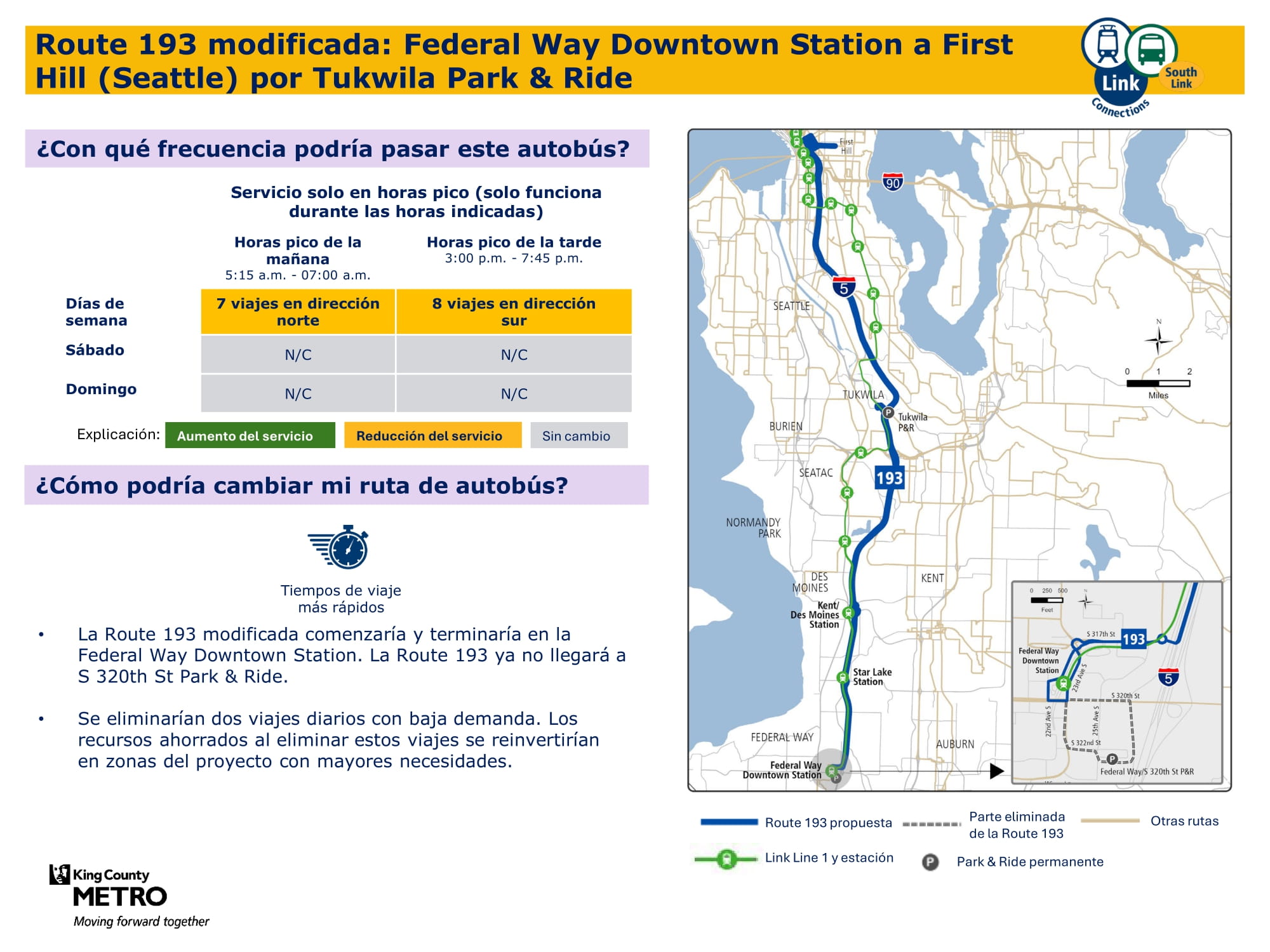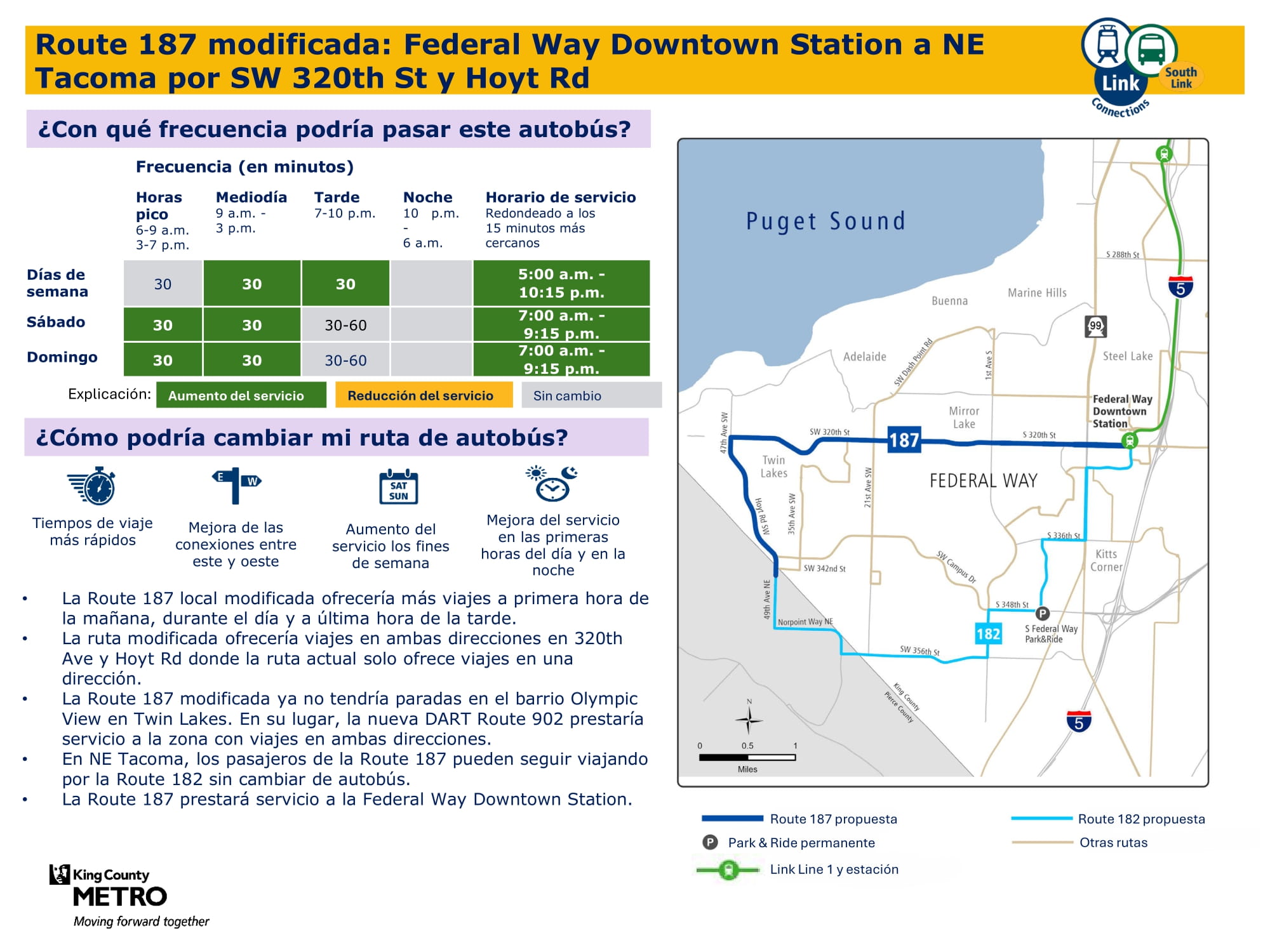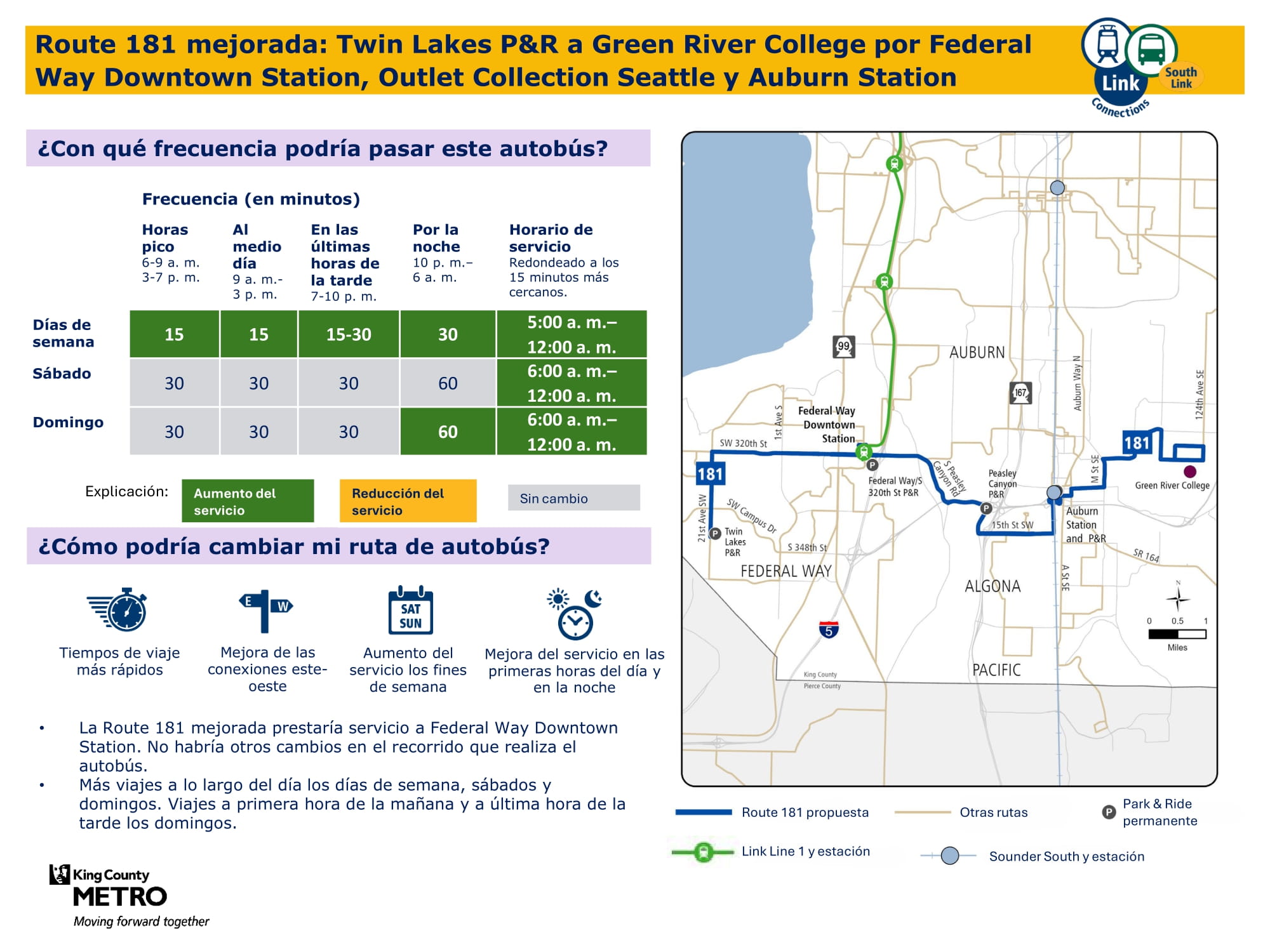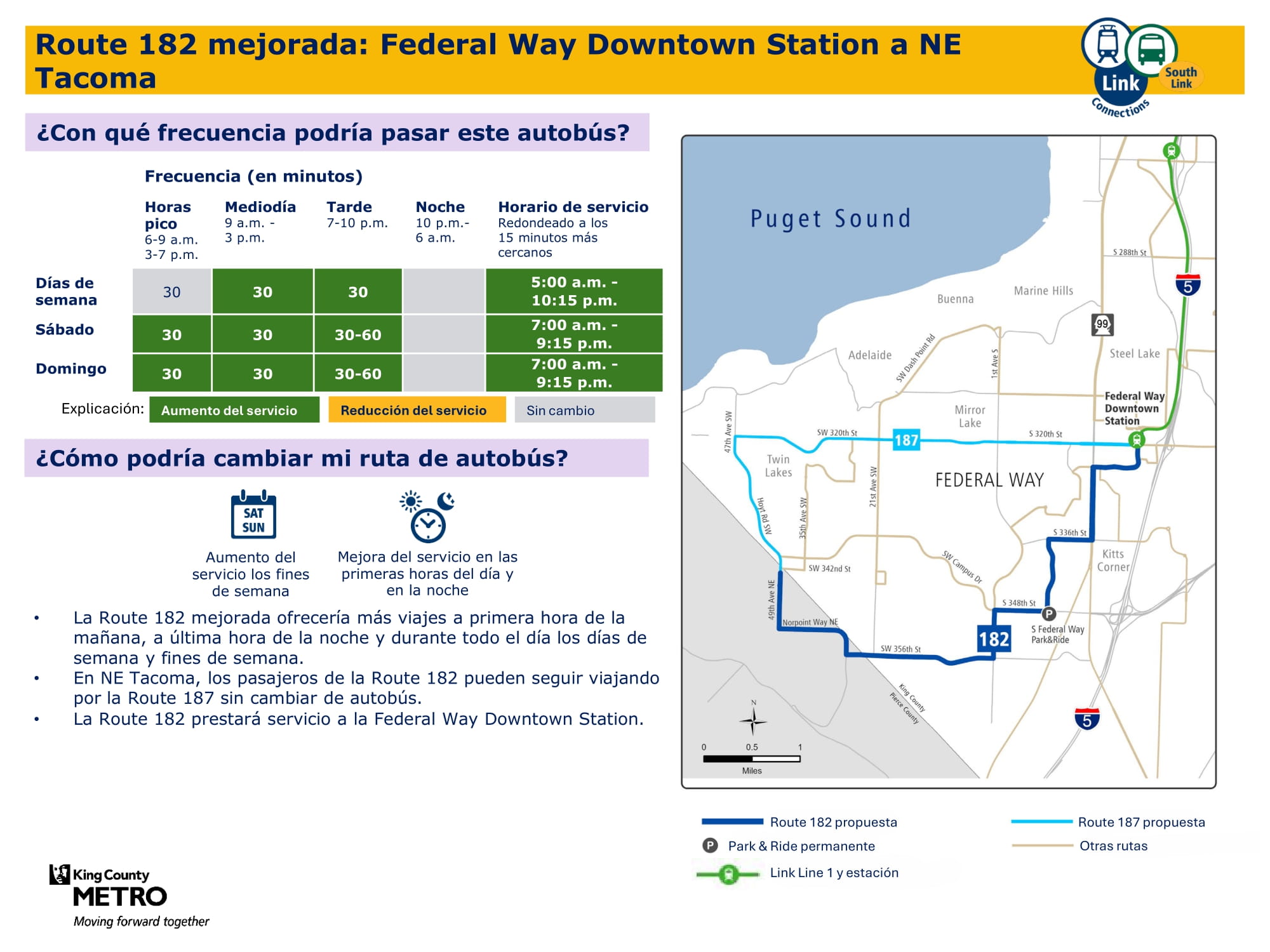 Mejor servicio con un servicio dominical nuevo y más viajes entre semana y los sábados. Se conectará con el tren ligero Link en las estaciones Federal Way Downtown y Star Lake.