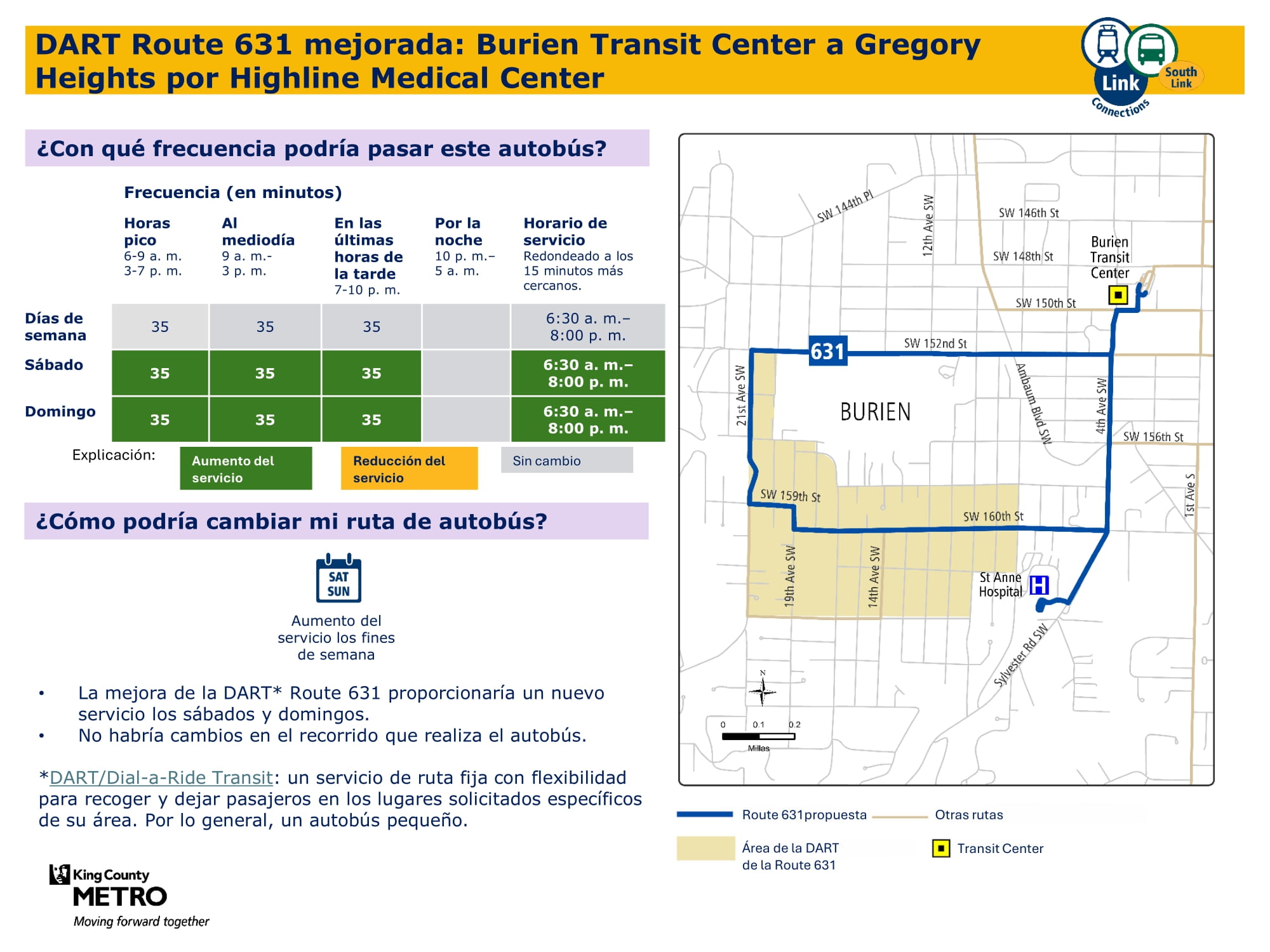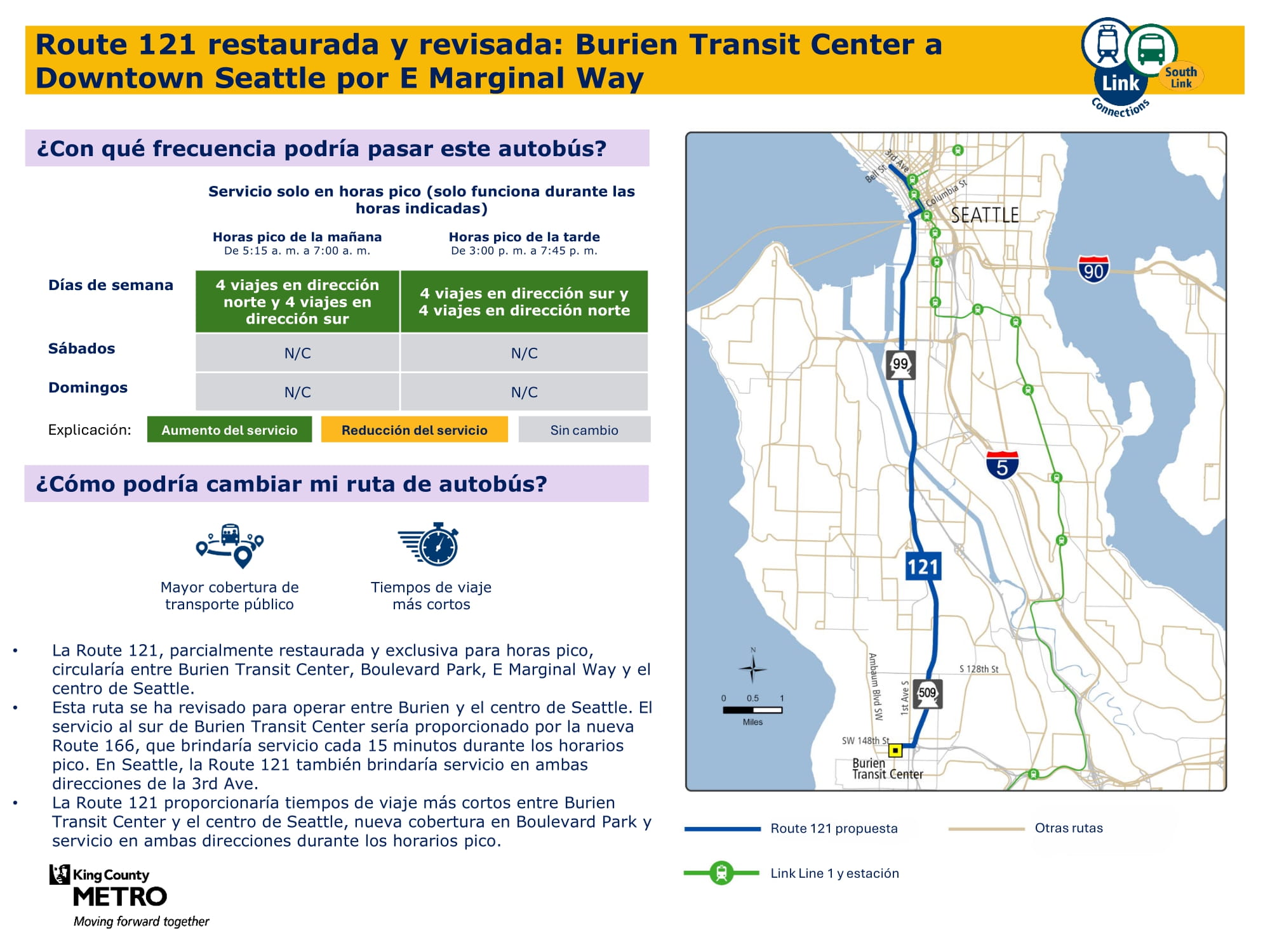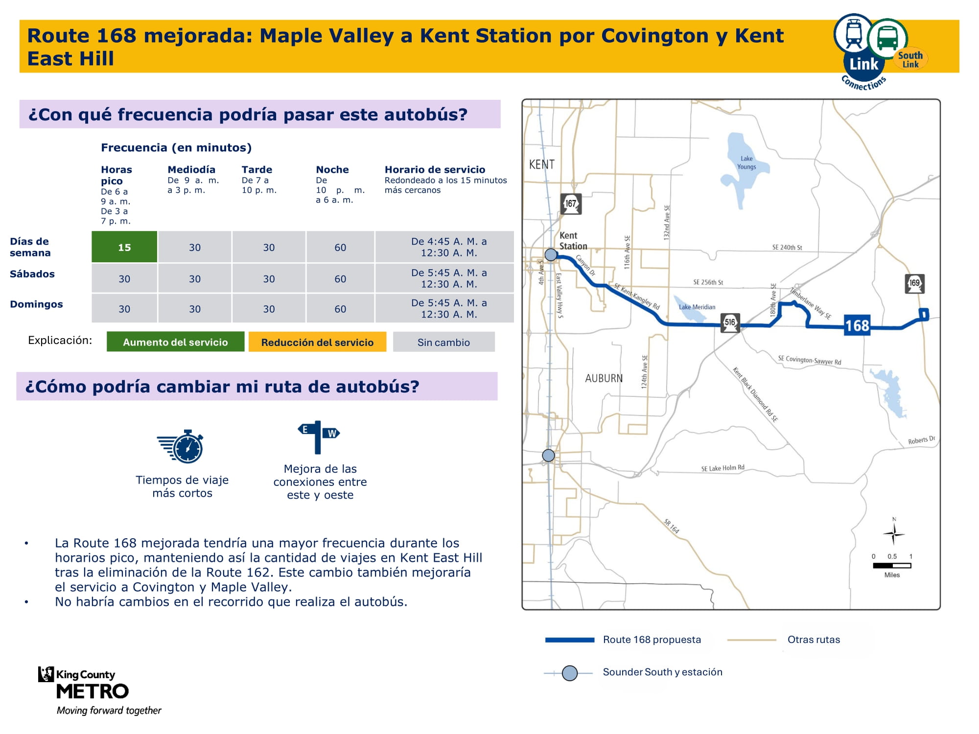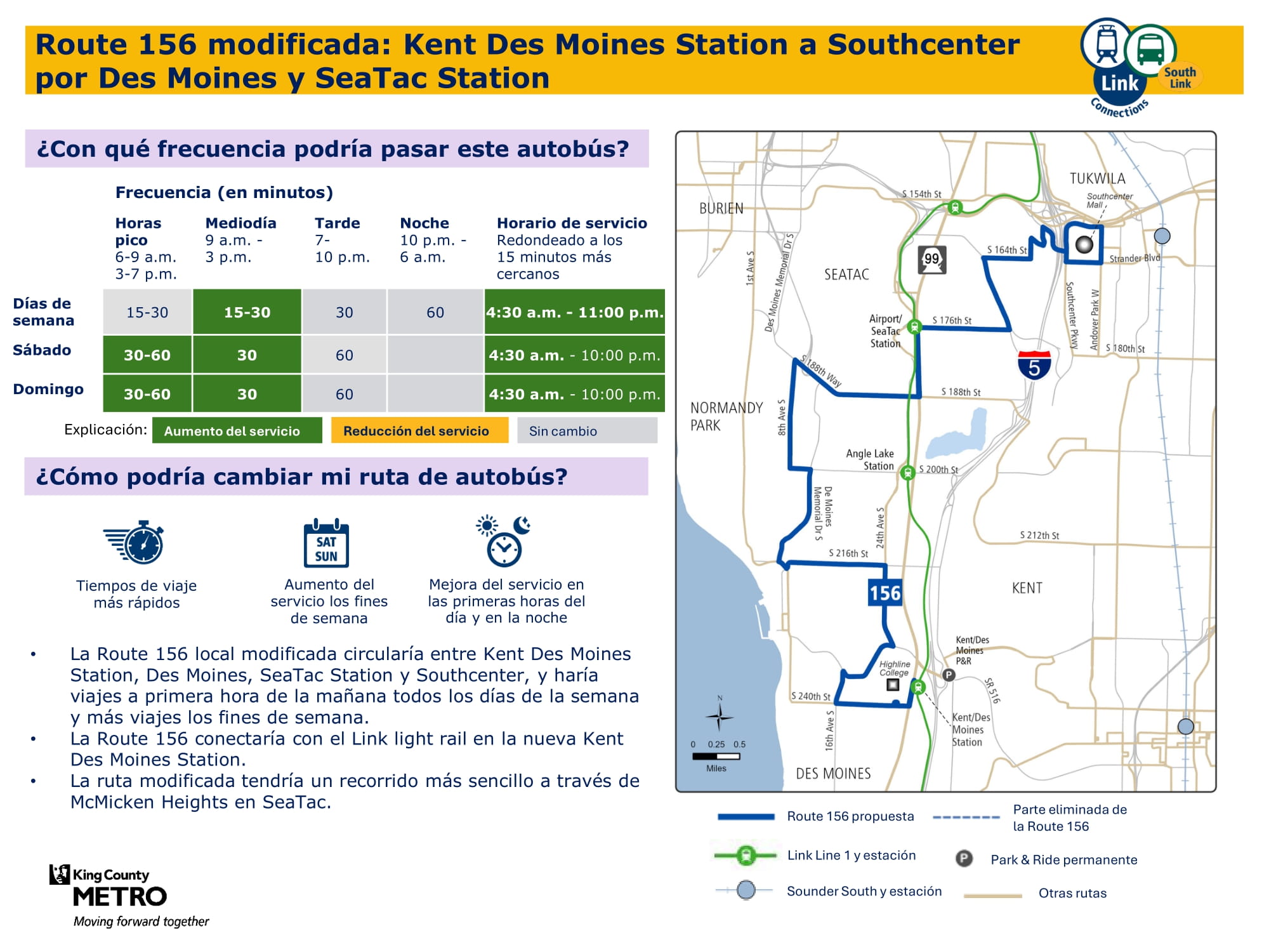 Mejor servicio con más viajes todos los días de la semana. Se conectará con el tren ligero Link en la estación Kent Des Moines y tendrá una ruta más directa a través de McMicken Heights.