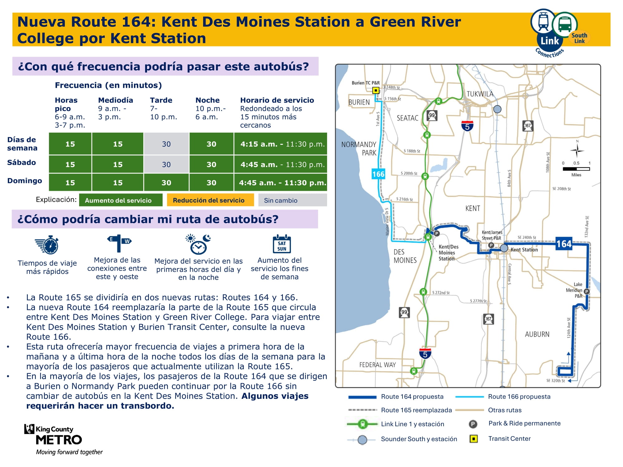 Nueva ruta frecuente en horas pico con más viajes todos los días de la semana. Reemplaza parte de la ruta 165. Conectará con el tren ligero Link en la estación de Kent Des Moines. Todos los viajes se convertirán en viajes de la ruta 164 para los pasajeros que viajan más allá de la estación Kent Des Moines.