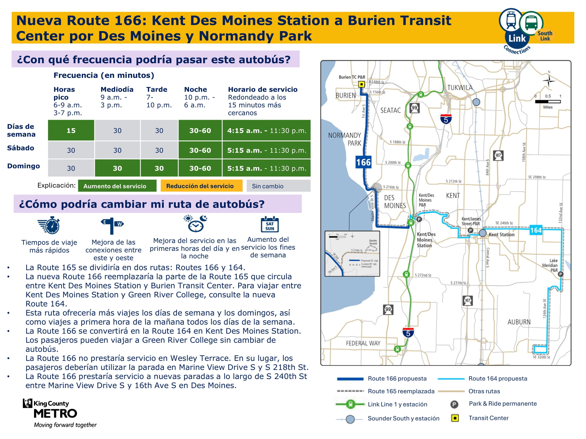 Ruta frecuente nueva con más viajes todos los días de la semana. Reemplaza parte de la ruta 165. Se conectará con el tren ligero Link en la estación Kent Des Moines. Algunos viajes se convertirán en viajes de la ruta 166 para los pasajeros que viajan más allá de la estación Kent Des Moines.