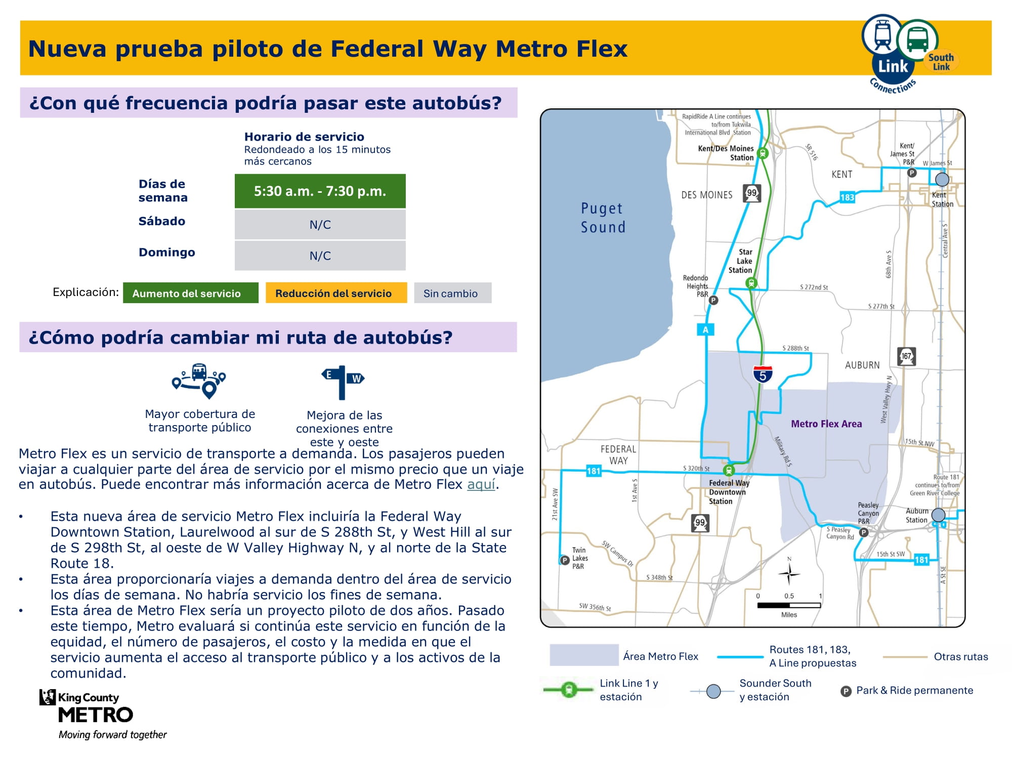 Nueva zona piloto de Metro Flex que ofrece servicio a demanda de lunes a viernes. Servicio en la estación Federal Way Downtown, Laurelwood al sur de S 288th St y West Hill al sur de S 298th St, al oeste de W Valley Highway N y al norte de la Ruta estatal 18.