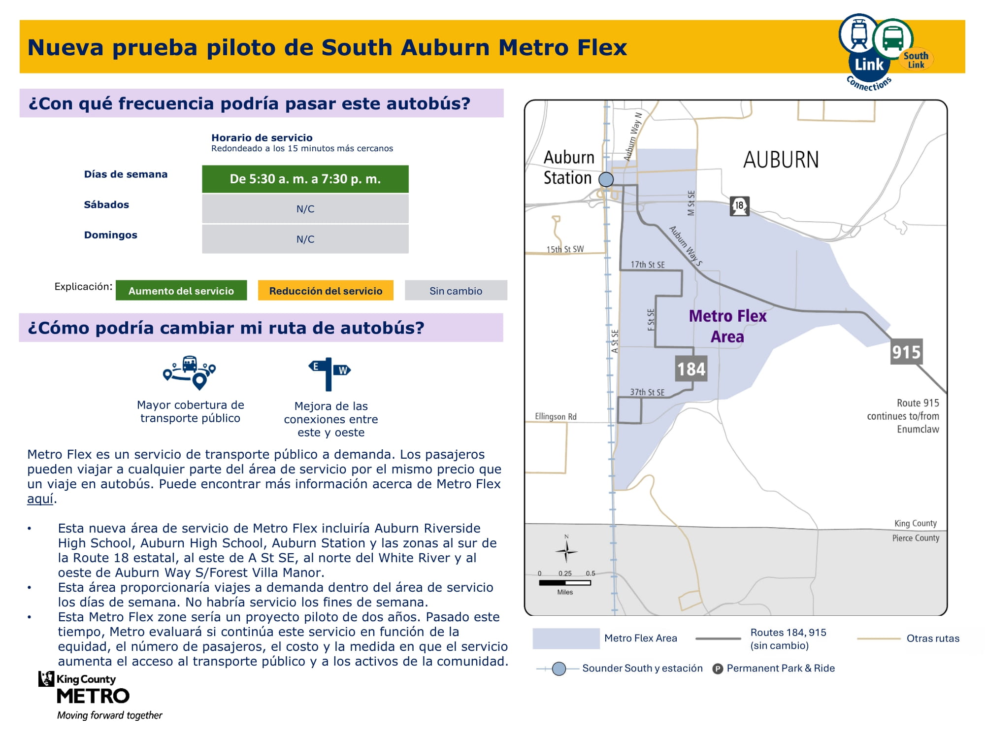 Nueva zona piloto de Metro Flex que ofrece servicio a demanda de lunes a viernes. Servicio en áreas al sur de la Ruta estatal 18, al este de A Street SE, al norte de White River y al oeste de Auburn Way S/Forest Villa Manor. Incluye la estación Auburn y la Riverside High School.