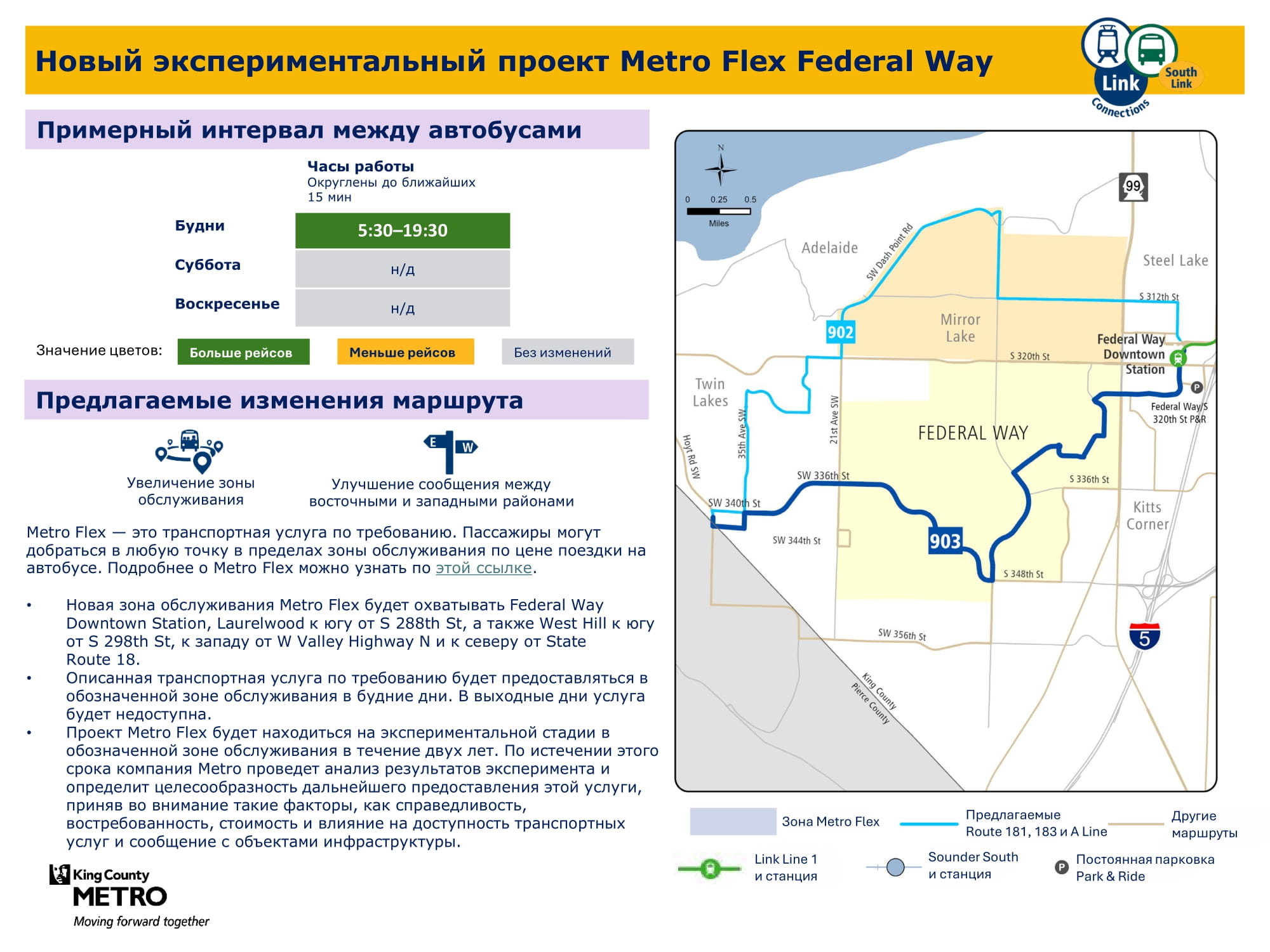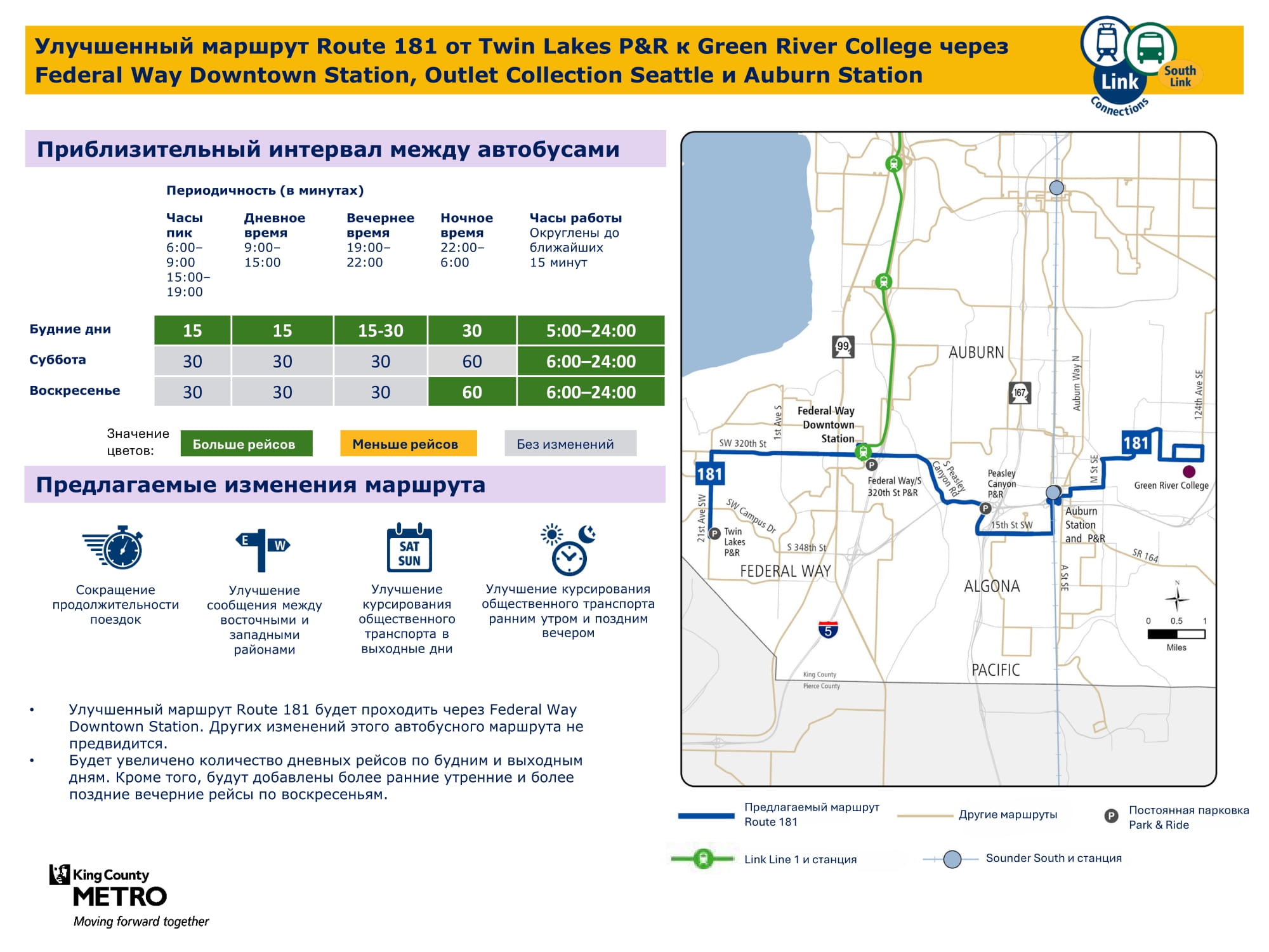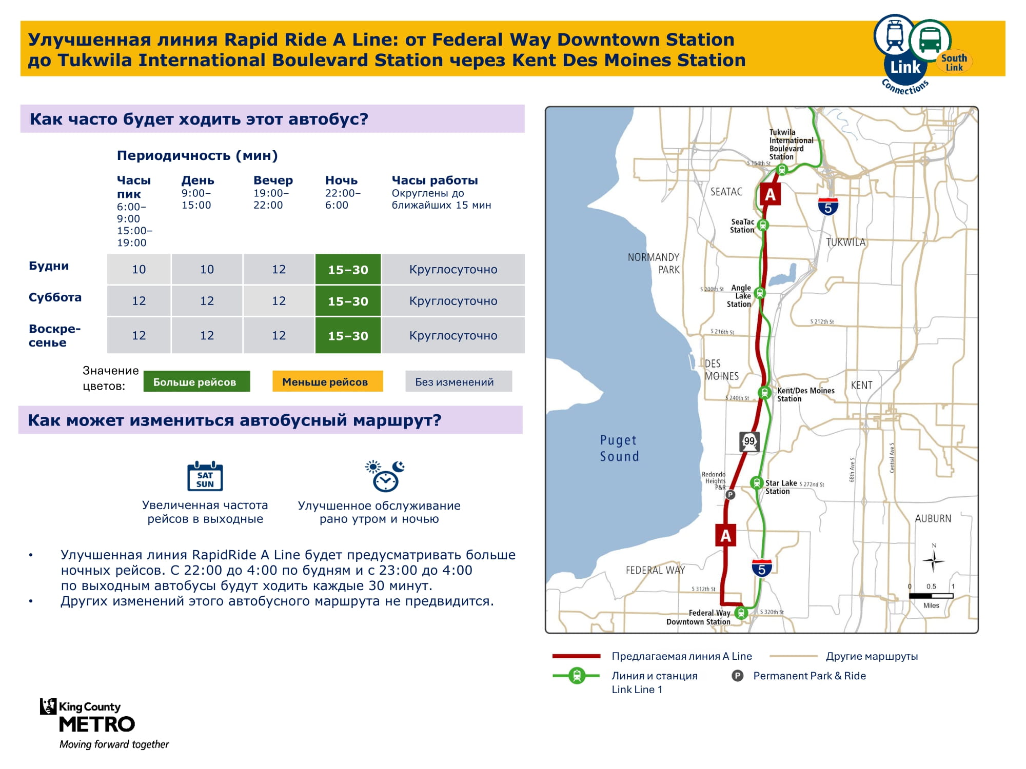 Улучшенный маршрут с сокращением интервалов движения и с большим количеством рейсов в течение всей недели. Он будет обеспечивать пересадку на легкорельсовый трамвай Link на станции Federal Way Downtown.
