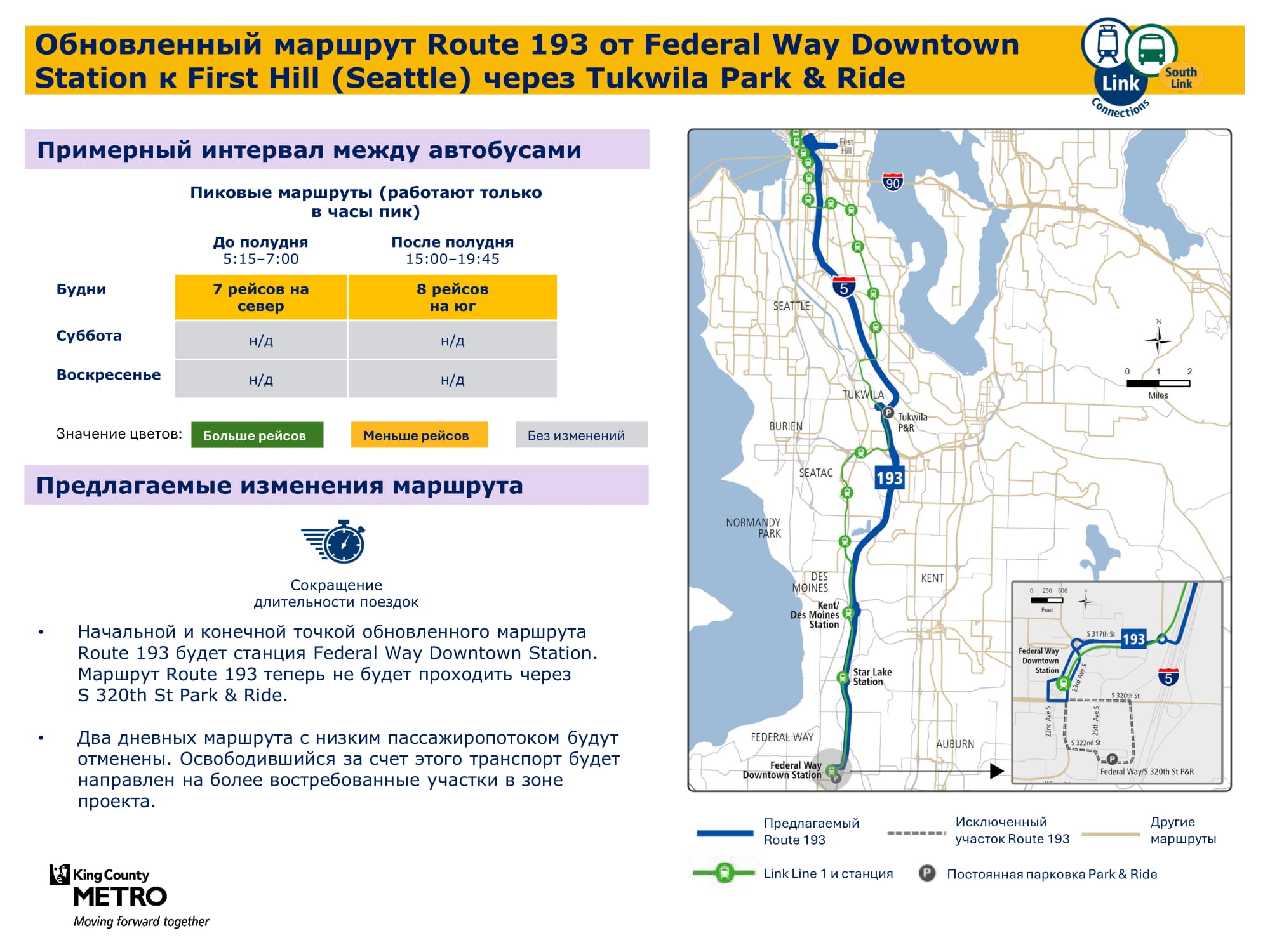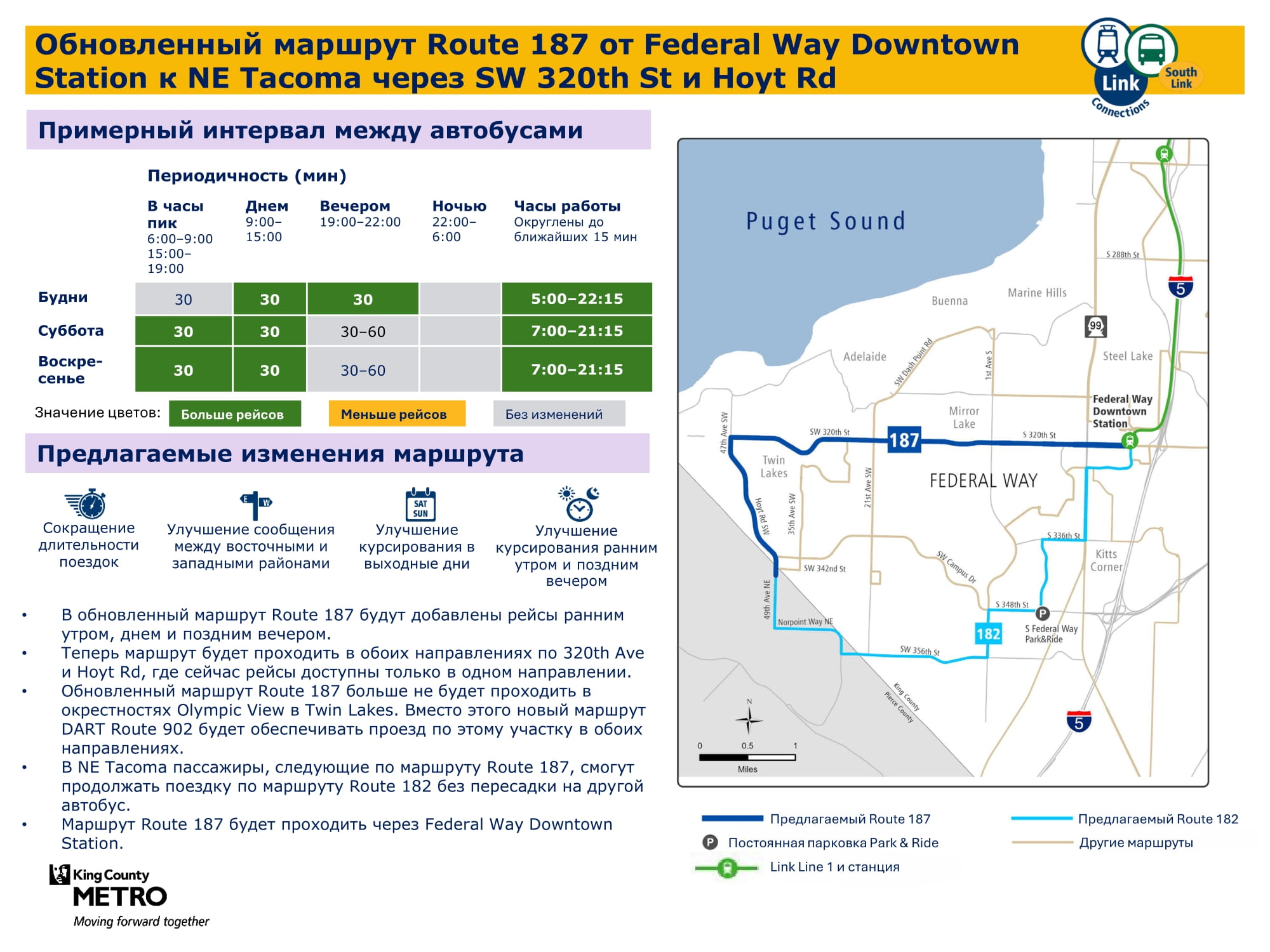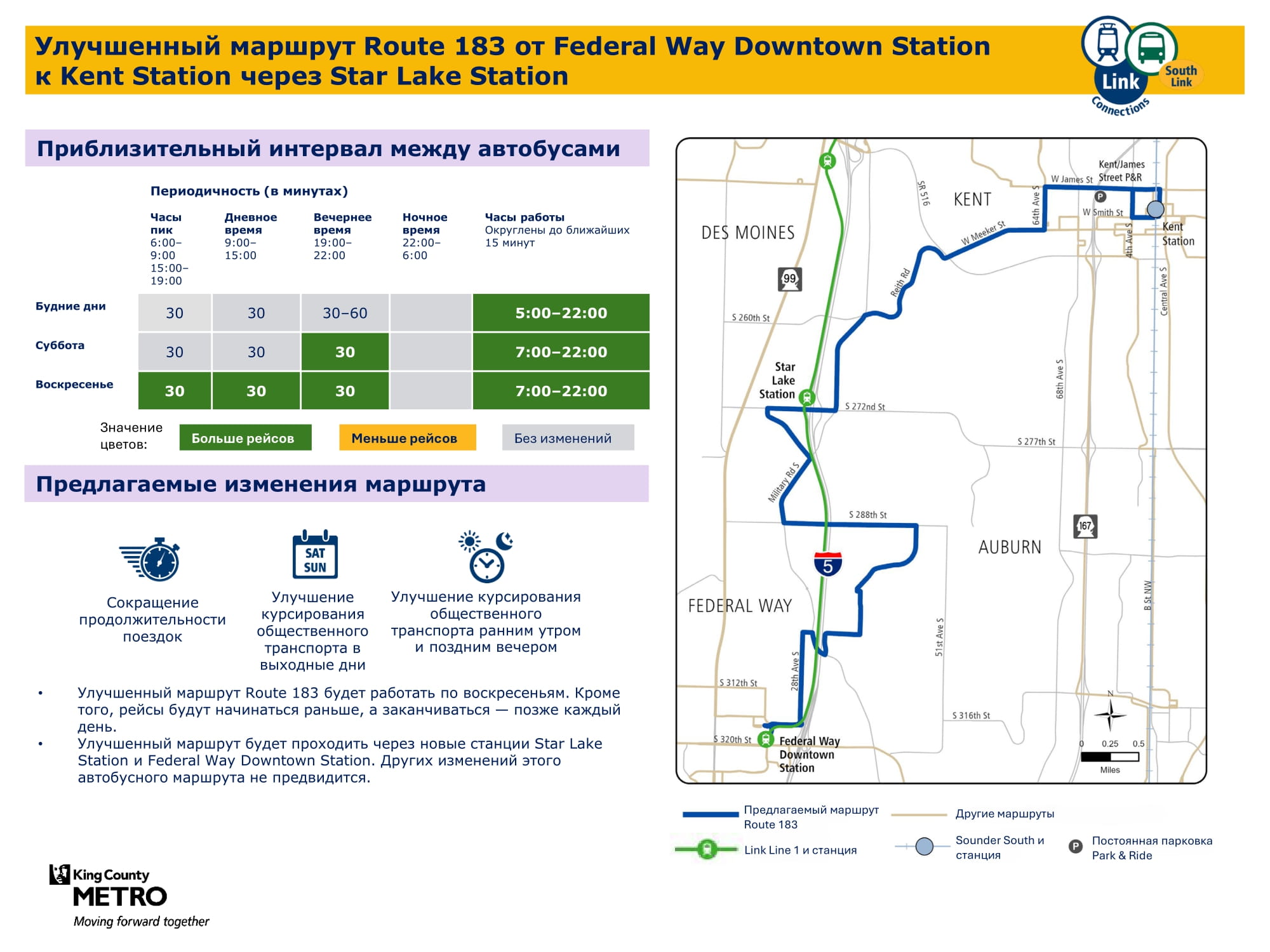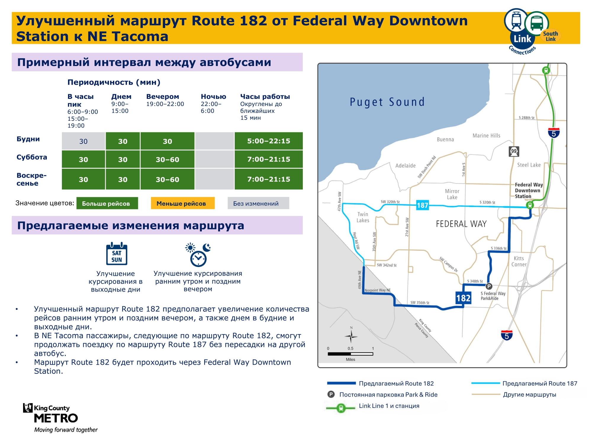 Улучшенный маршрут с сокращением интервалов движения и с большим количеством рейсов в течение всей недели. Он будет обеспечивать пересадку на легкорельсовый трамвай Link на станции Federal Way Downtown.