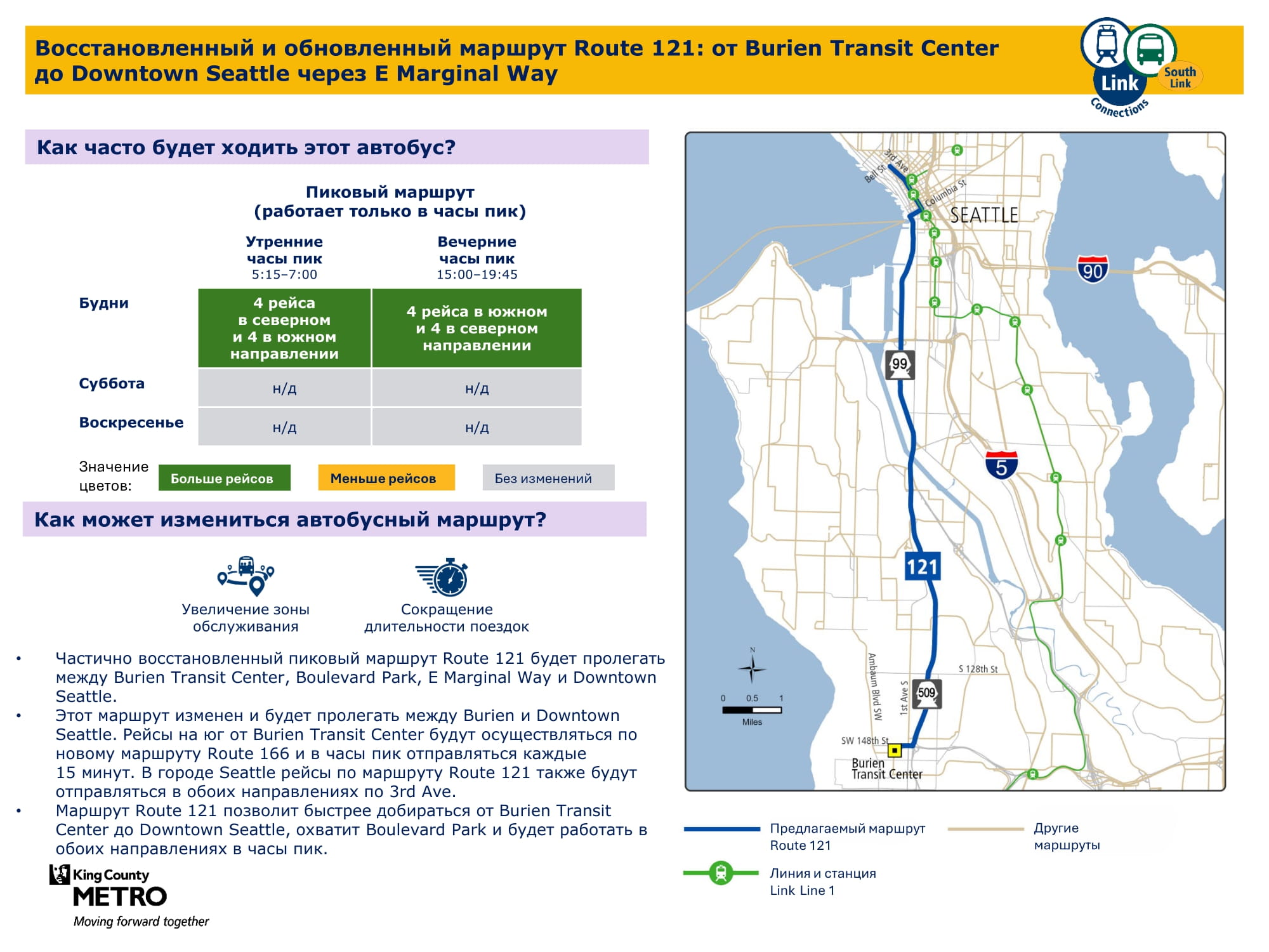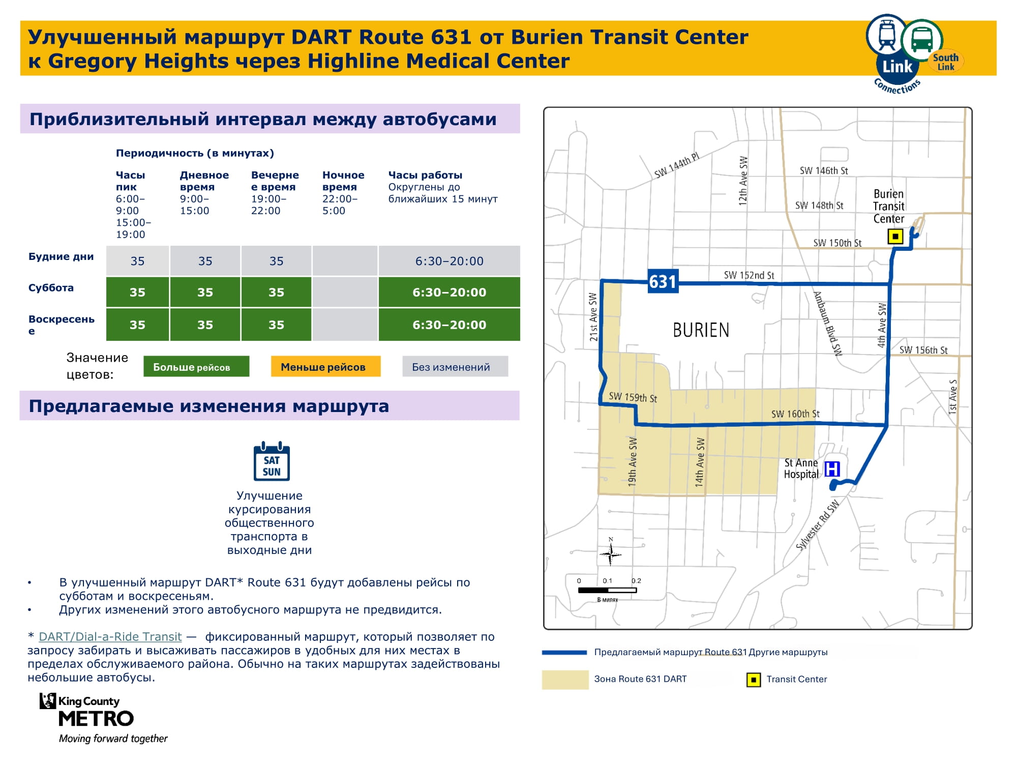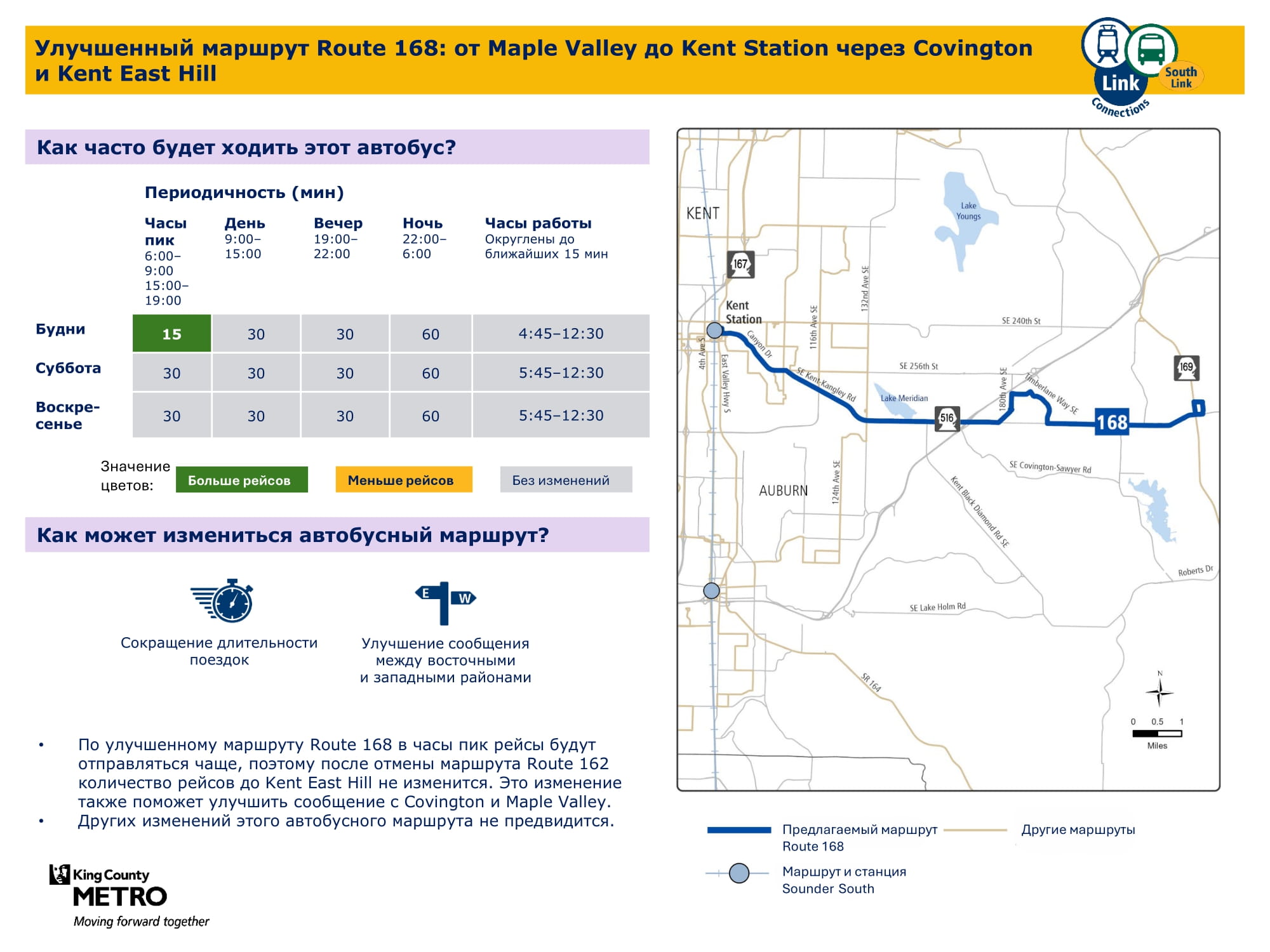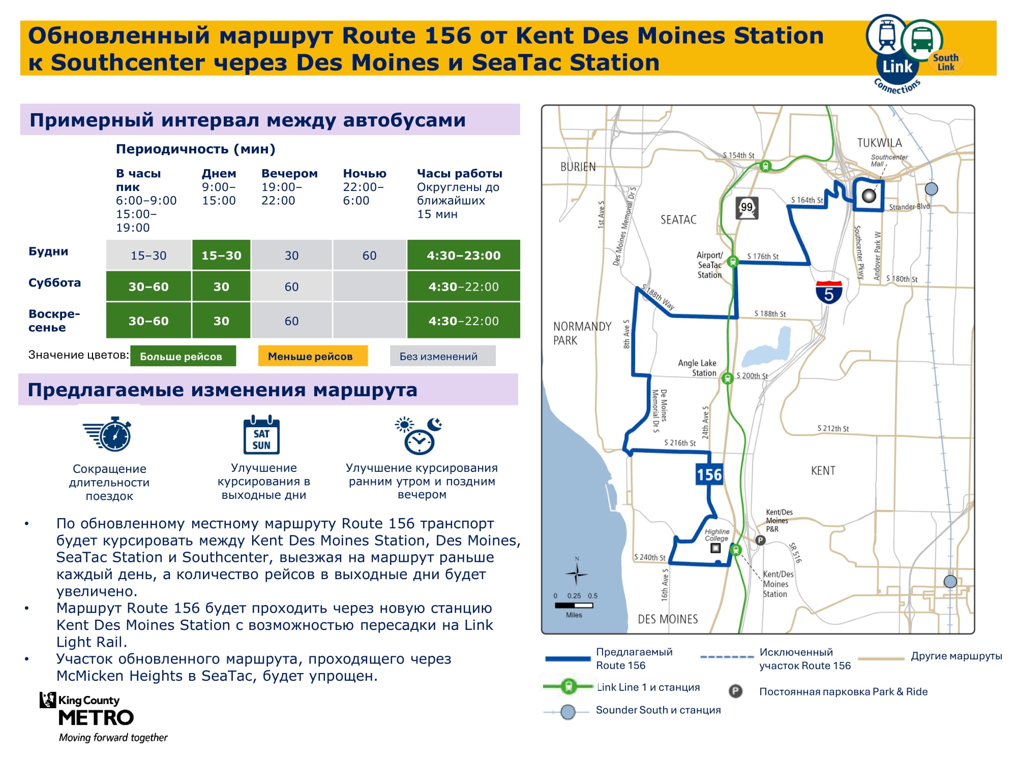 Будет увеличено количество рейсов в течение всей недели. Будет обеспечивать пересадку на легкорельсовый трамвай Link на станции Kent Des Moines и идти по более прямому маршруту через McMicken Heights.