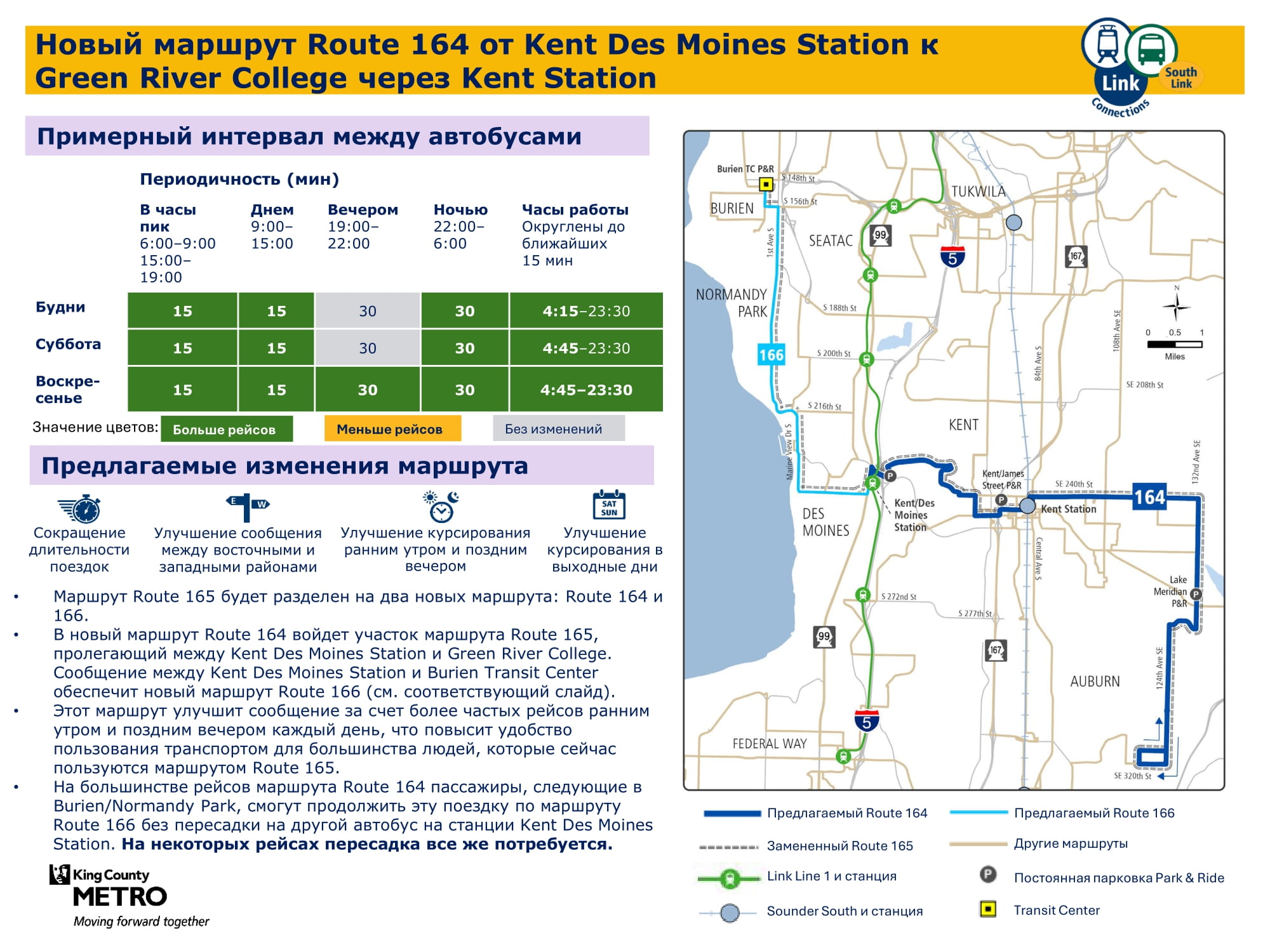 Новый маршрут с повышенной частотой курсирования в часы пик и с большим количеством рейсов каждый день. Частично заменяет маршрут 165. Будет обеспечивать пересадку на легкорельсовый транспорт Link на станции Kent Des Moines. Все рейсы станут частью маршрута 164 для пассажиров, продолжающих поездку после станции Kent Des Moines.