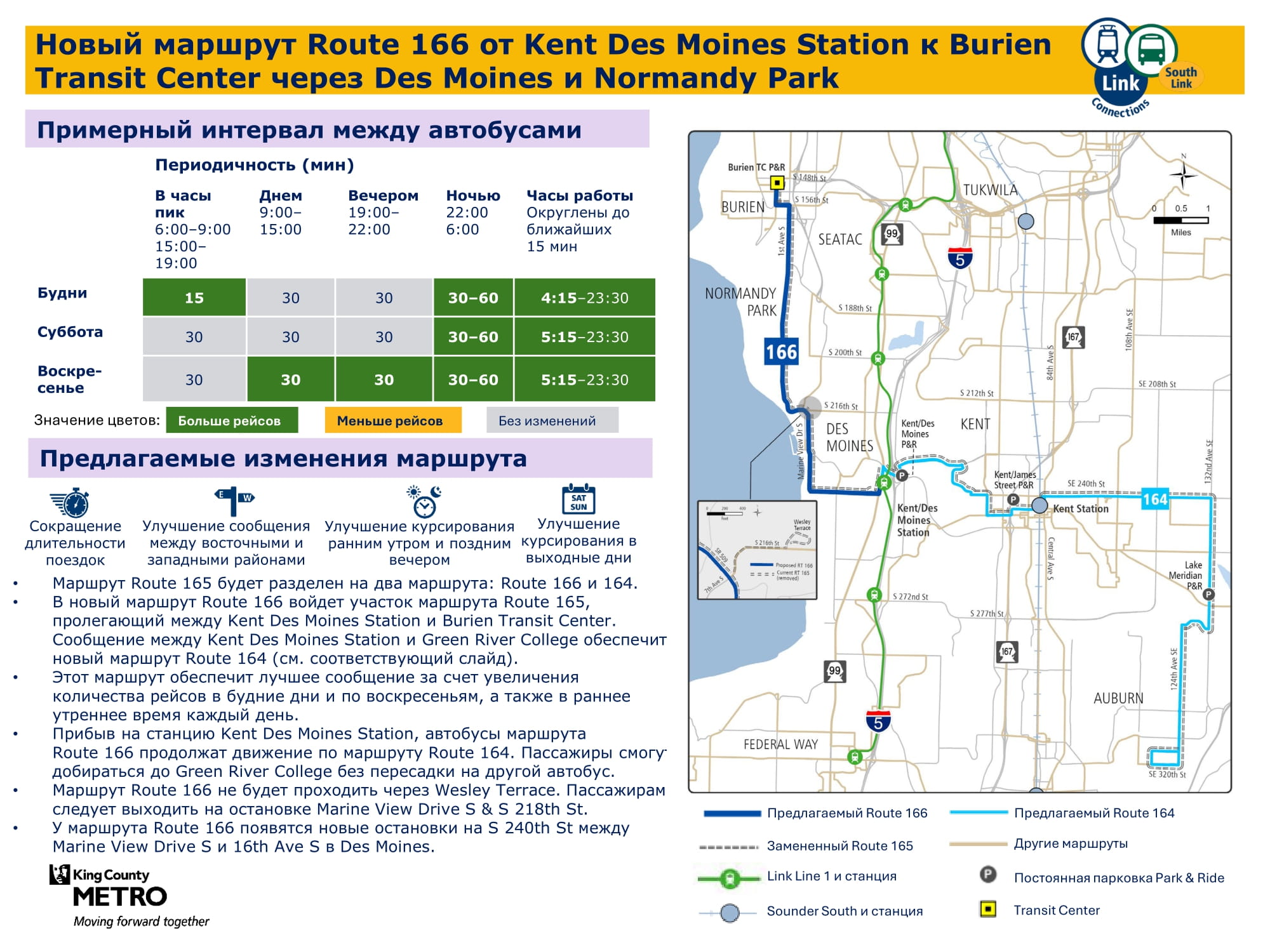 Новый частый маршрут с большим количеством рейсов в течение всей недели. Частичная замена маршрута 165. Будет обеспечивать пересадку на легкорельсовый трамвай Link на станции Kent Des Moines. Некоторые рейсы превратятся в рейсы по маршруту 166 для пассажиров, продолжающих поездку после станции Kent Des Moines.