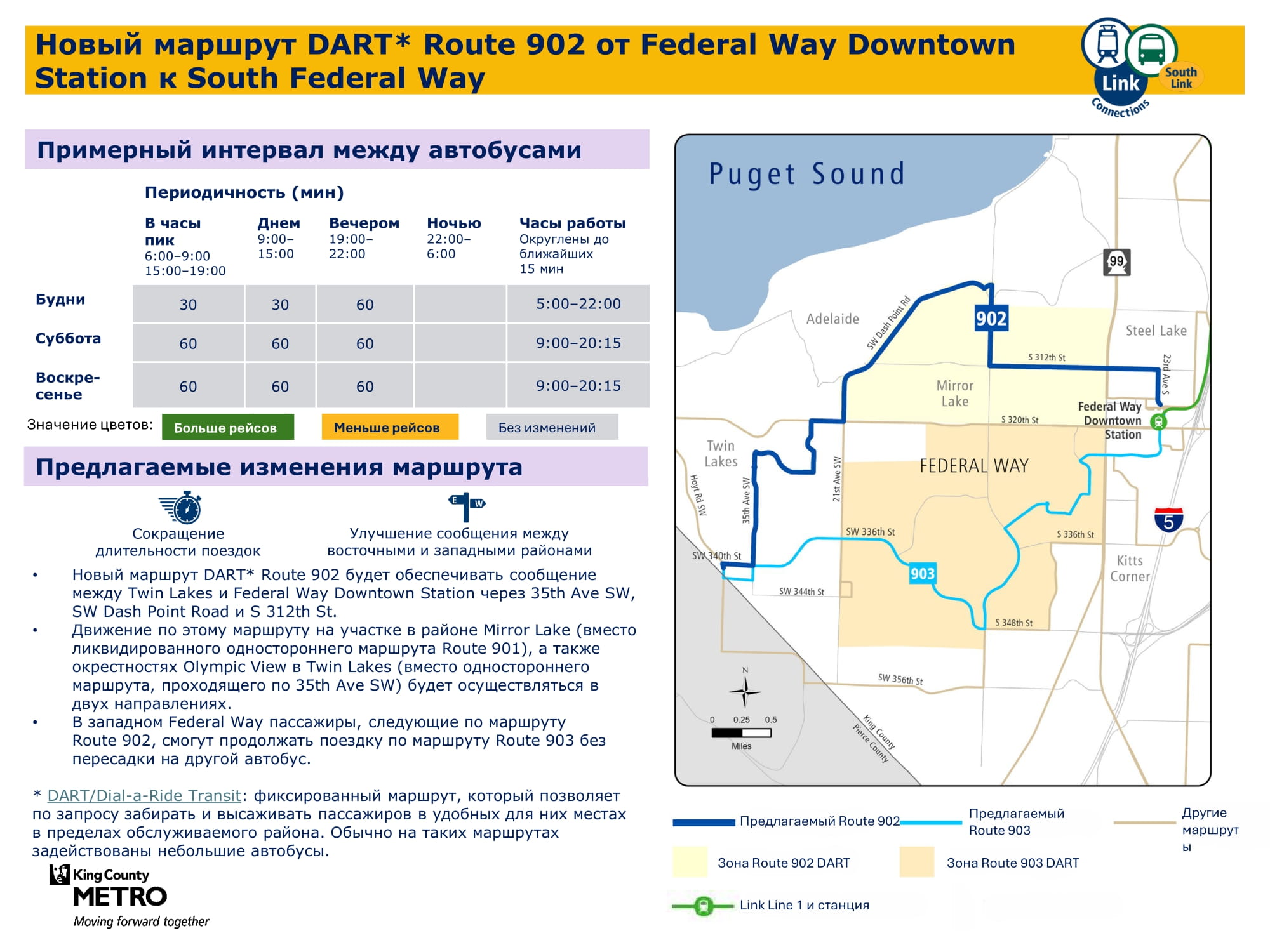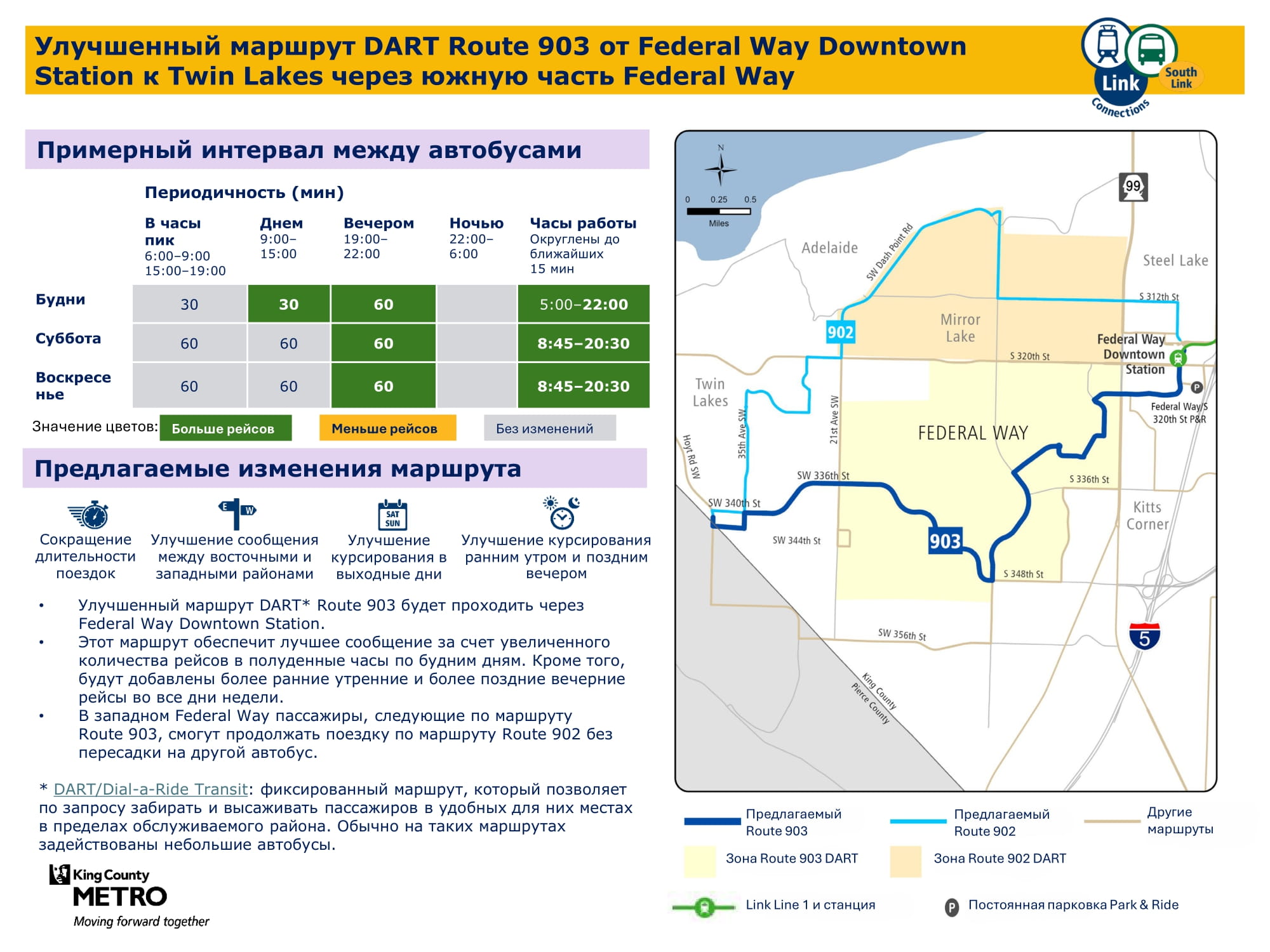 Новый маршрут DART. Частично заменит маршрут DART 901. Кроме того, будет увеличено количество рейсов на протяжении всей недели. Он будет обеспечивать пересадку на легкорельсовый трамвай Link на станции Federal Way Downtown.