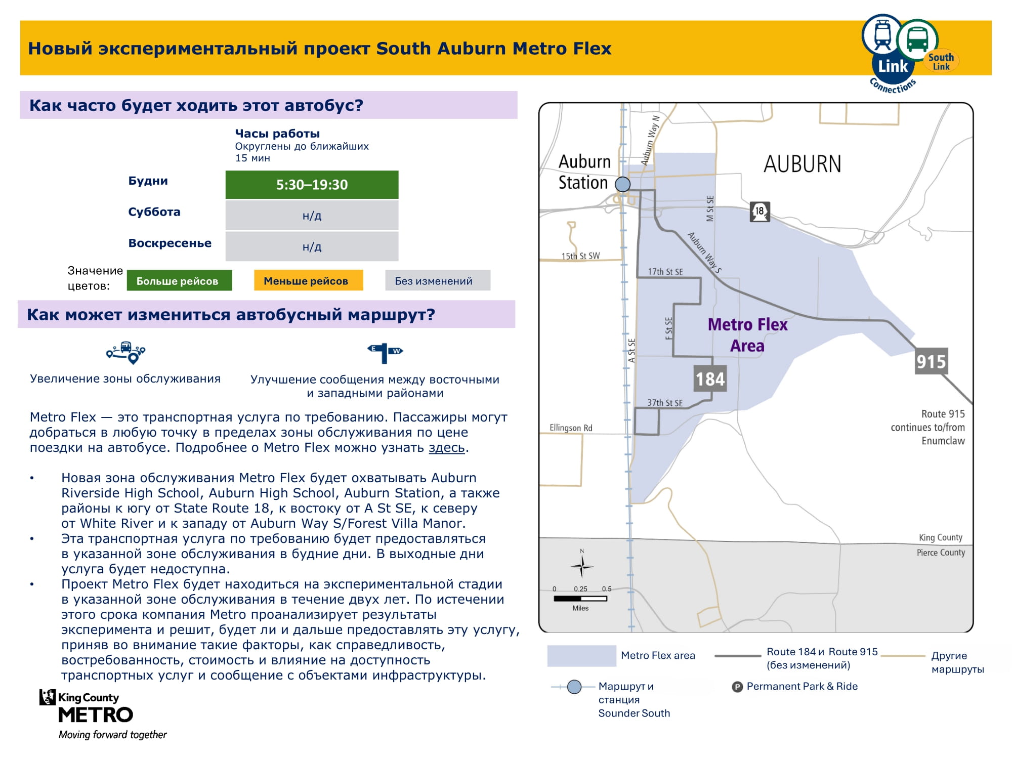 Новая зона экспериментальной работы службы транспорта по запросу Metro Flex, предлагающая обслуживание с понедельника по пятницу. Зона обслуживания охватывает территорию южнее автомагистрали State Route 18, восточнее A Street SE, севернее White River и западнее Auburn Way S/Forest Villa Manor. Эта зона также включает станцию Auburn и школу Riverside High School.