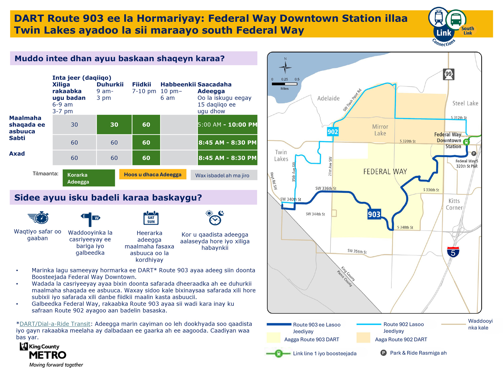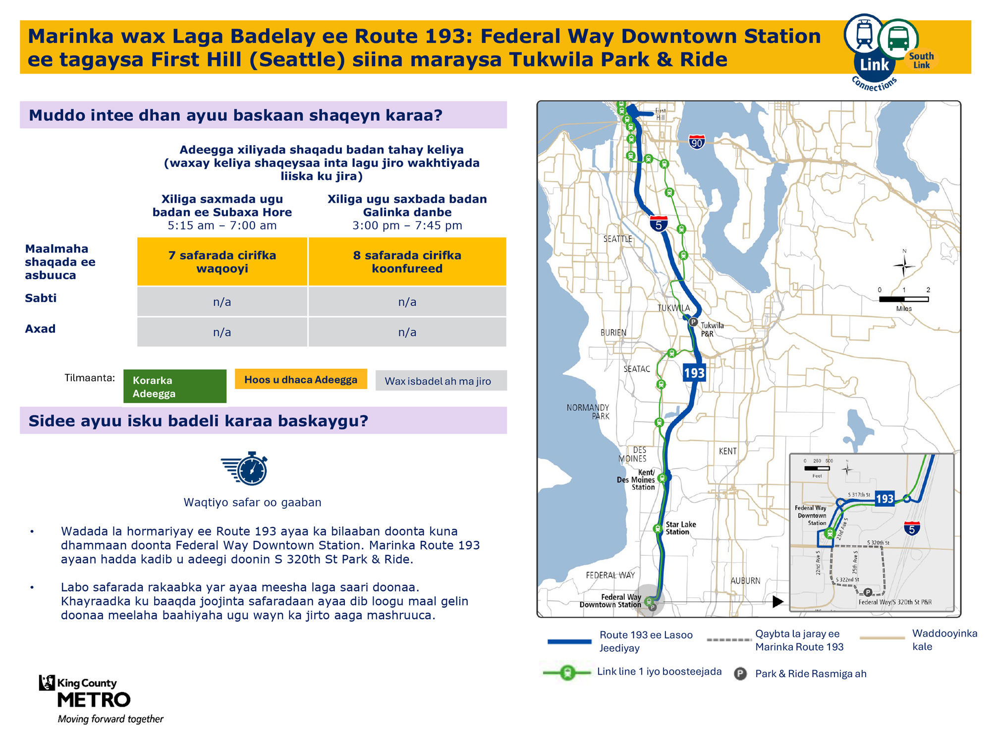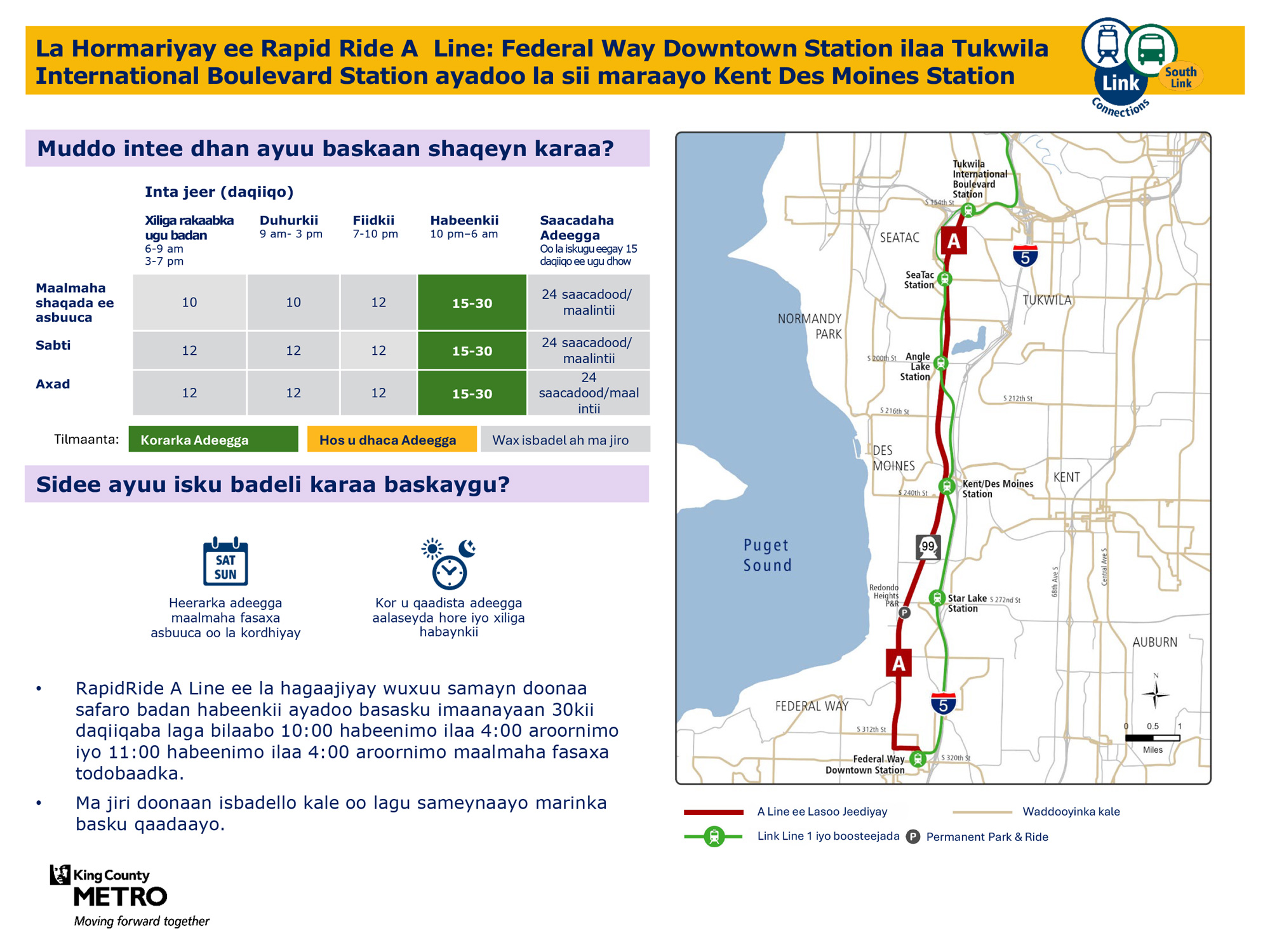 Waxaa lagu hormariyay safaro badan maalin kasta oo todobaadka ah. Waxay ku xiri doontaa tareenka fudud ee Link Federal Way Downtown Station.