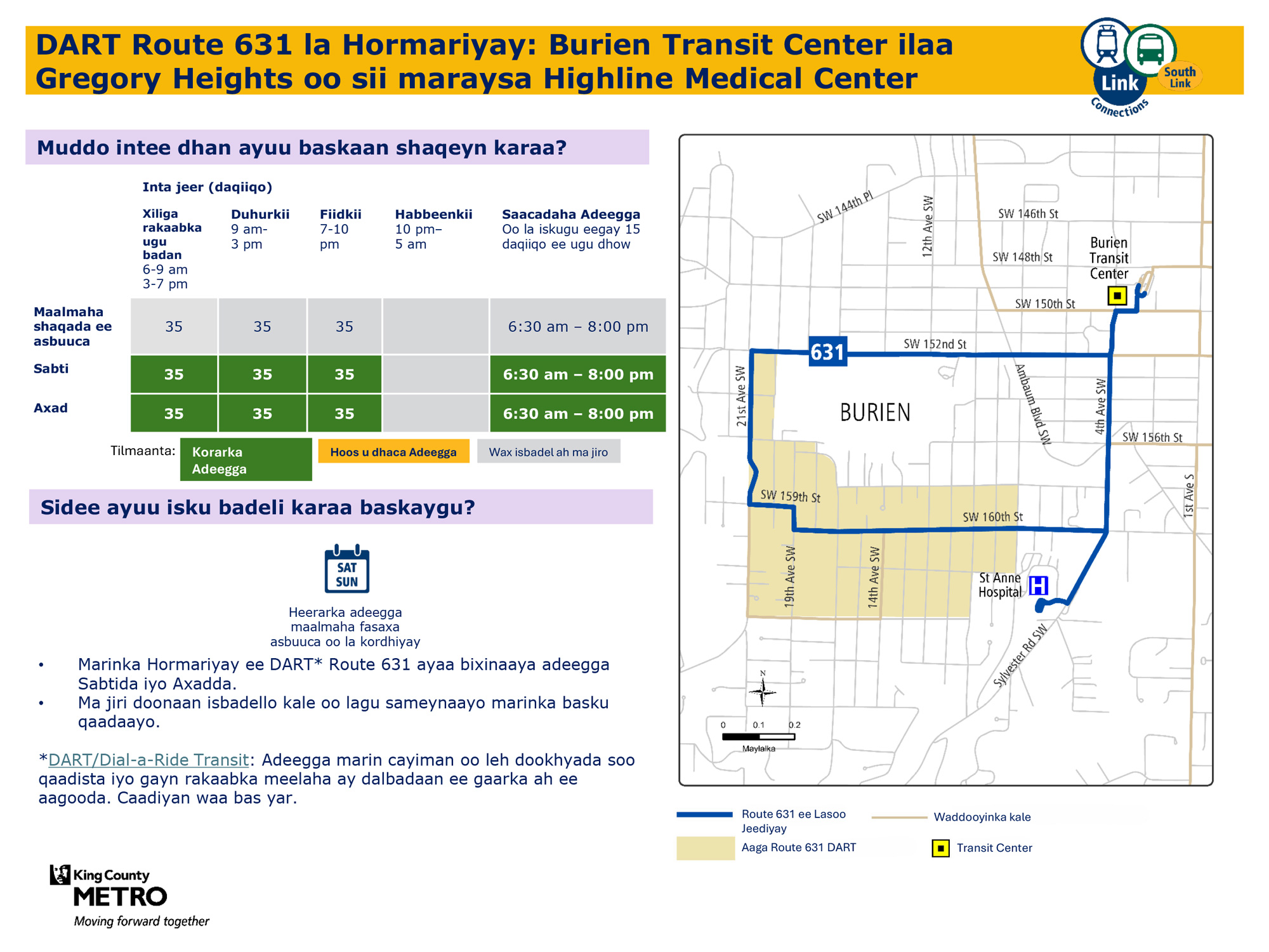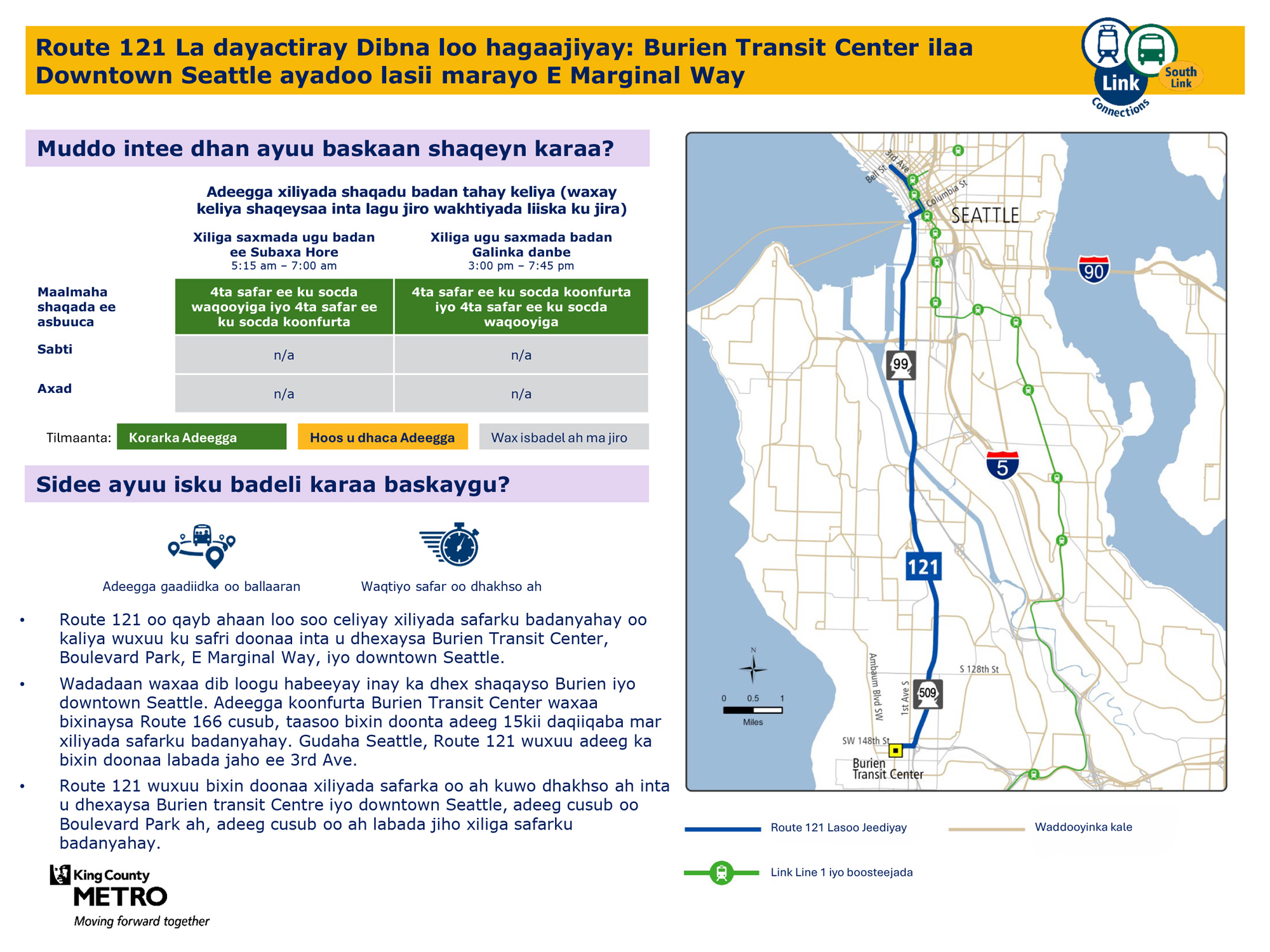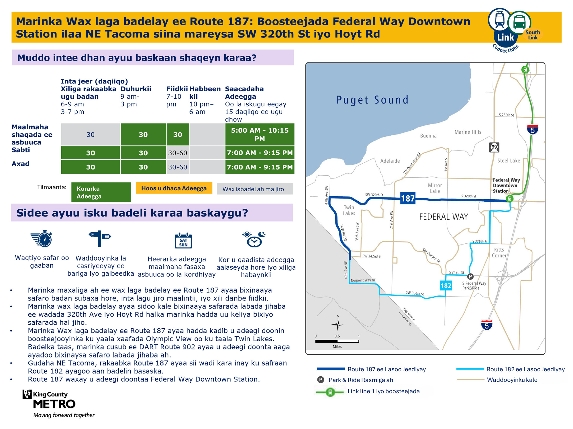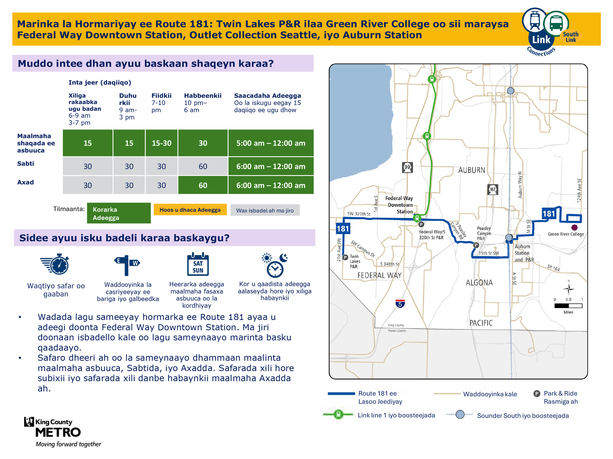 Waxaa lagu hormariyay safaro badan maalin kasta oo todobaadka ah. Waxay ku xiri doontaa tareenka fudud ee Link Federal Way Downtown Station.