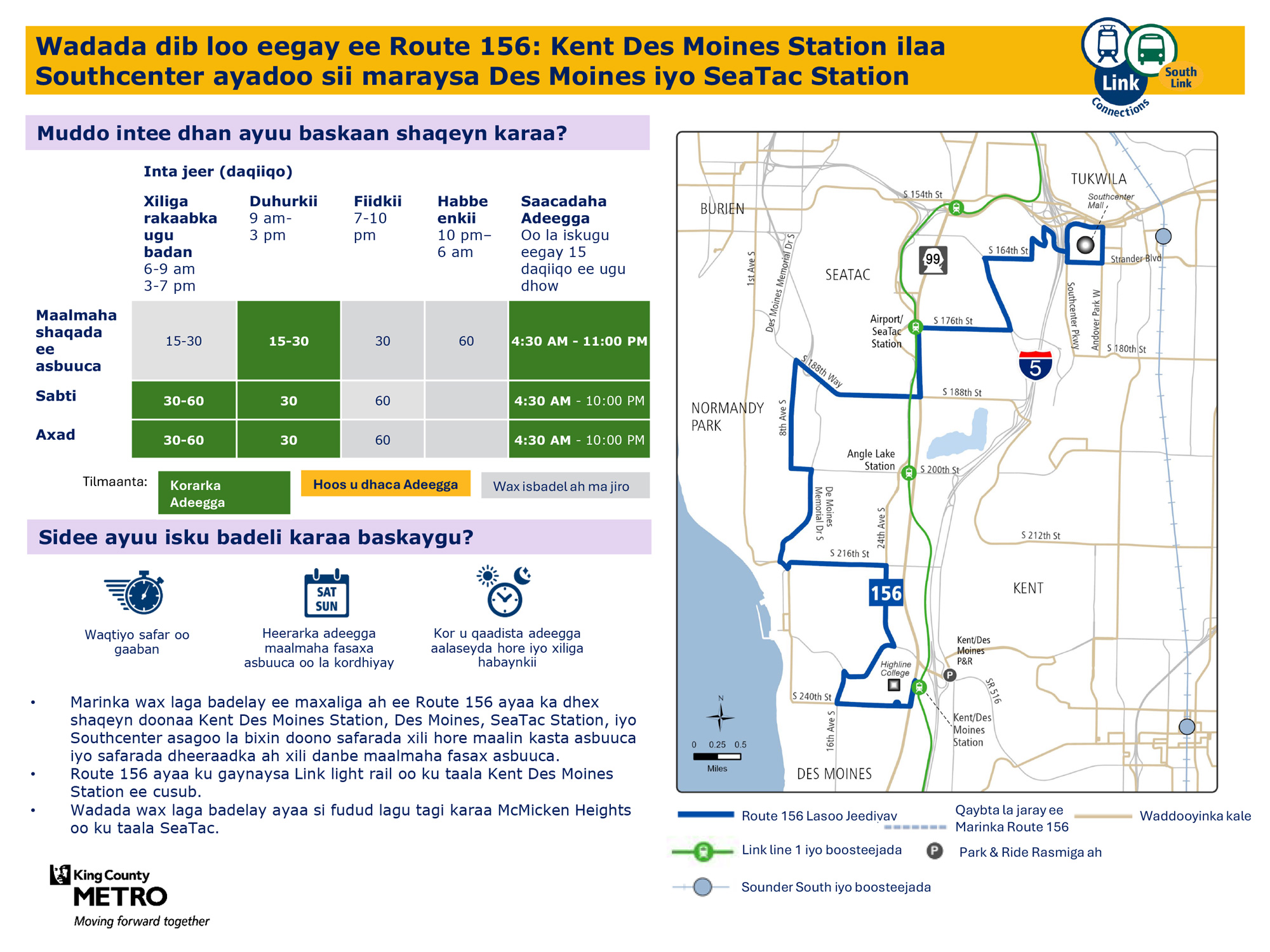 Waxaa lagu hormariyay safaro badan maalin kasta oo todobaadka ah. Waxay ku xiriirin doontaa tareenka fudud ee Link Kent Des Moines Station oo ay yeelan doontaa wado toos ah ilaa McMicken Heights.