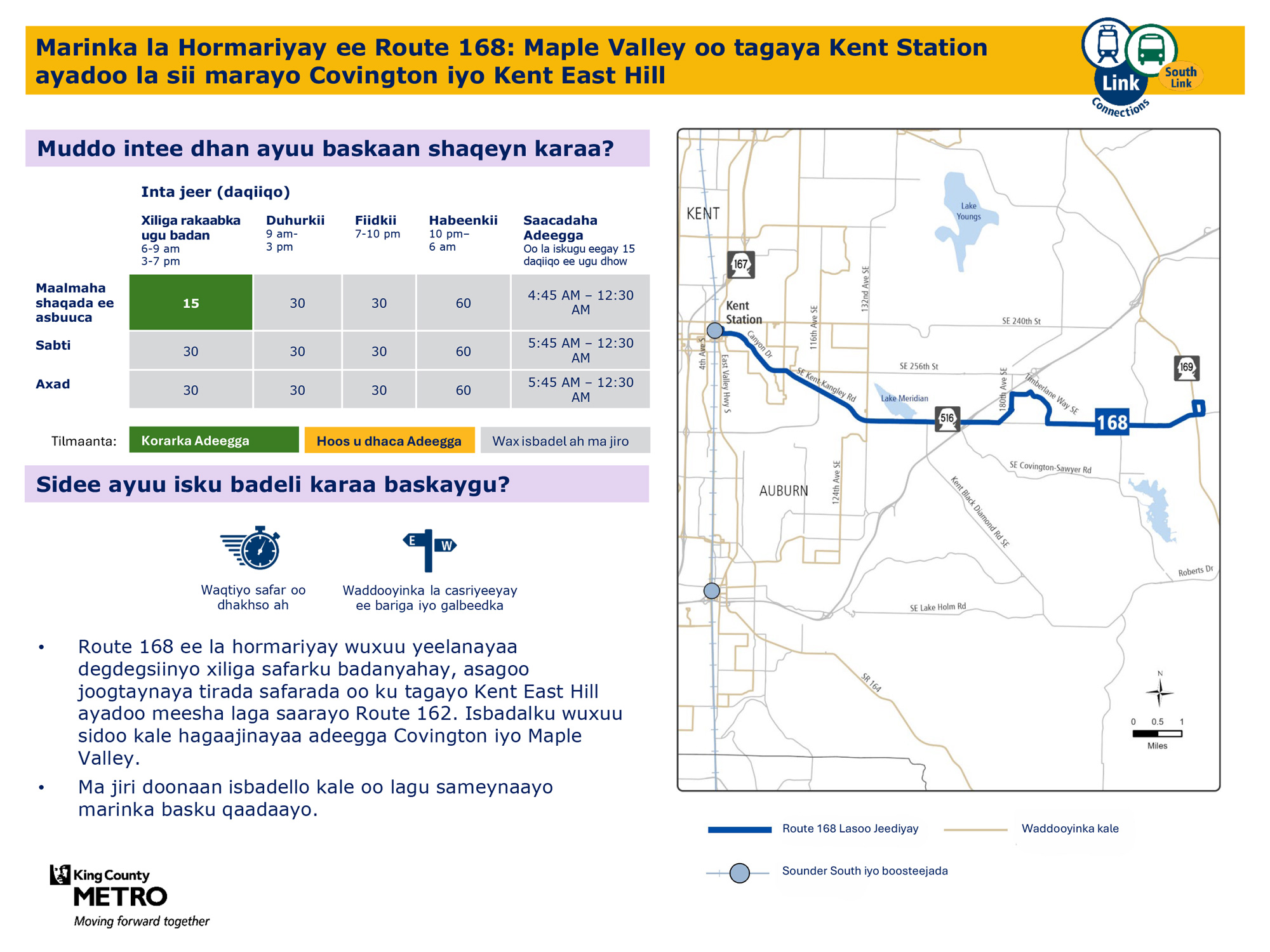 Wado cusub oo joogto ah oo leh safaro badan maalin kasta todobaadka. Waxay badalaysaa qayb kamid ah Wadada 165. Waxay kaga xirtaa tareenka fudud ee Link barta Kent Des Moines Station. Safarada qaar waxay noqonayaan Wadada 166 safarada rakaabka u socdaalaya goobo ka baxsan Kent Des Moines Station.