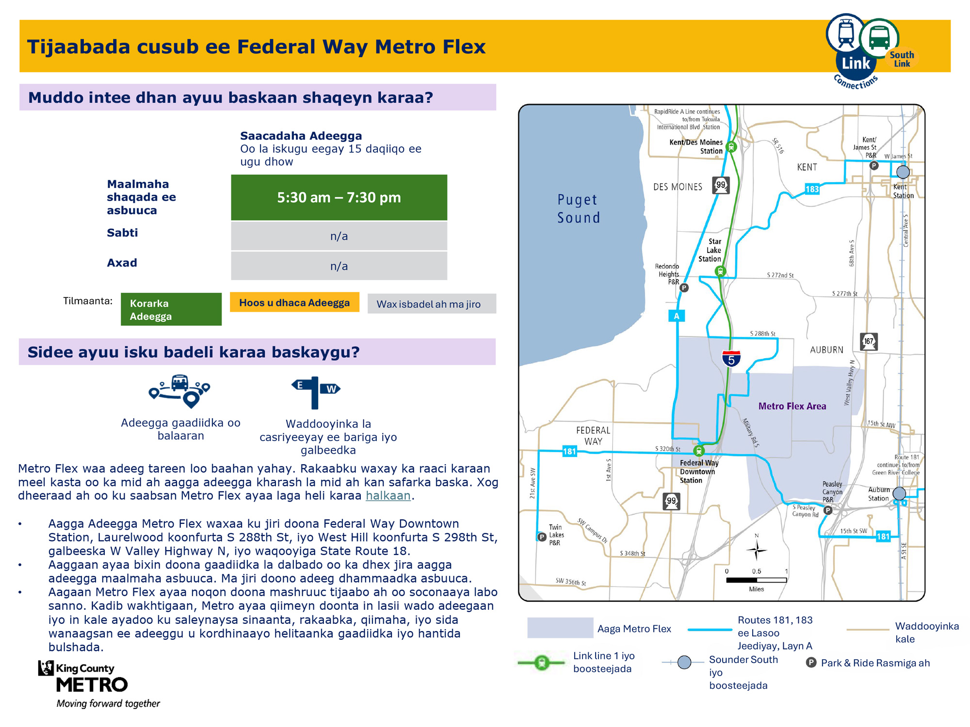 Goobta cusub ee Metro Flex ee tijaabada ah bixinta adeega la helo marka loo baahdo ee Isniinta ilaa Jimcaha. U adeega Federal Way Downtown Station, Laurelwood ee koonfurta S 288th St iyo West Hill ee koonfurta S 298th St, west of W Valley Highway N, iyo waqooyiga State Route 18.