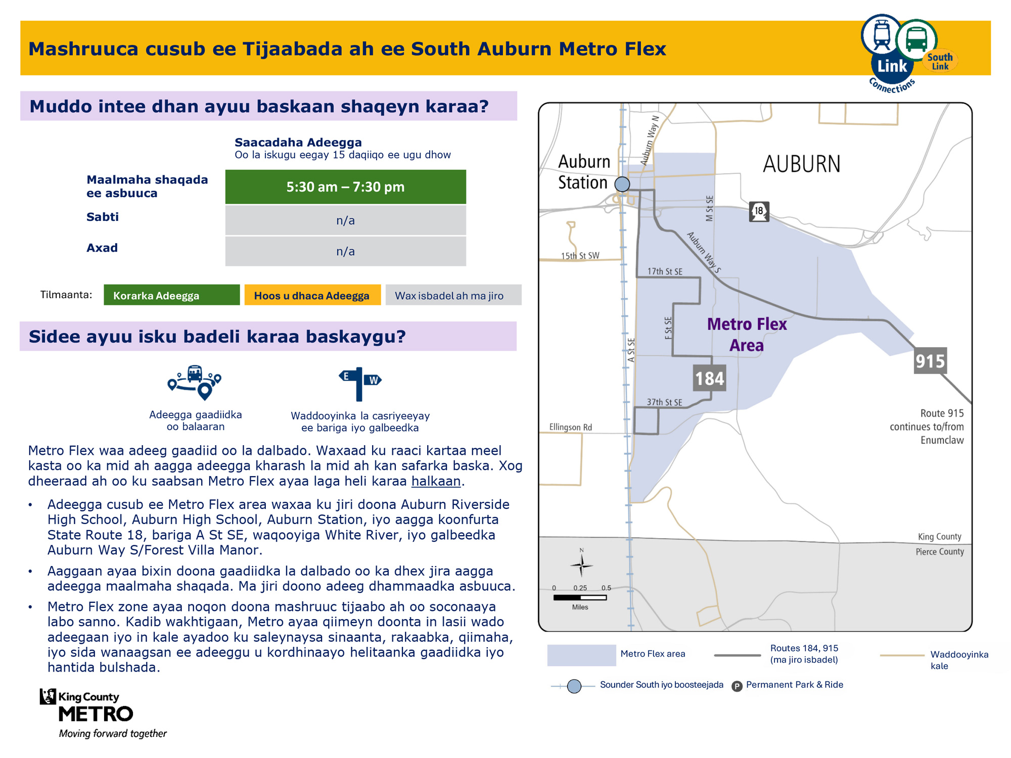 Goobta cusub ee Metro Flex ee tijaabada ah bixinta adeega la helo marka loo baahdo ee Isniinta ilaa Jimcaha. U adeega goobaha koonfureed ee State Route 18, ee bariga A Street SE, waqooyiga ee White River iyo galbeedka Auburn Way S/Forest Villa Manor. Waxaa kamid ah Auburn Station iyo Riverside High School.