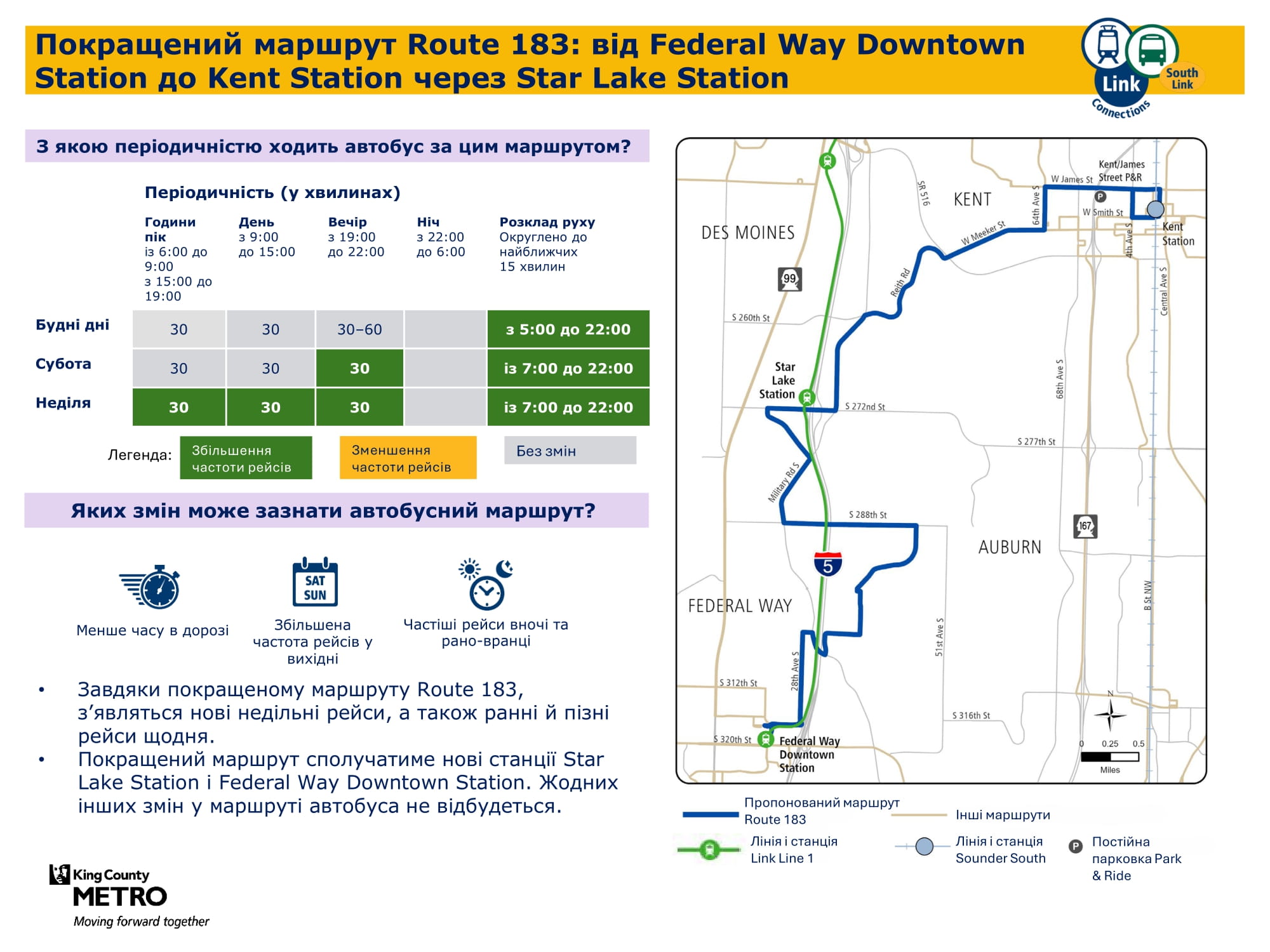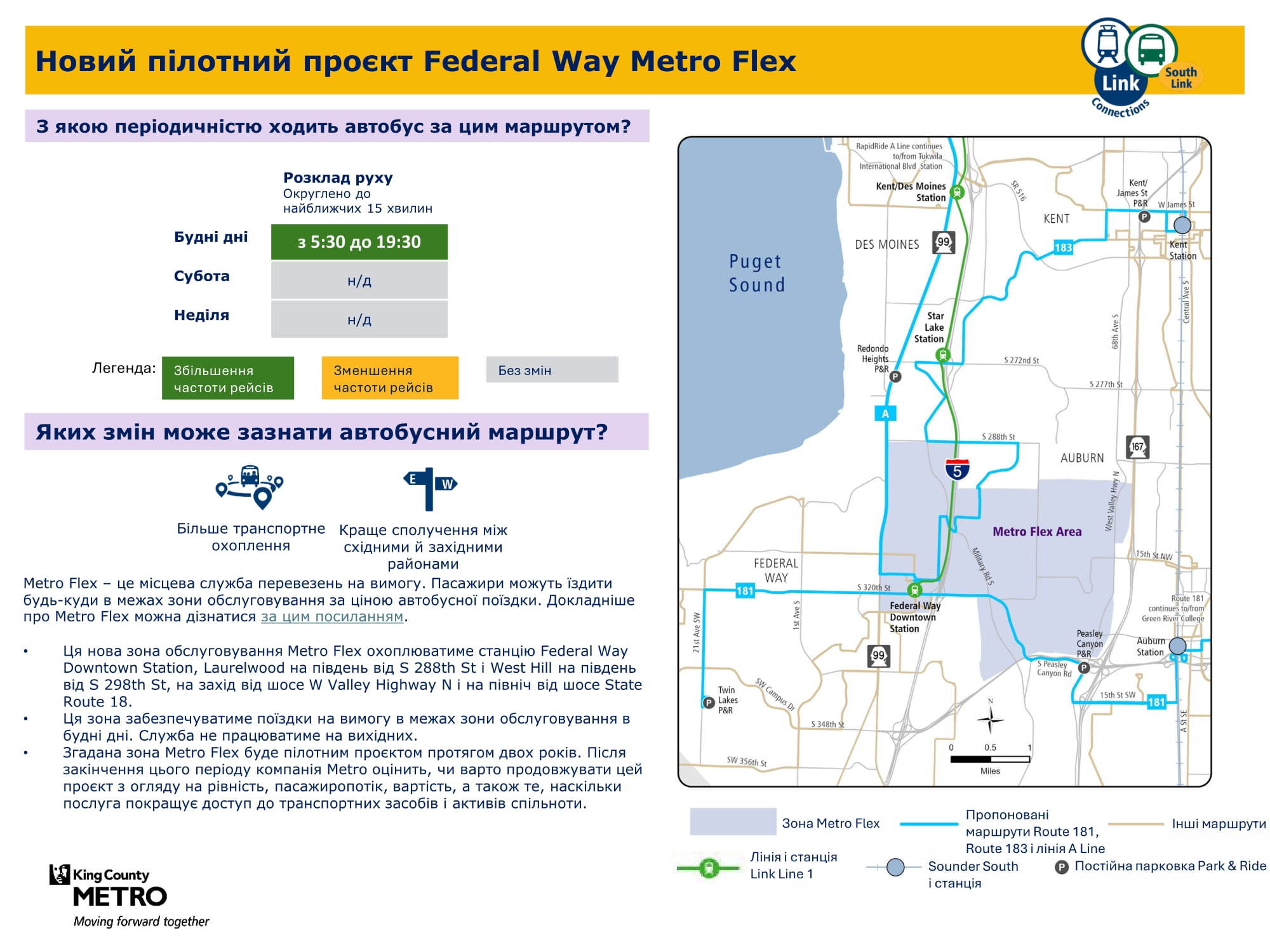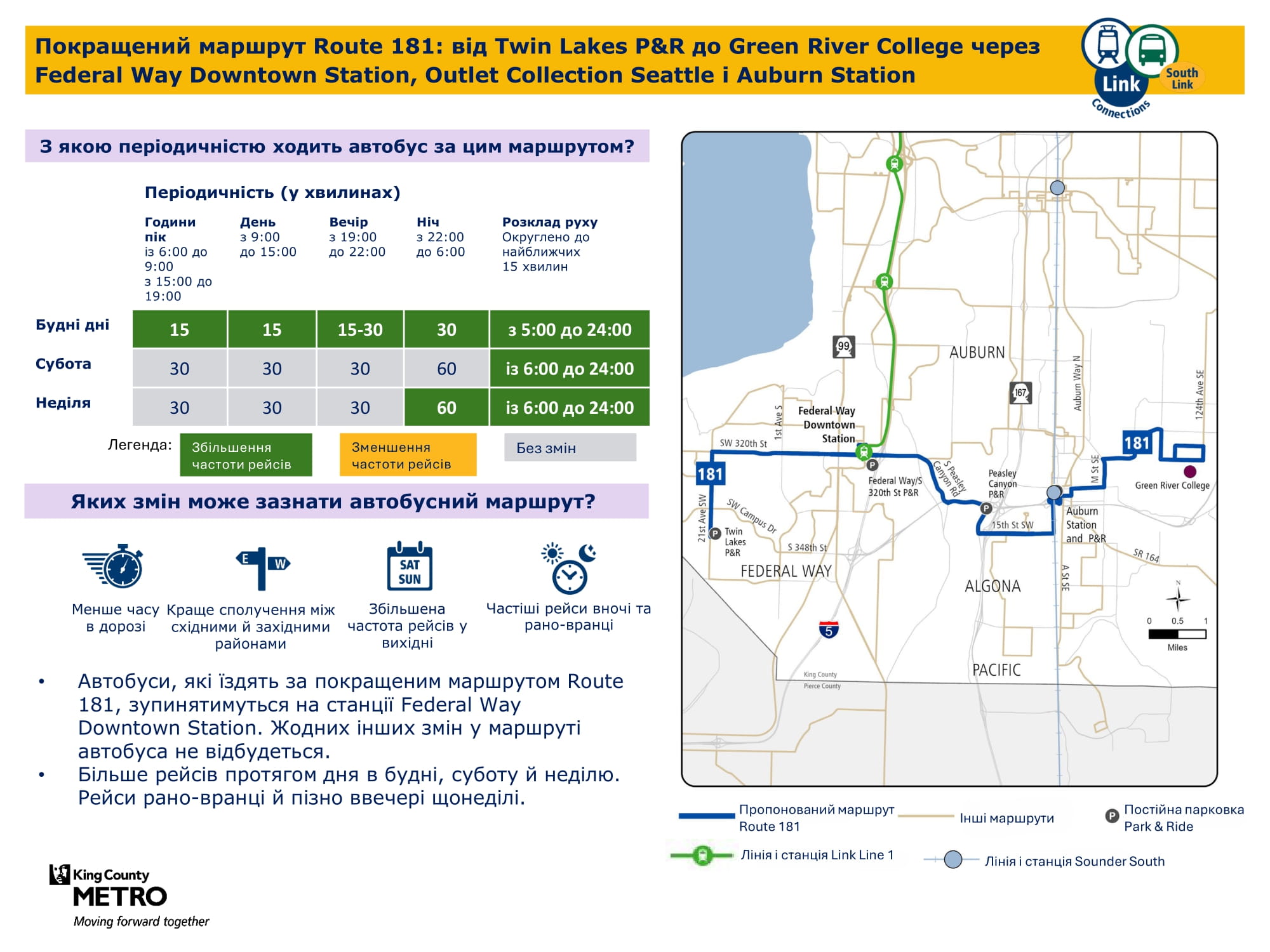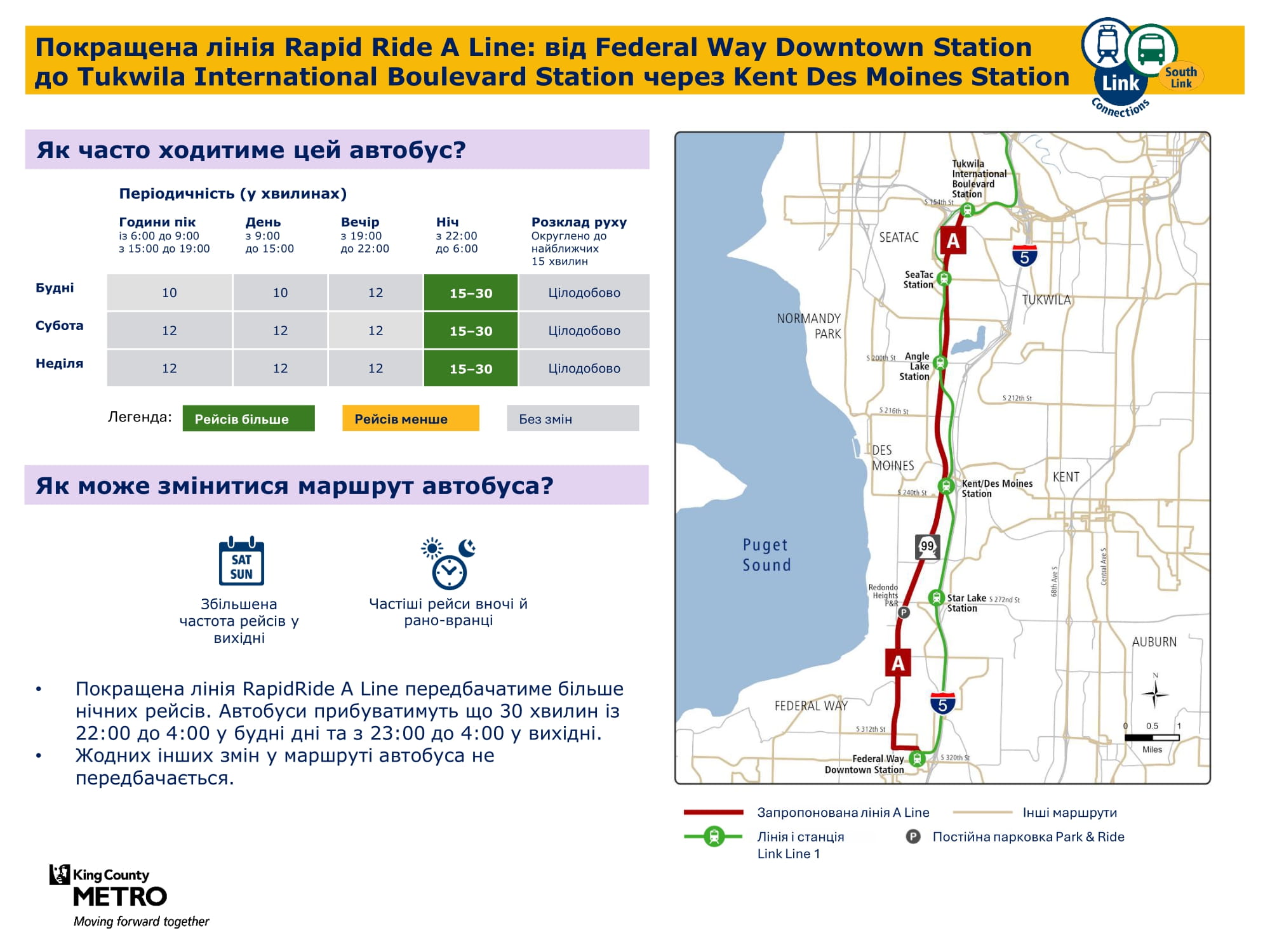 Federal Way Downtown і Kent Des Moines. Надалі забезпечуватиме