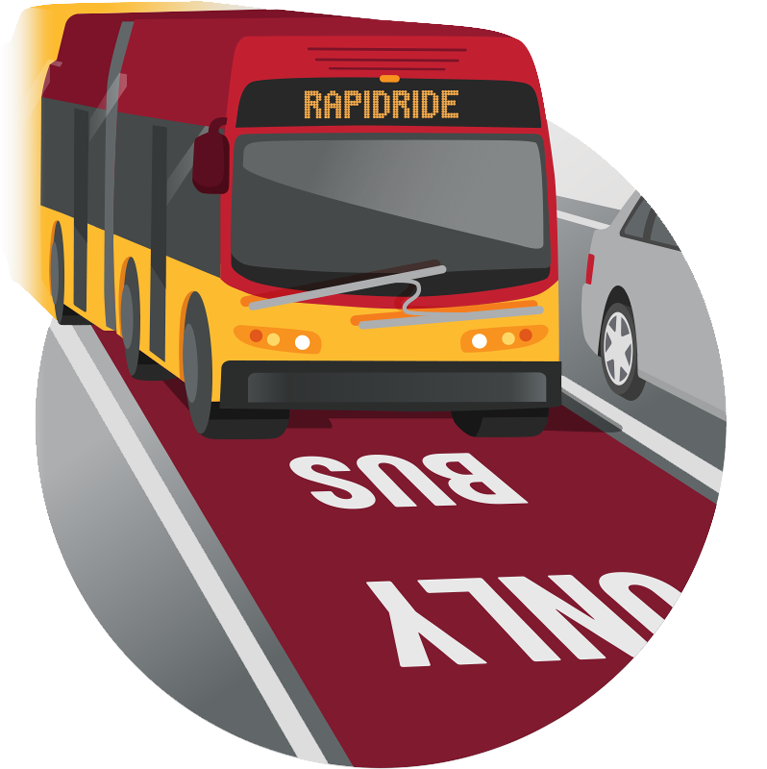 In many areas, RapidRide travels in red “bus only” lanes, with special traffic lights timed for faster service.